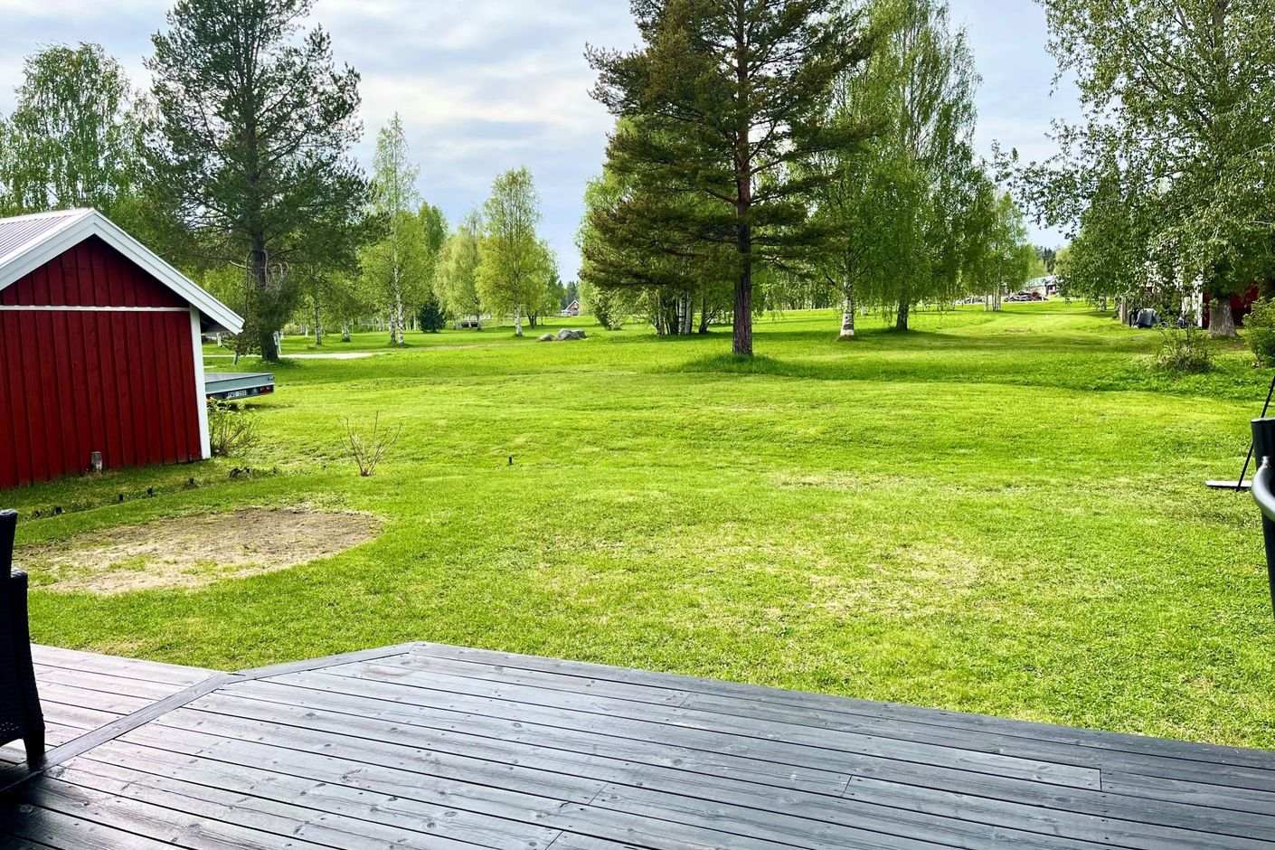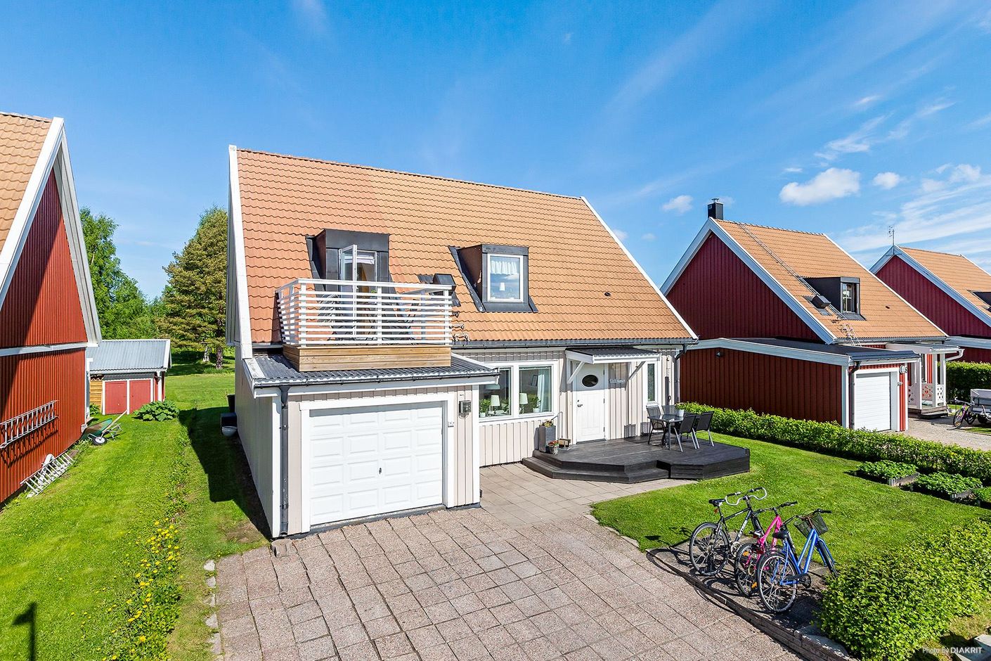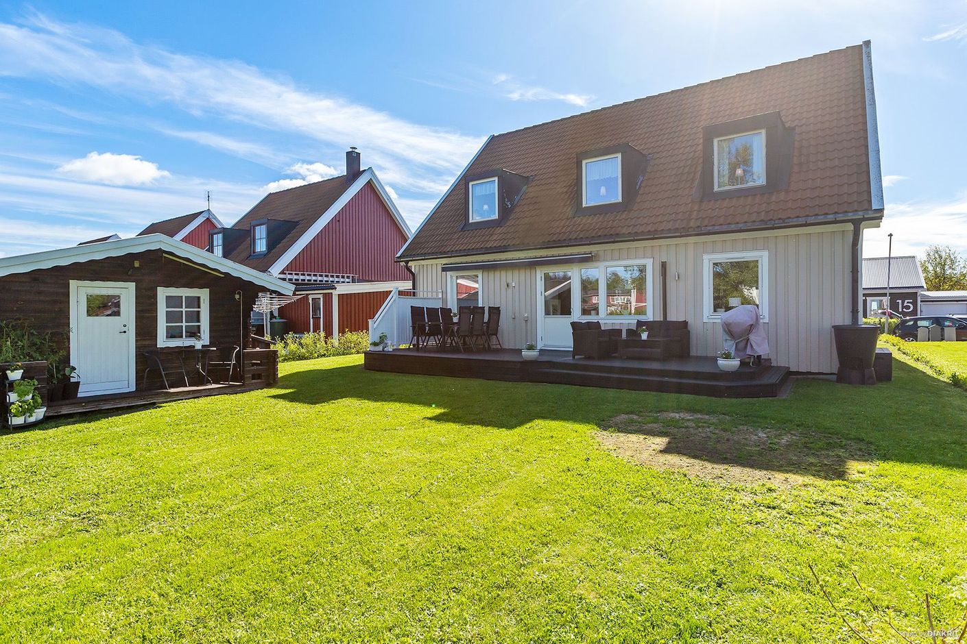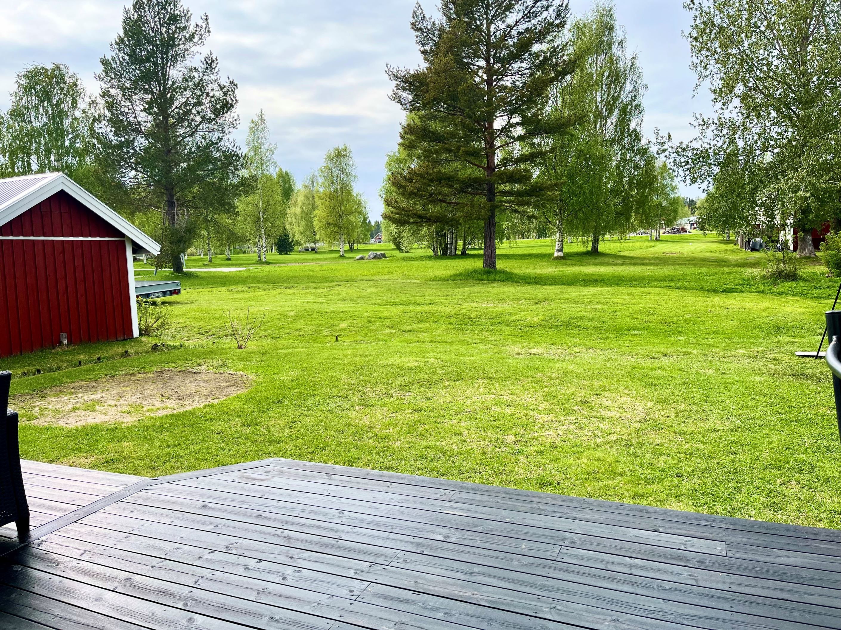 Den trevliga trädgårdstomten har ett perfekt solläge och vetter mot en stor allmänning/äng. På tomten finns en friggebod och ett rymligt garage. Altan på både fram och baksida.