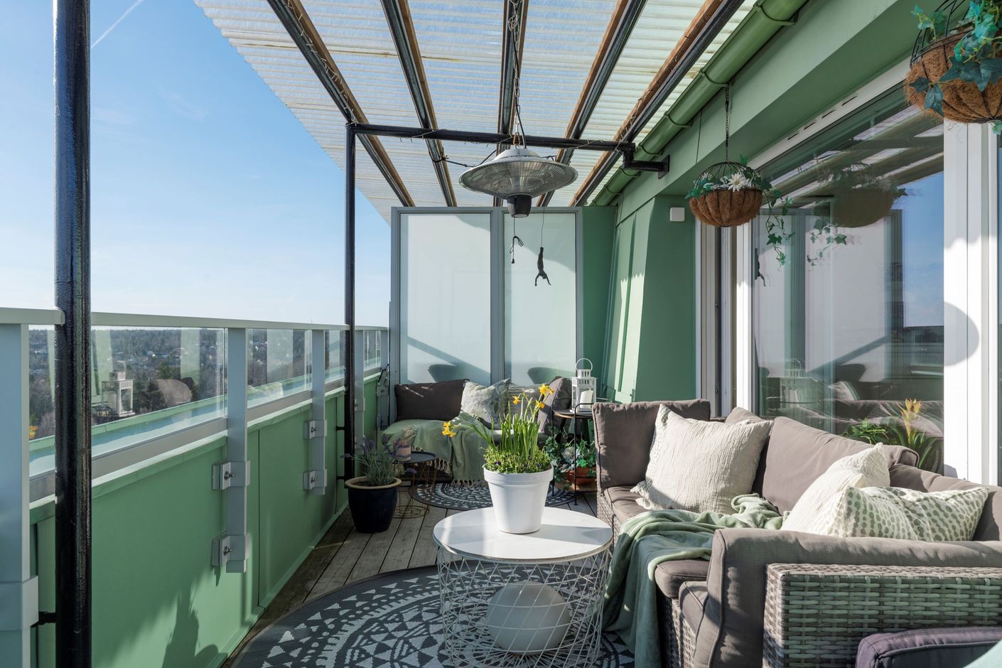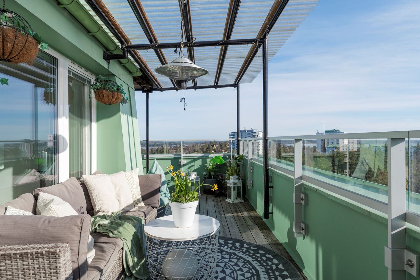 Med terrass i vinkel i öst- och söderläge samt balkong i österläge bjuds du på solens första strålar och ett ljusflöde som följer dig genom hela dagen. Från terrassen breder en hänförande panoramavy ut sig – här ser du Stockholms siluett, Lidingö, Stora Värtan, Globen, Kaknästornet och mycket mer. En levande tavla som skiftar med årstiderna och förvandlas till ett glittrande ljusspel när kvällen faller.