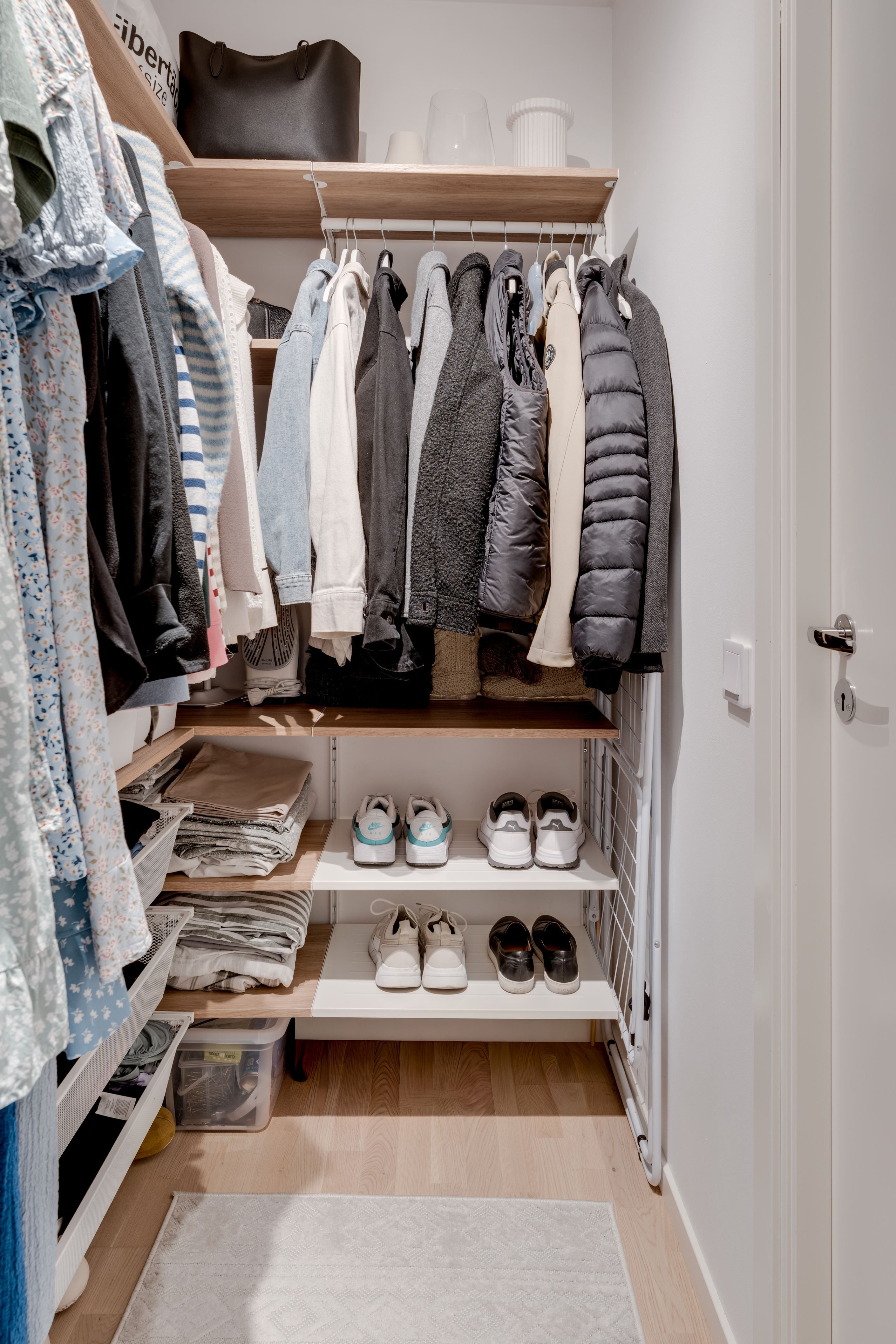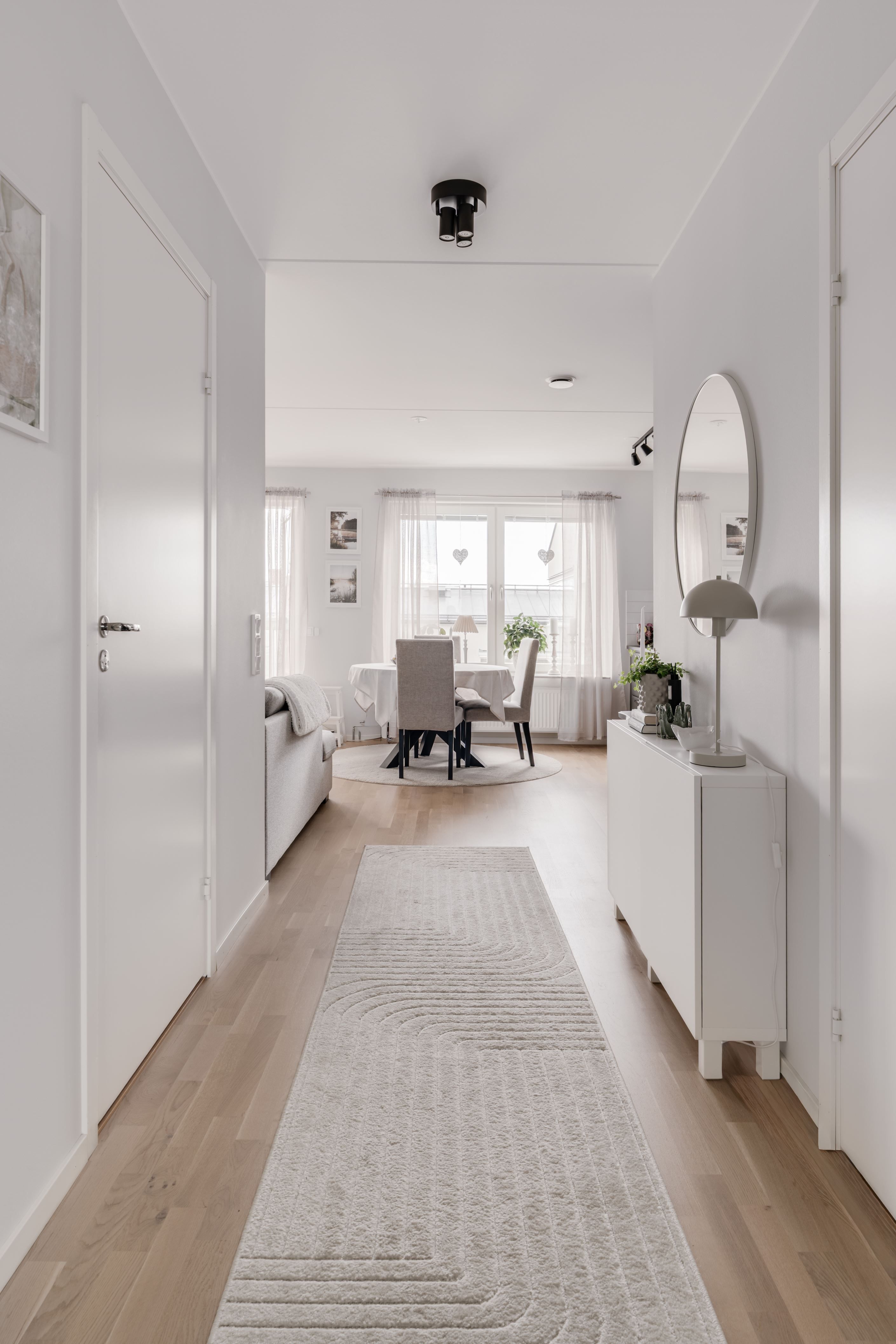 Redan i den rymliga hallen möts du av ett elegant parkettgolv och smarta förvaringslösningar i form av en generöst inredd klädkammare. Badrummet är helkaklat i stilren design och utrustat med golvvärme, duschhörna med vikbara väggar, tvättställ, WC samt både tvättmaskin och torktumlare – här är allt genomtänkt in i minsta detalj.