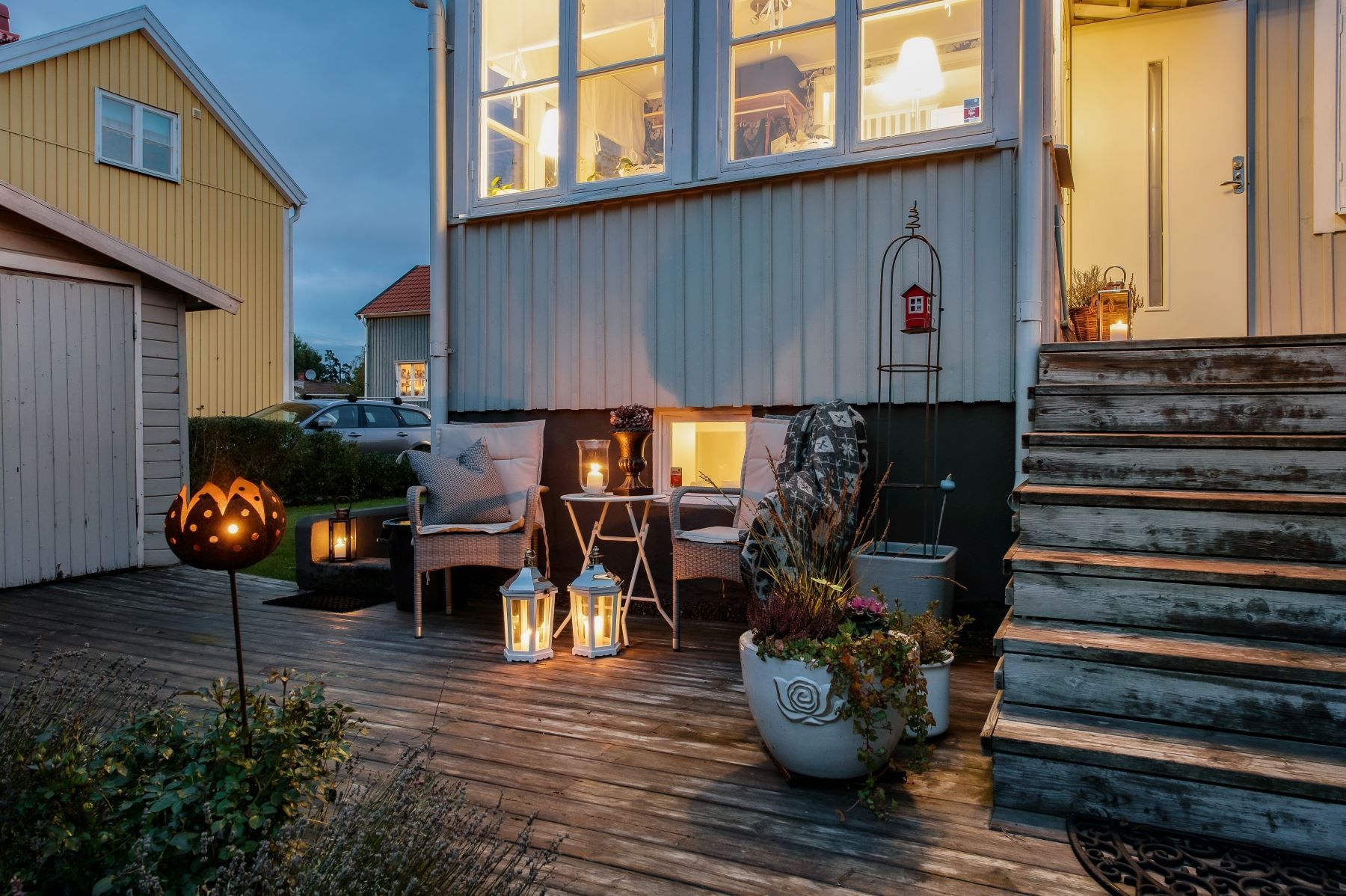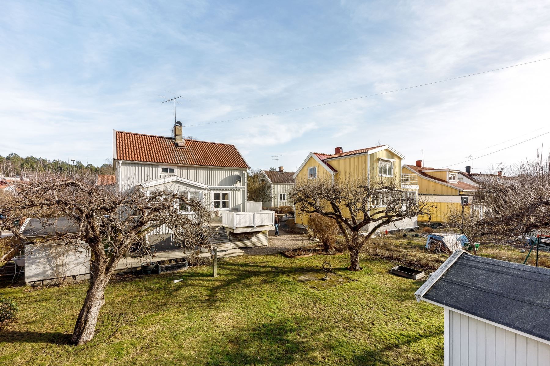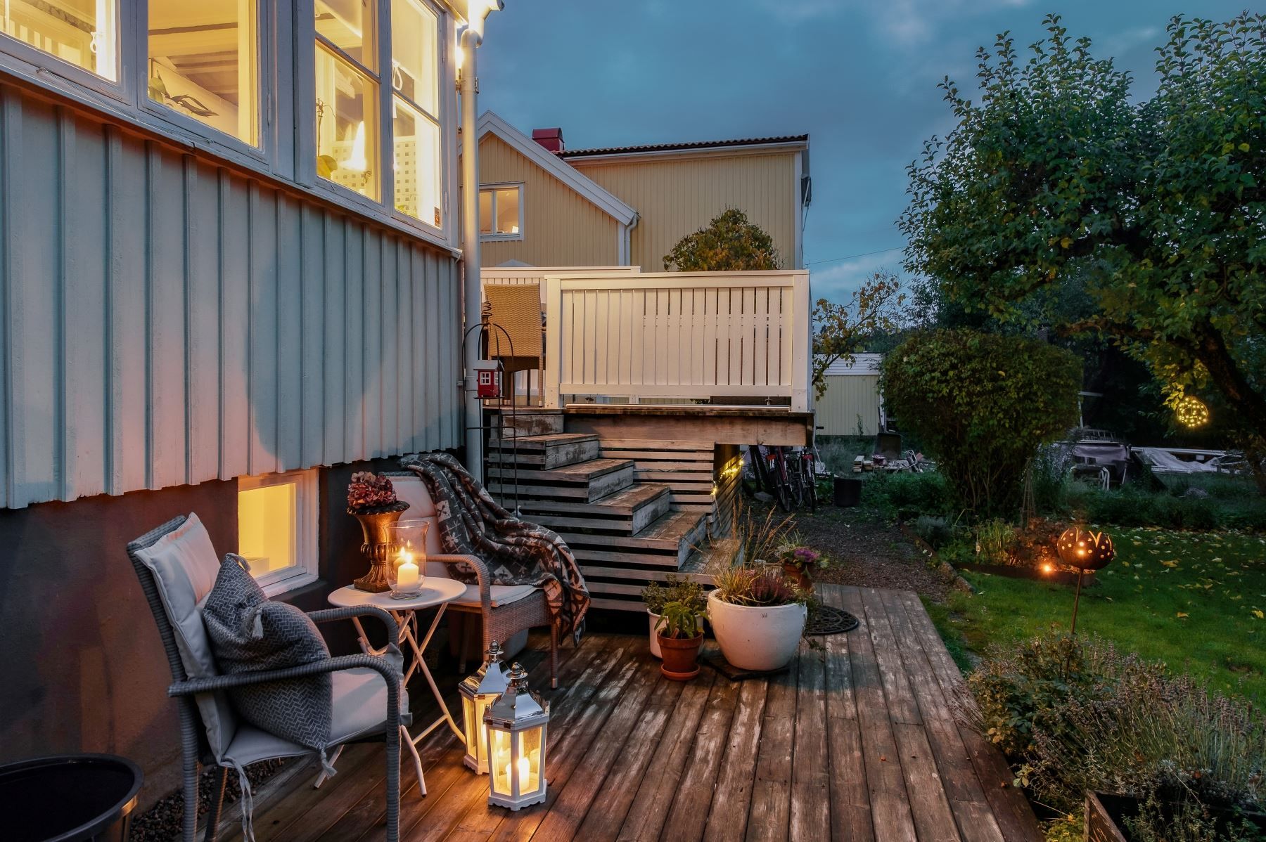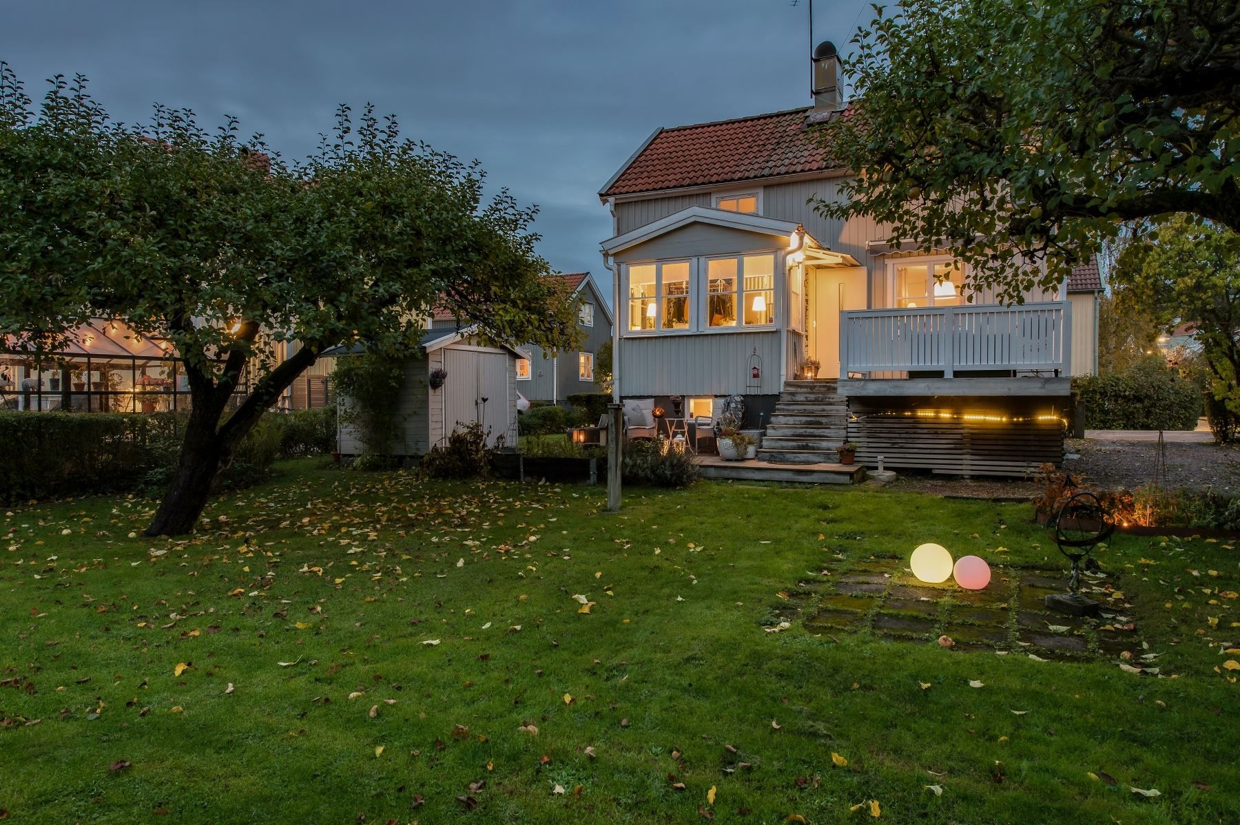 Trädgård i sydväst med äppelträd, en redskapsbod och en friggebod och träaltan att duka upp för mysiga middagar.