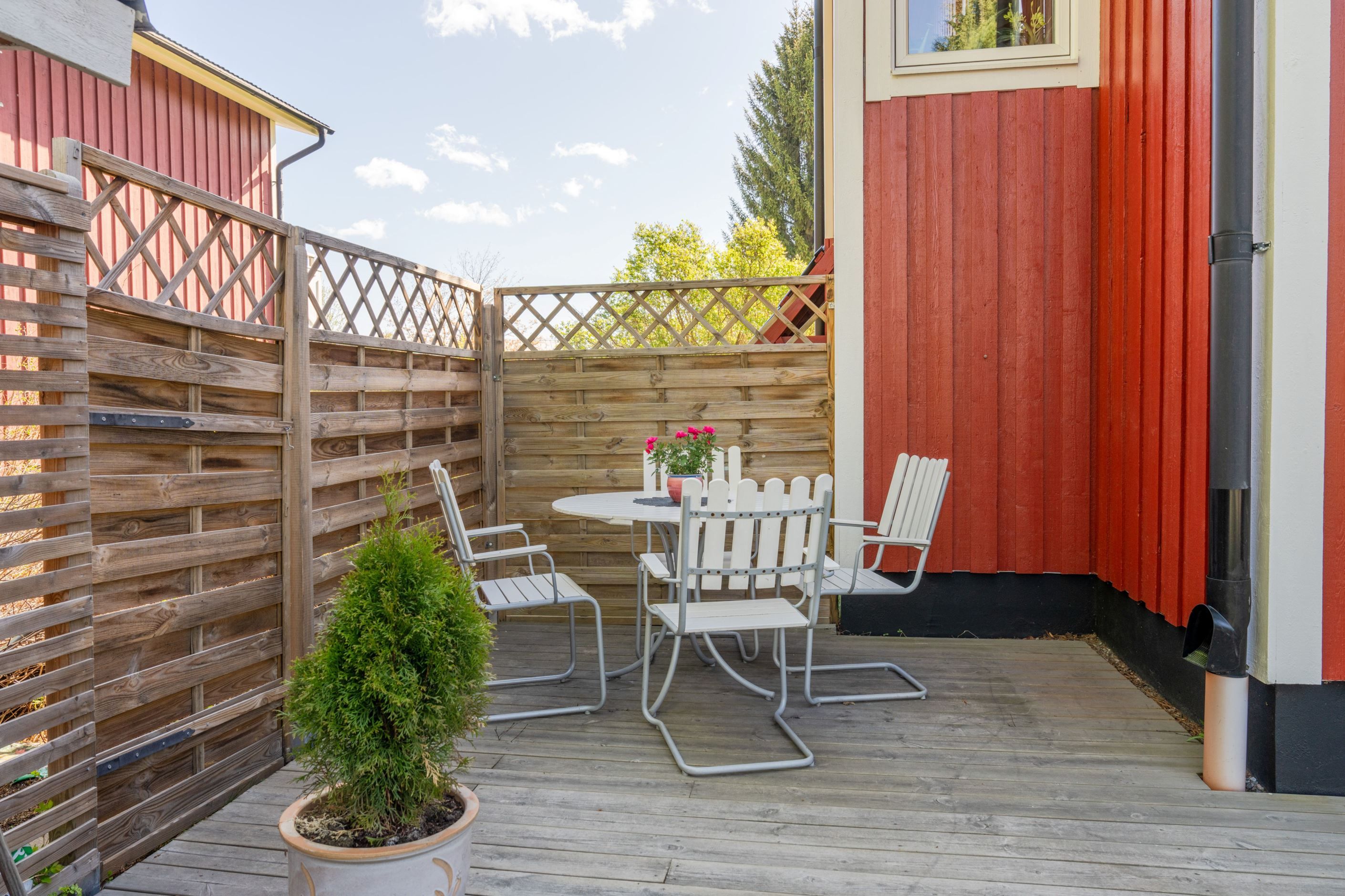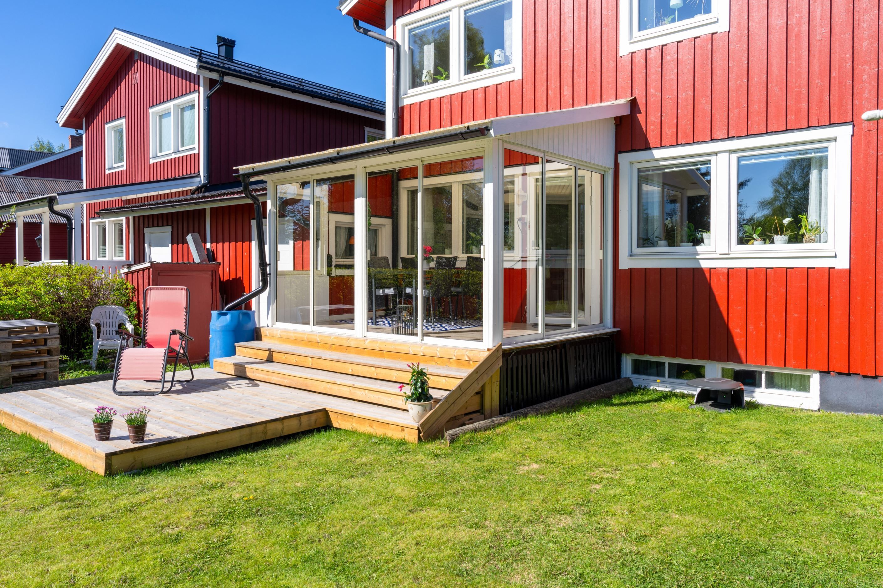 Detta hem erbjuder en lättskött tomt på fram-och baksida med en härlig uteplats i öster som nås via den härliga inglasningen.