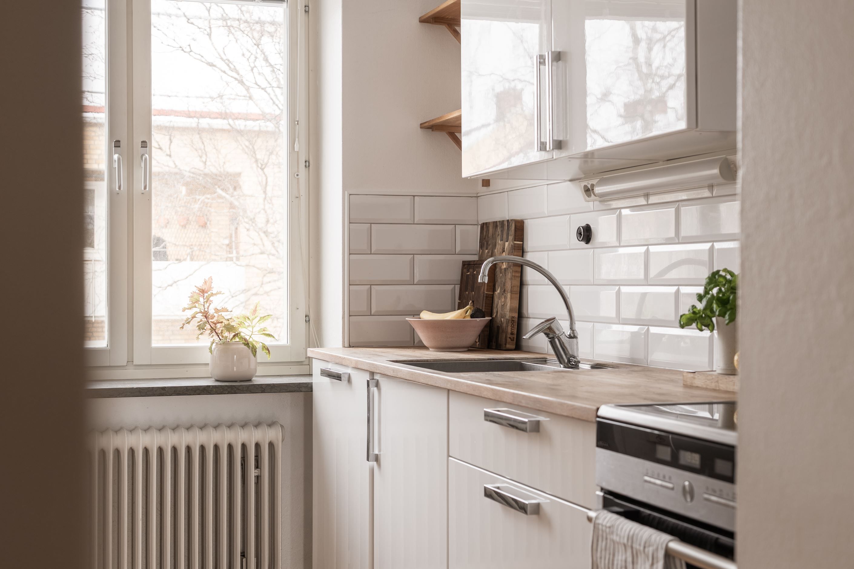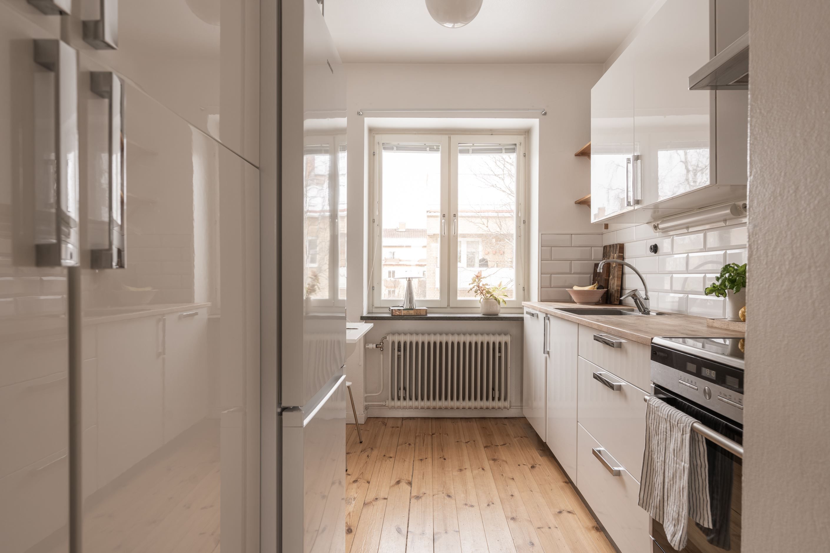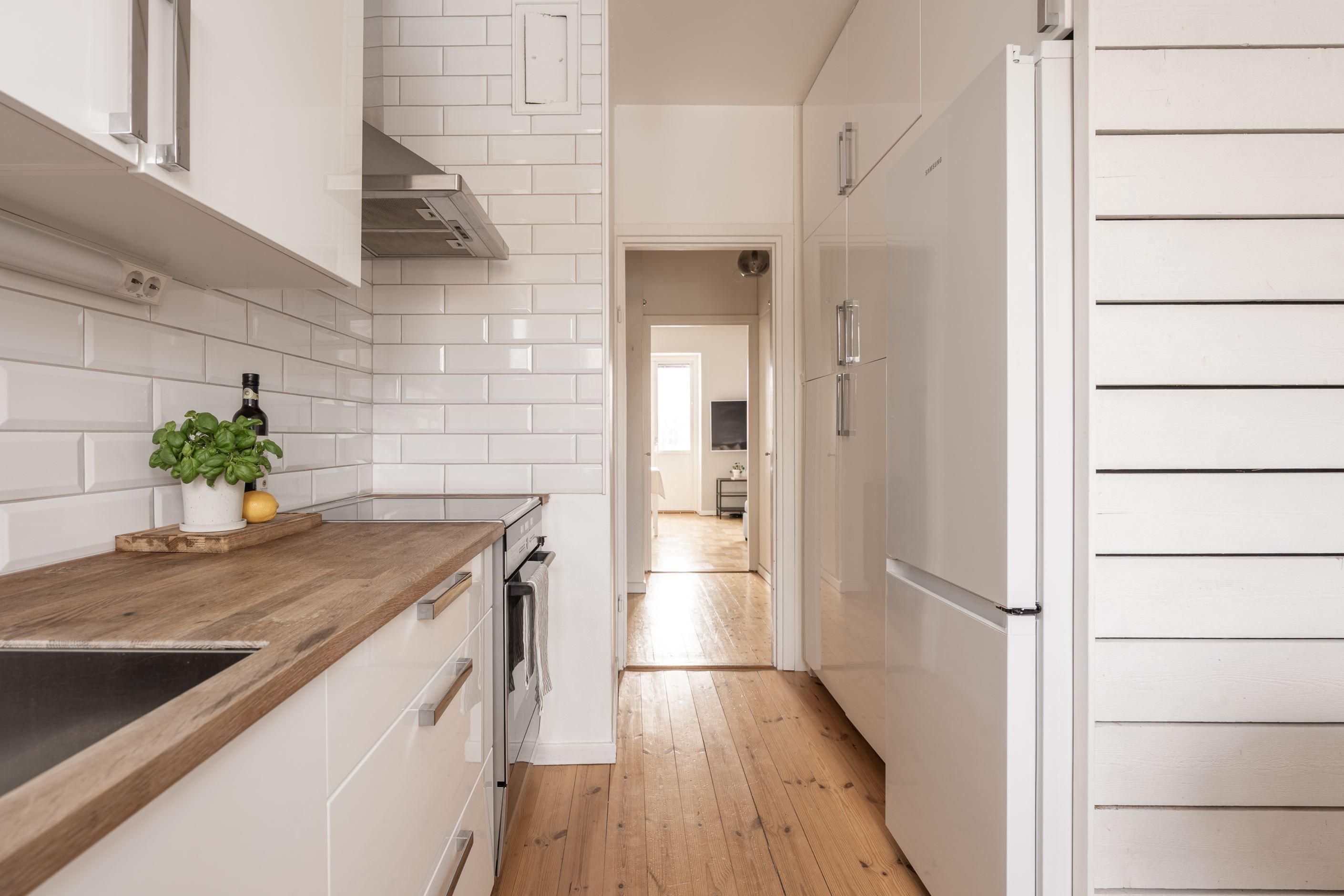 Redan i den generösa hallen infinner sig en välkomnande känsla. Här binds bostadens rum samman på ett naturligt sätt och det finns gott om plats för avhängning och förvaring. Köket är smakfullt inrett i klassiskt vitt med tidlösa detaljer, komplett maskinpark och bra arbetsytor – en plats där det är lika enkelt att laga vardagsmiddagar som att bjuda in till trevliga middagskvällar. Diskmaskinen gör vardagen smidig och bekväm.