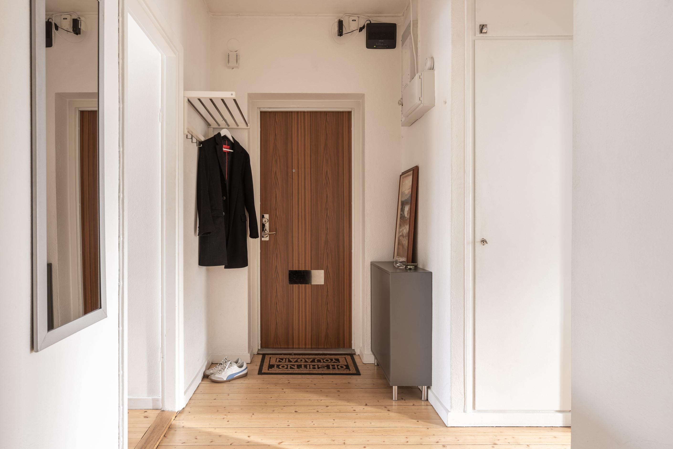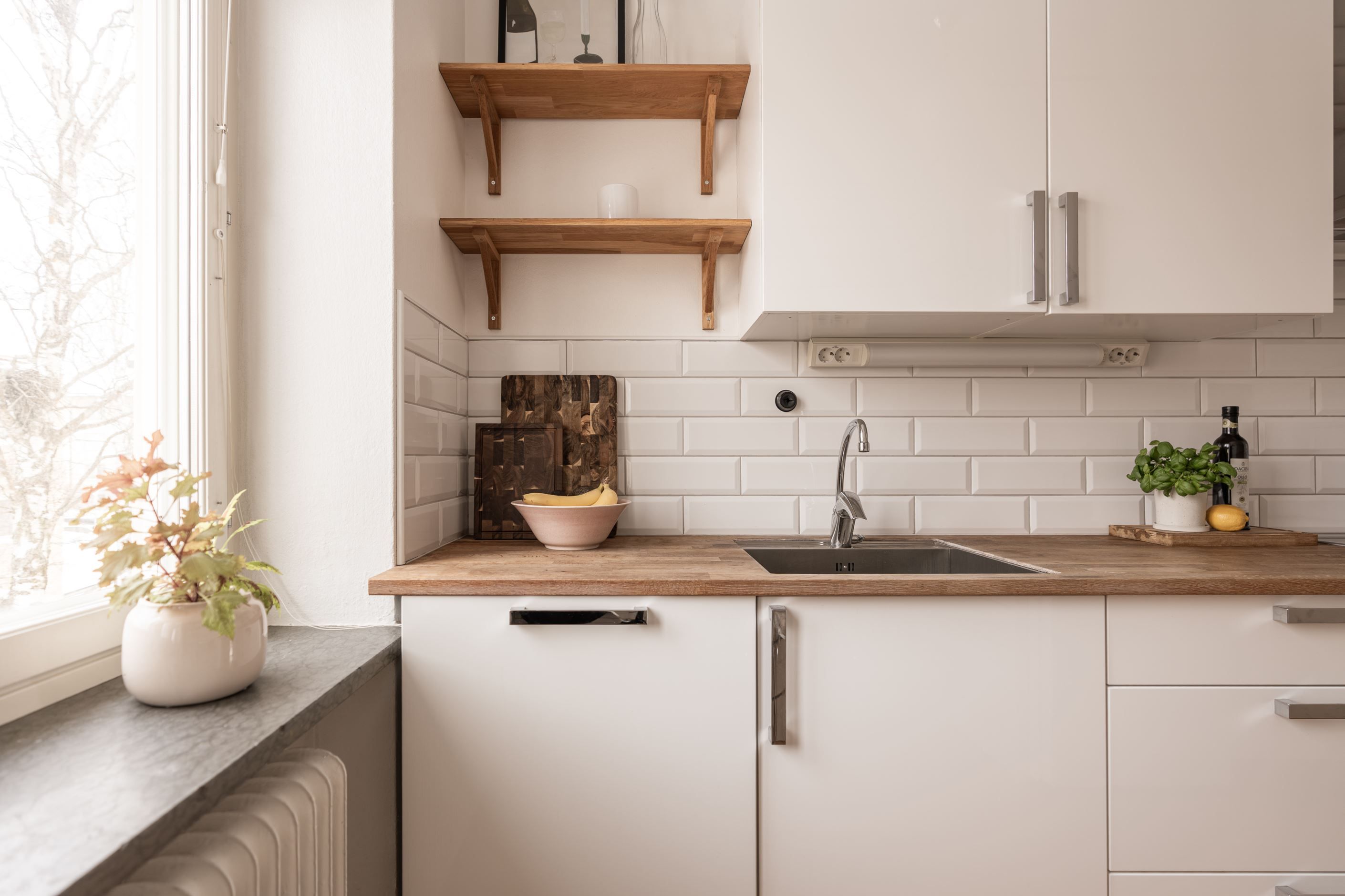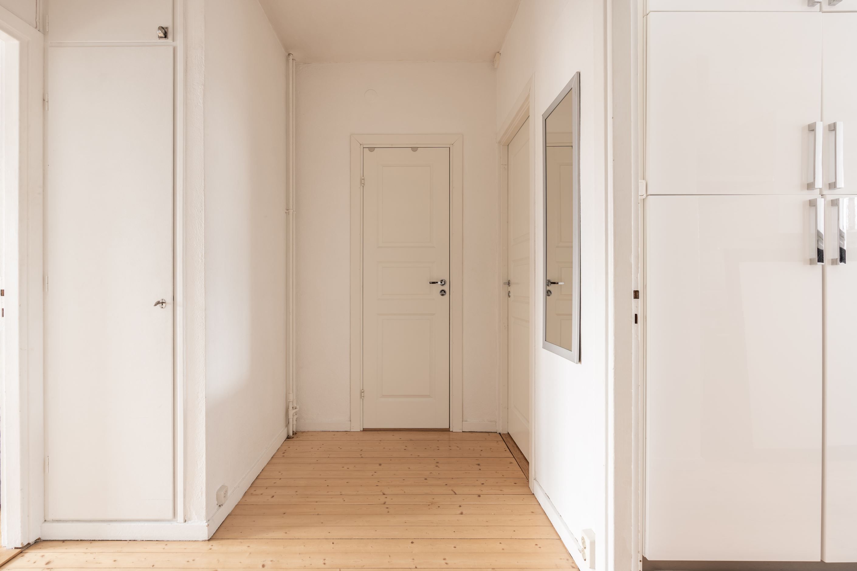 Redan i den generösa hallen infinner sig en välkomnande känsla. Här binds bostadens rum samman på ett naturligt sätt och det finns gott om plats för avhängning och förvaring. Köket är smakfullt inrett i klassiskt vitt med tidlösa detaljer, komplett maskinpark och bra arbetsytor – en plats där det är lika enkelt att laga vardagsmiddagar som att bjuda in till trevliga middagskvällar. Diskmaskinen gör vardagen smidig och bekväm.
