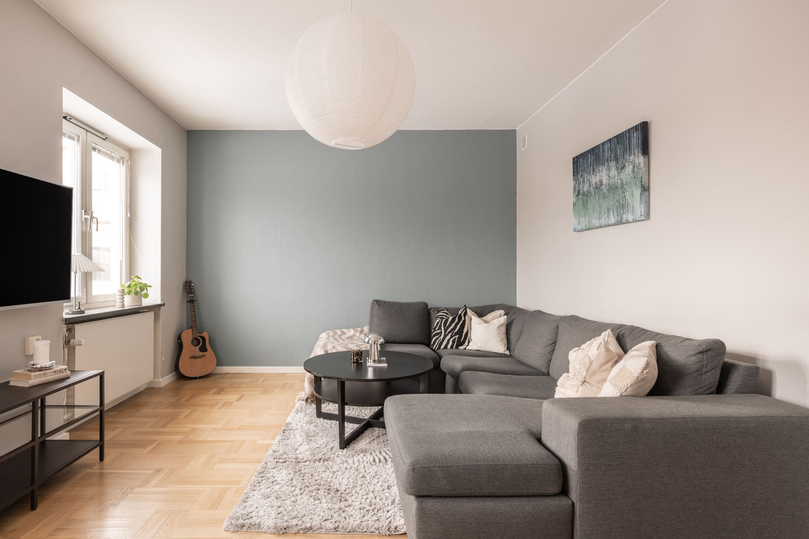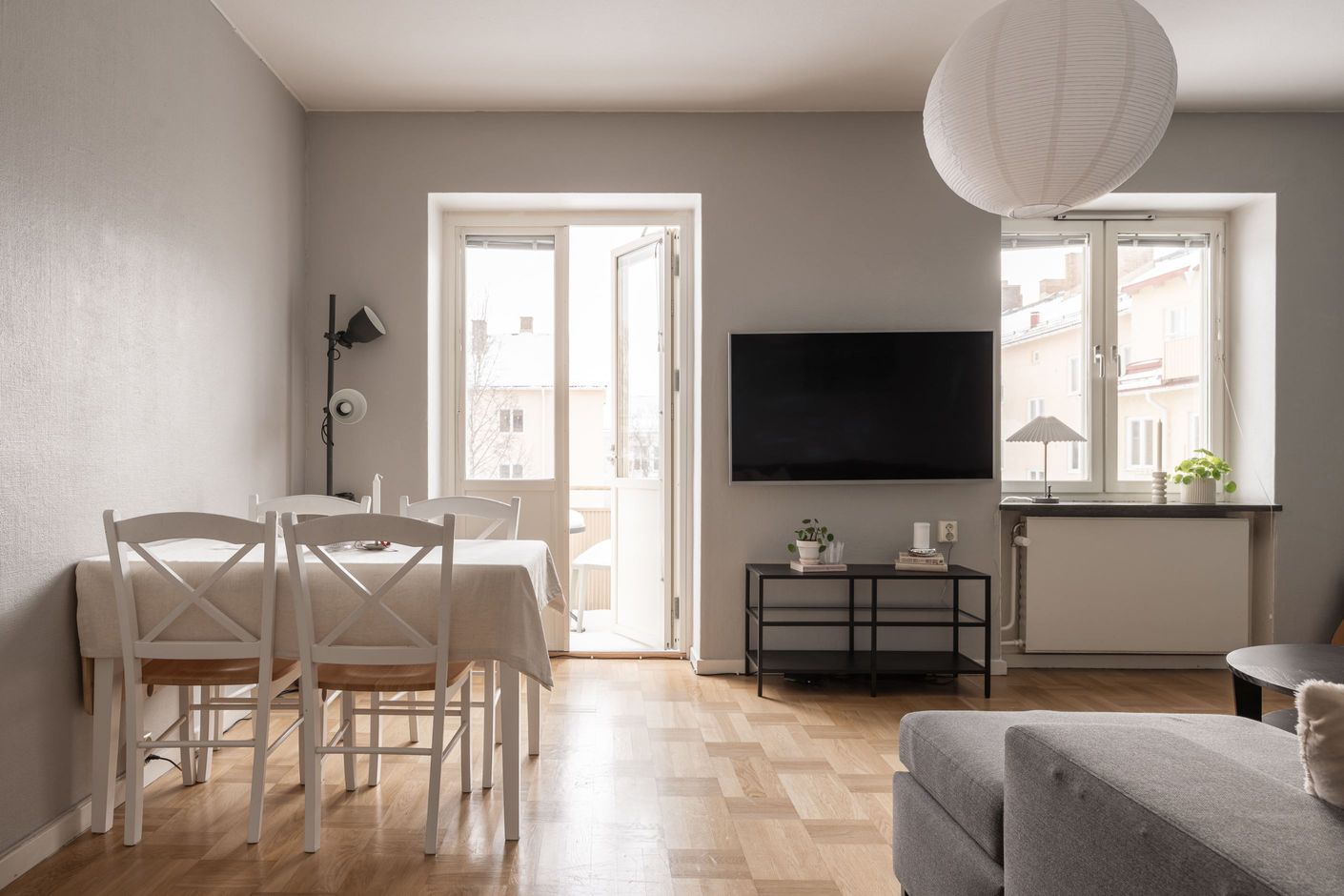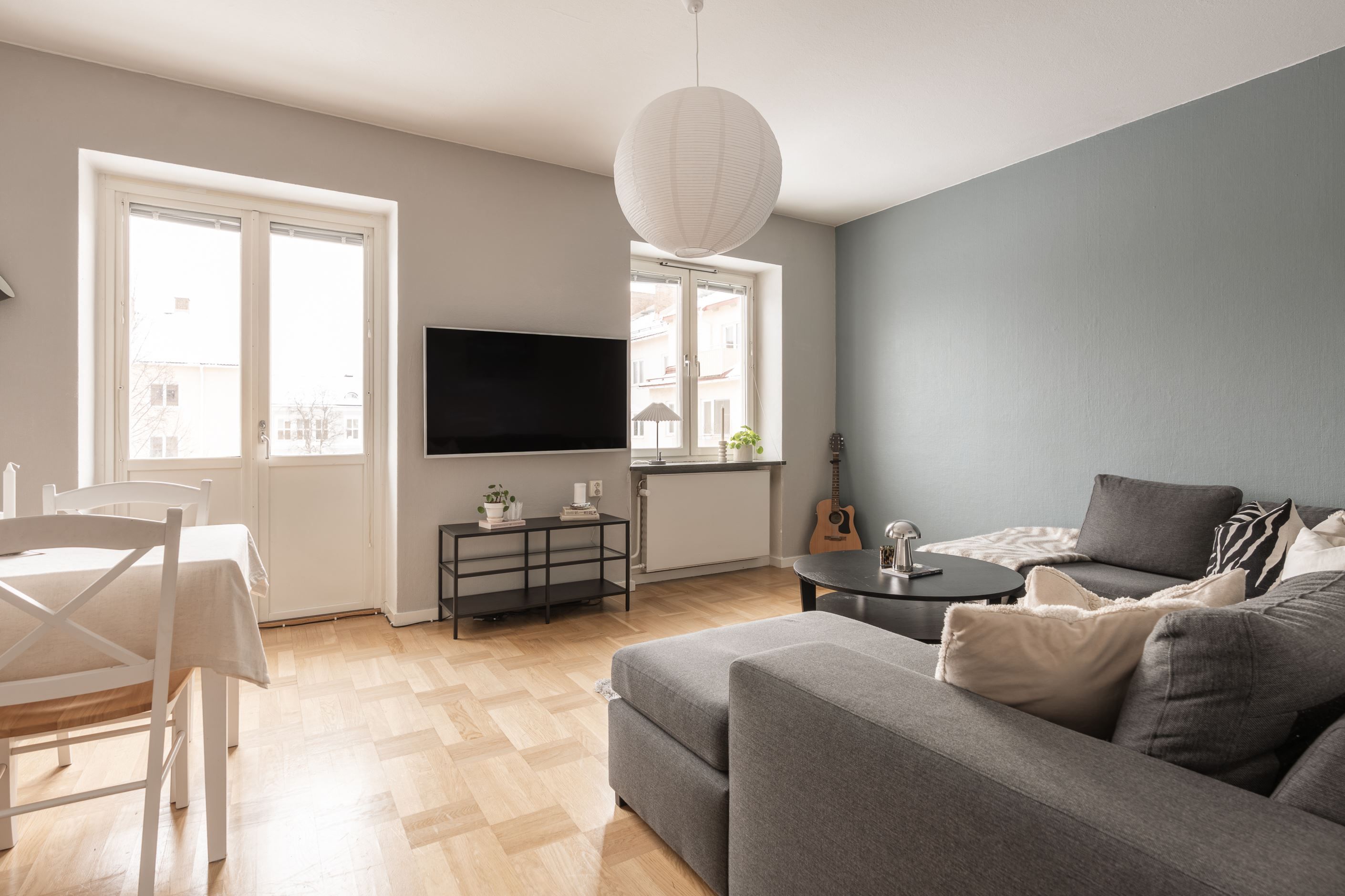 Vardagsrummet är ljust och luftigt med plats för både soffhörna och matgrupp. Härifrån kliver du ut på balkongen som ligger i ett högt och soligt läge med rogivande utsikt över den gröna innergården – en perfekt plats för morgonkaffet eller en lugn stund i eftermiddagssolen.