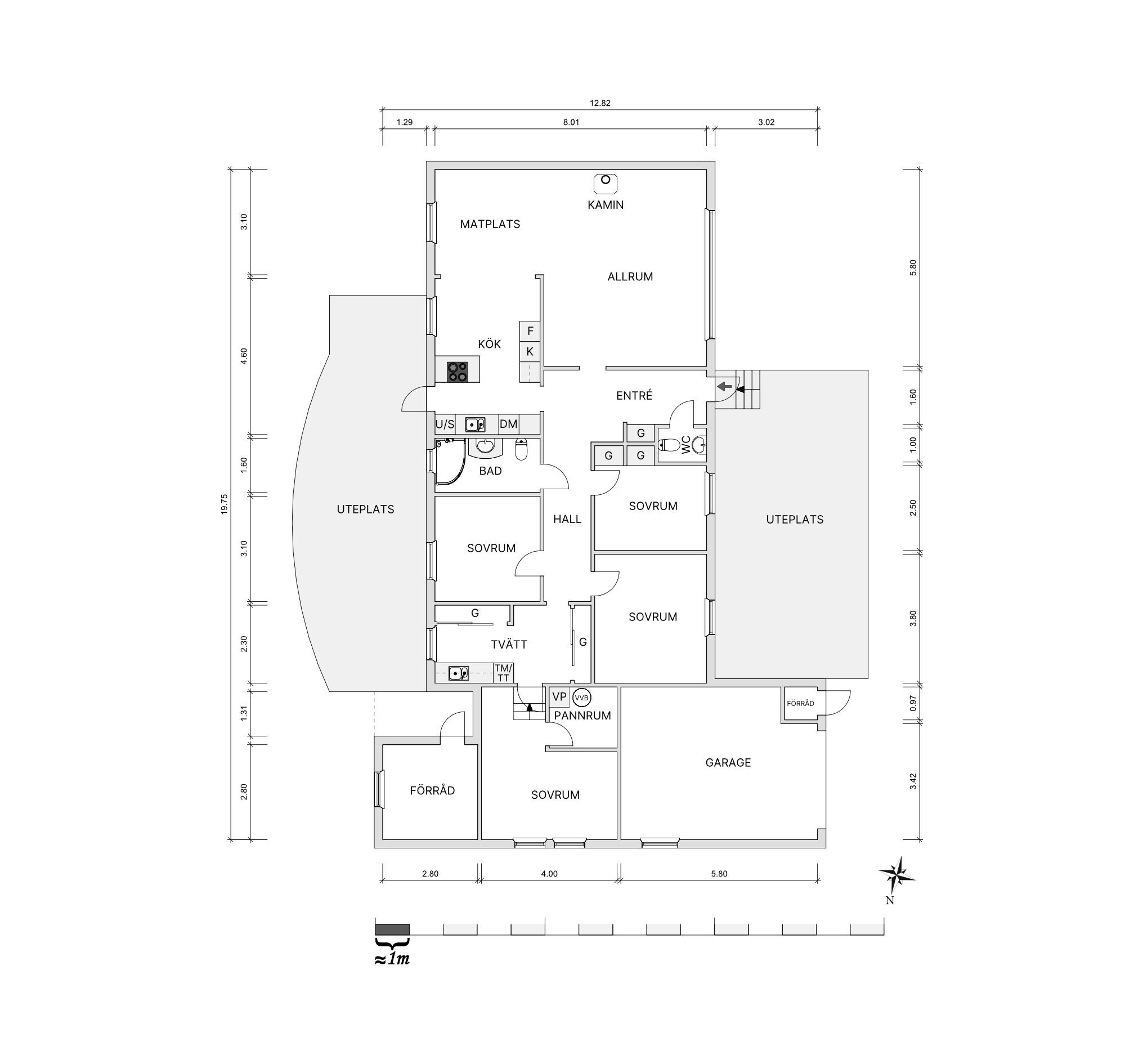Huset är en 1-plansvilla med fyra sovrum – gott om plats för både stora och små familjer. Det trevliga köket i ek från 2016 ligger öppet mot det ljusa vardagsrummet, där braskaminen och luft/luft-värmepumpen skapar skön värme under årets kyligare dagar. Från köket når du den stenlagda uteplatsen på baksidan – en perfekt plats för grillkvällar och umgänge.