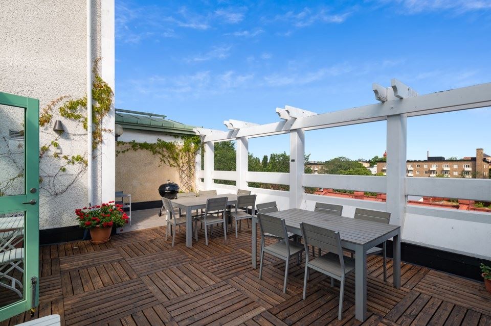 Trots lägenhetens yta upplevs den mycket rymlig tack vare den optimala planlösningen med ett generöst kök, välkomnande hall och ett funktionellt badrum. Känslan påminner nästan om ett litet radhus högst upp i huset – privat, ljust och med fin kontakt med himlen ovanför.