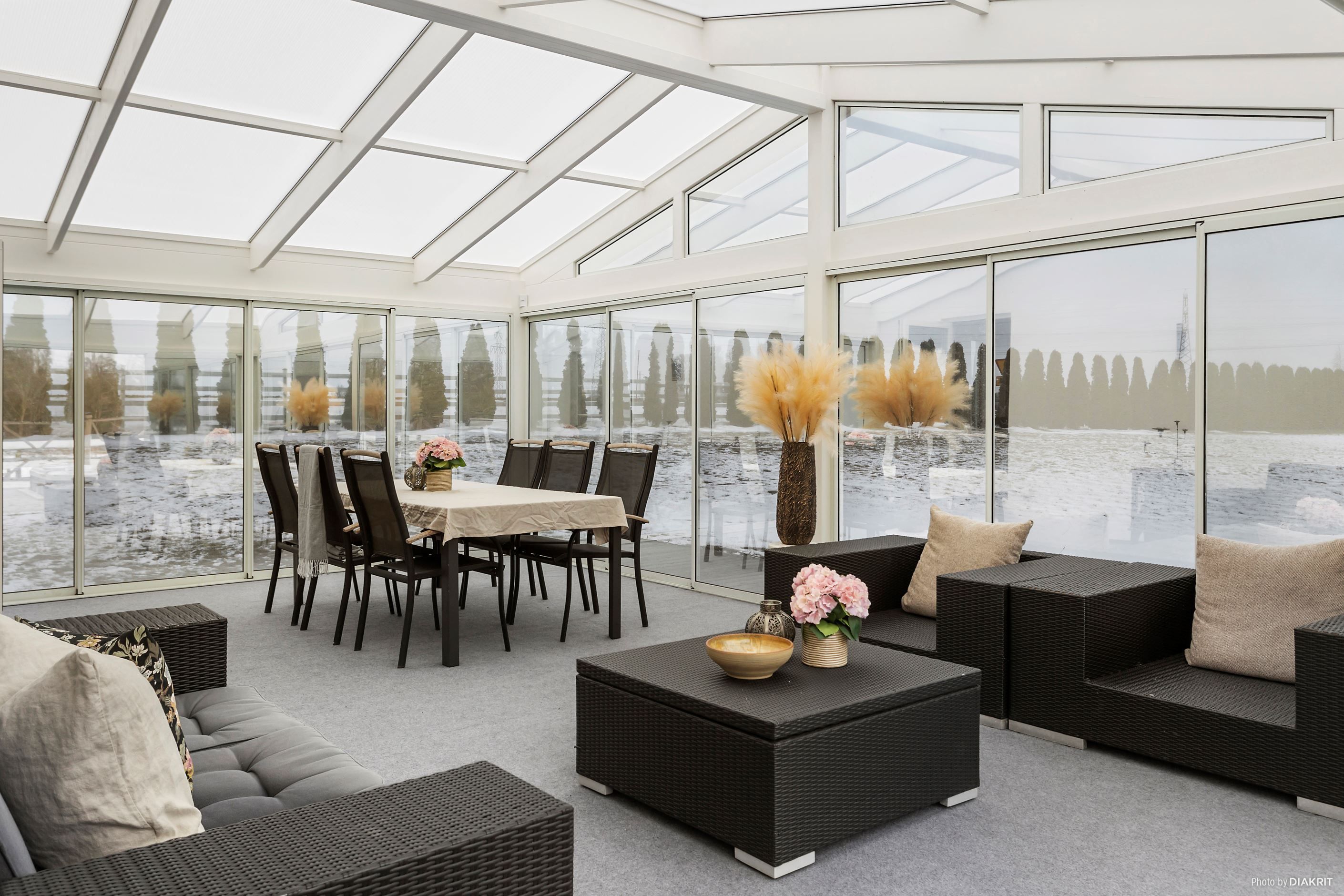 Vardagsrummet är en naturlig förlängning av matplatsen och präglas av stora fönsterpartier som ger ett generöst ljusinsläpp och en luftig atmosfär. Härifrån nås det väl tilltagna uterummet med härligt ljusinsläpp och en självklar förlängning av bostaden som kan nyttjas under stora delar av året.