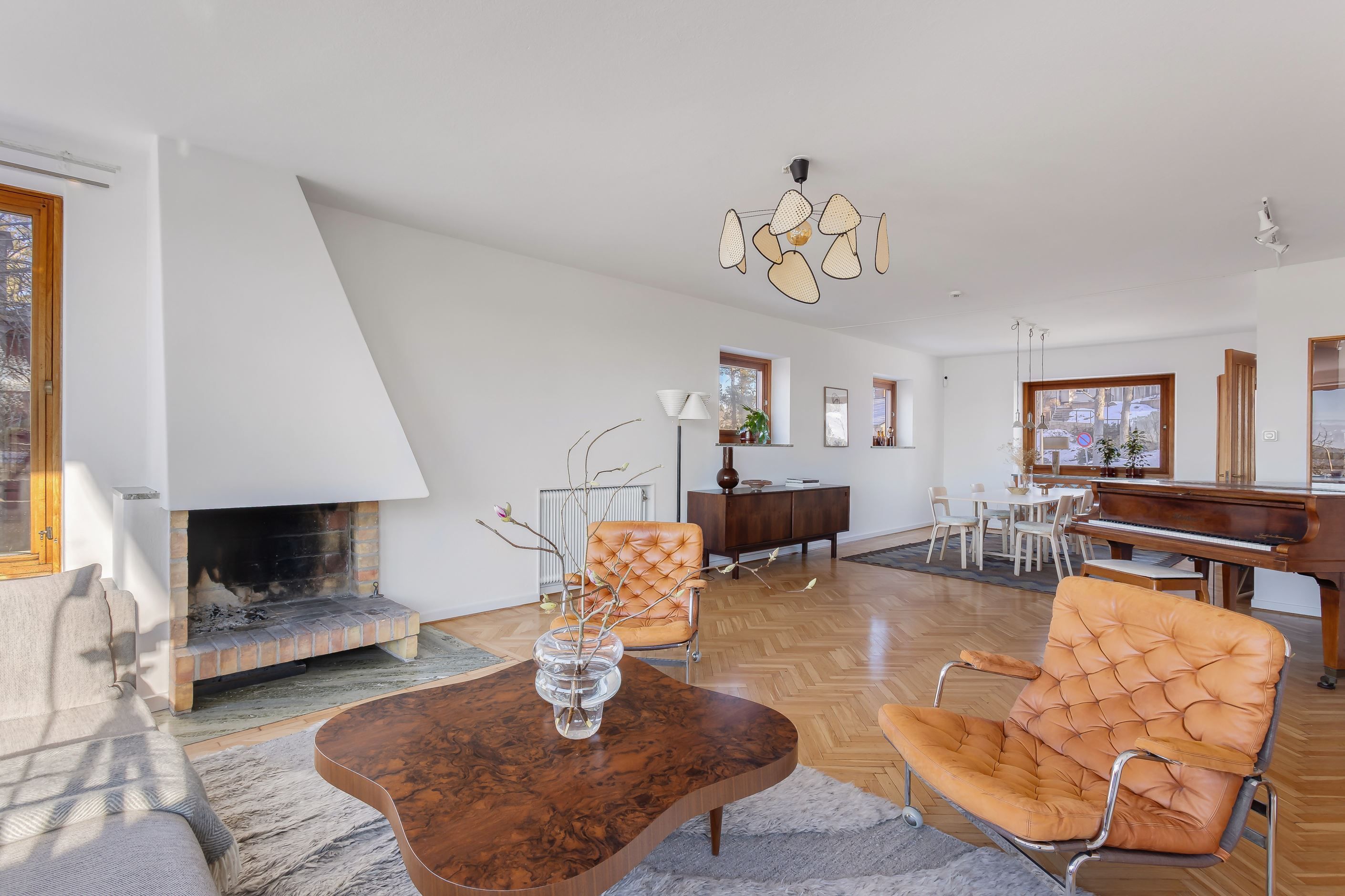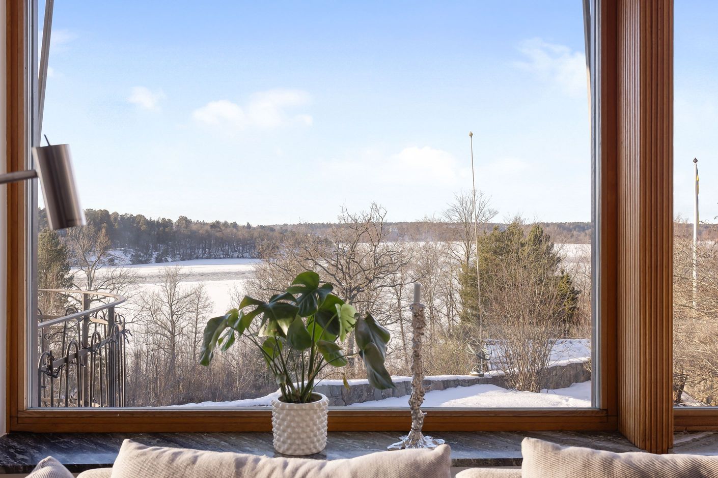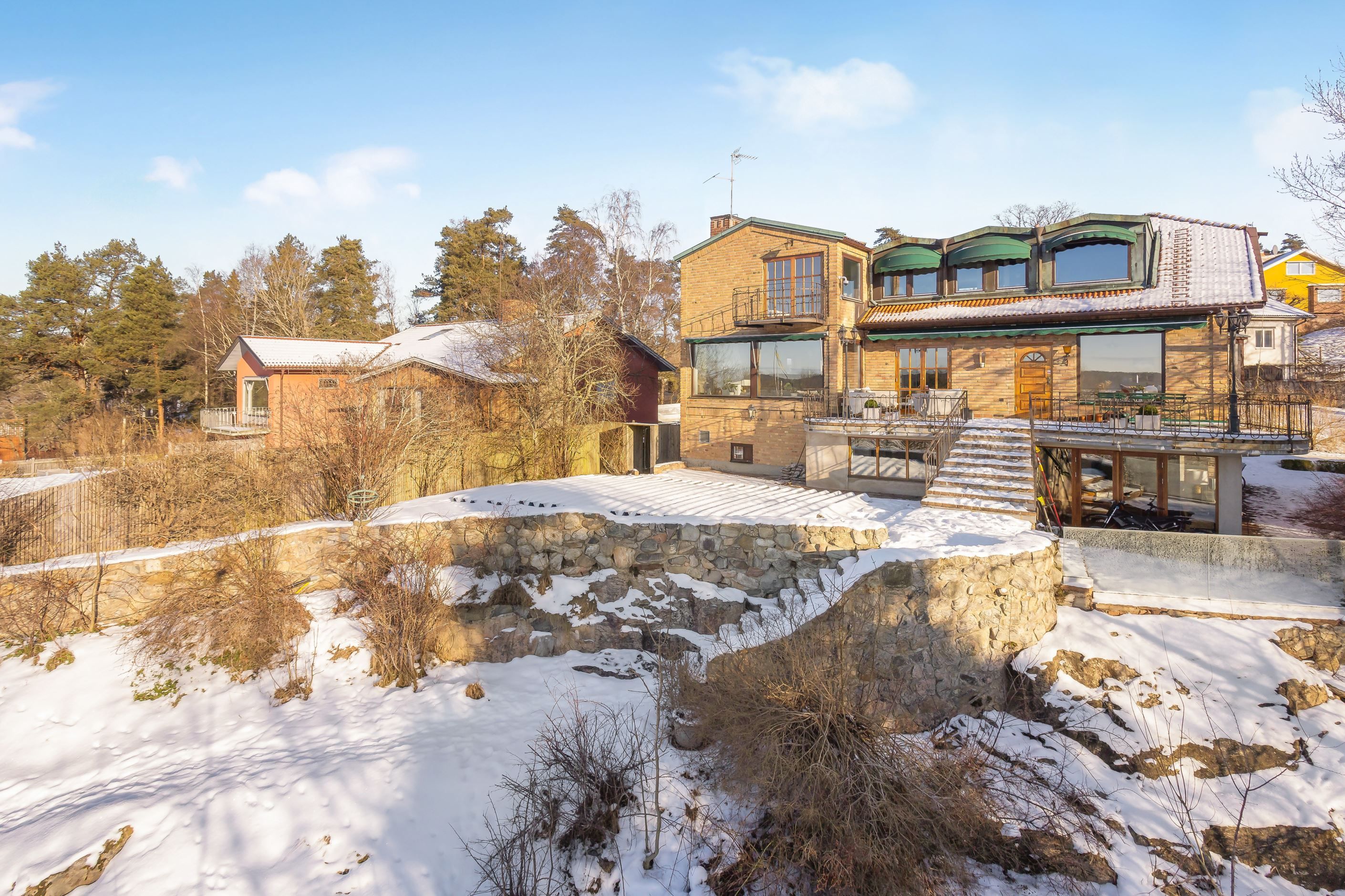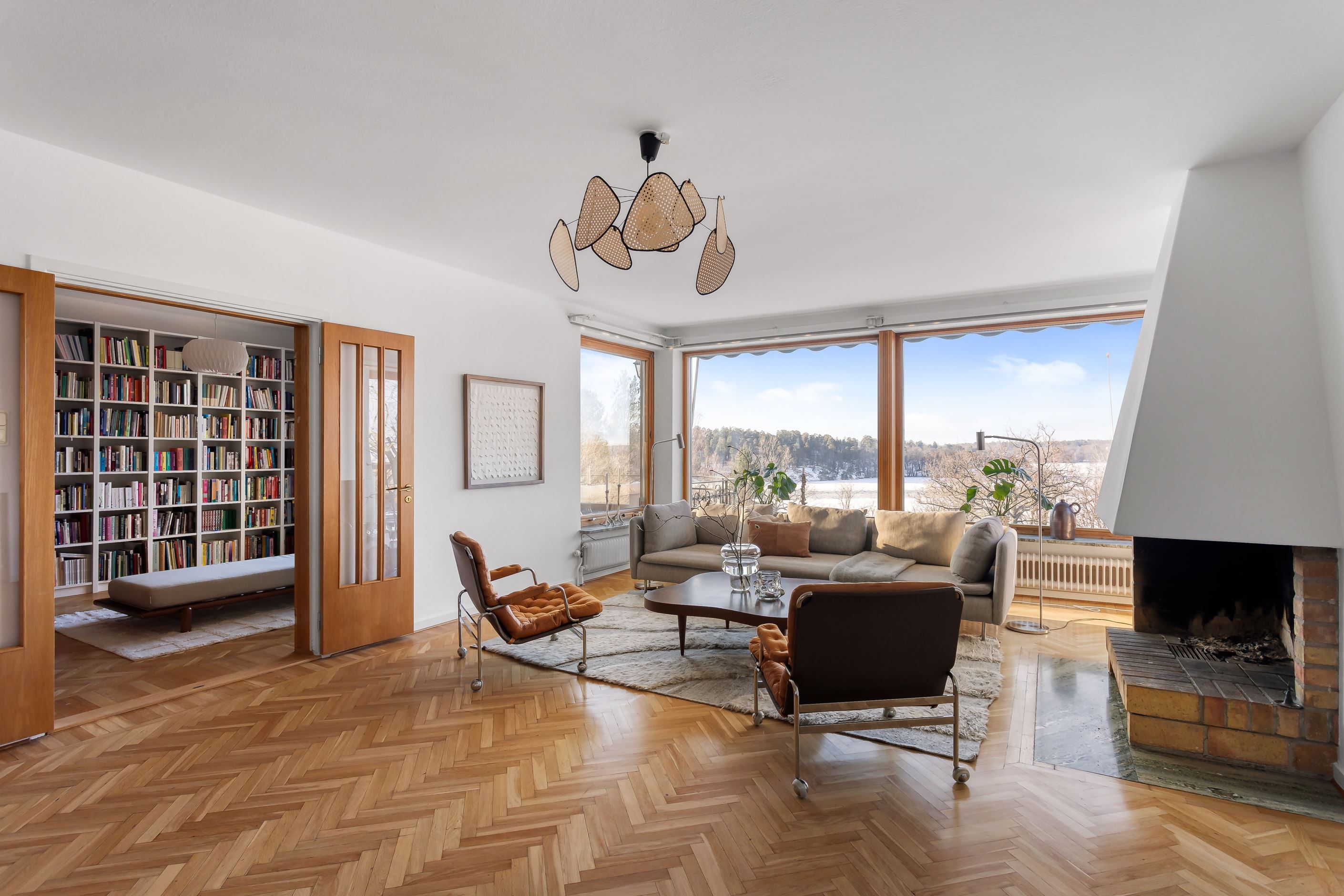 Gedigen villa med "strandtomtsatmosfär" och endast någon minuts gångväg, över tomt och allmänning, ner till strandkant samt gemensam brygga. Naturskönt och skyddat Mälarläge med frodig grönska och fin sjökontakt från såväl trädgård, uteplatser som husets storslagna interiör. Spektakulär 40-talsarkitektur - något utöver det vanliga. En förstklassig och genomtänkt boendemiljö, tot. ca 400 kvm, med ljus och luftig planlösning samt generösa fönsterpartier mot den glittrande fjärden. Stora soldränkta altaner i sydväst med underbara solnedgångar över vattnet. Från nedre altanen leder trappa ner till den terrasserade lättskötta tomten - ett trivsamt sätt att binda samman hus med trädgård. Pool som med sitt stensatta pooldäck av tidstrogen Ölandssten samt tilltalande form adderar ytterligare livskvalitet - ett "smycke" i trädgården.