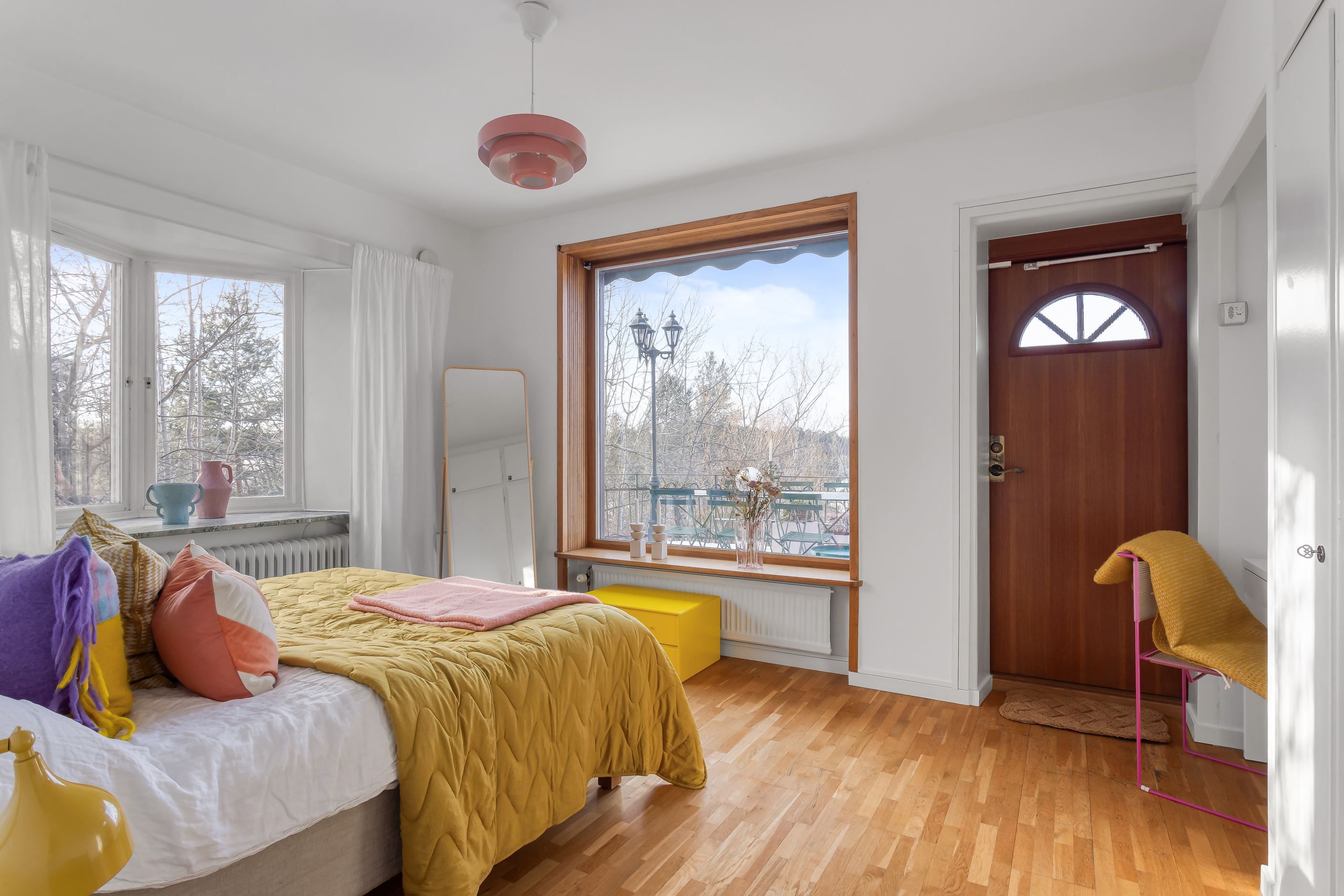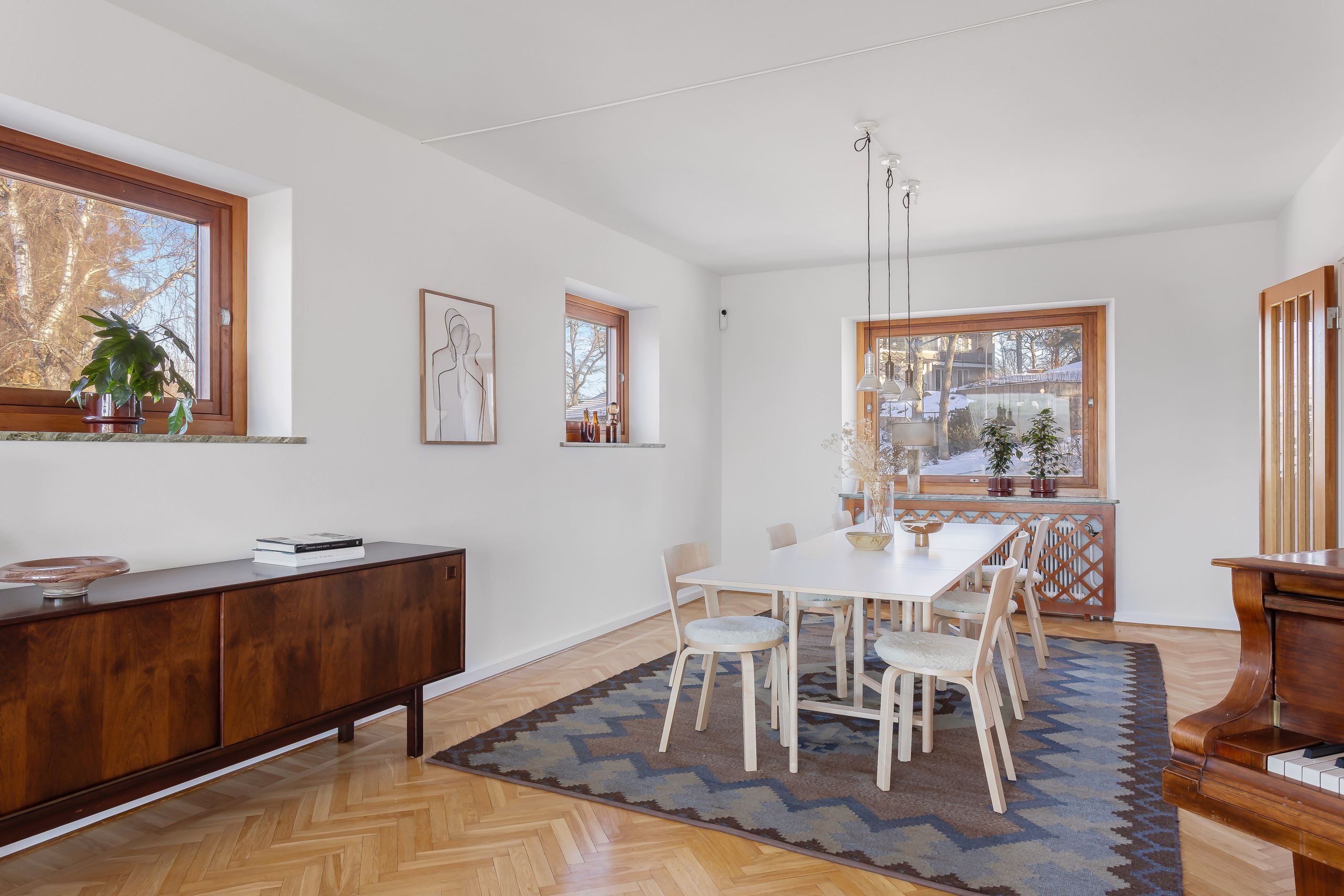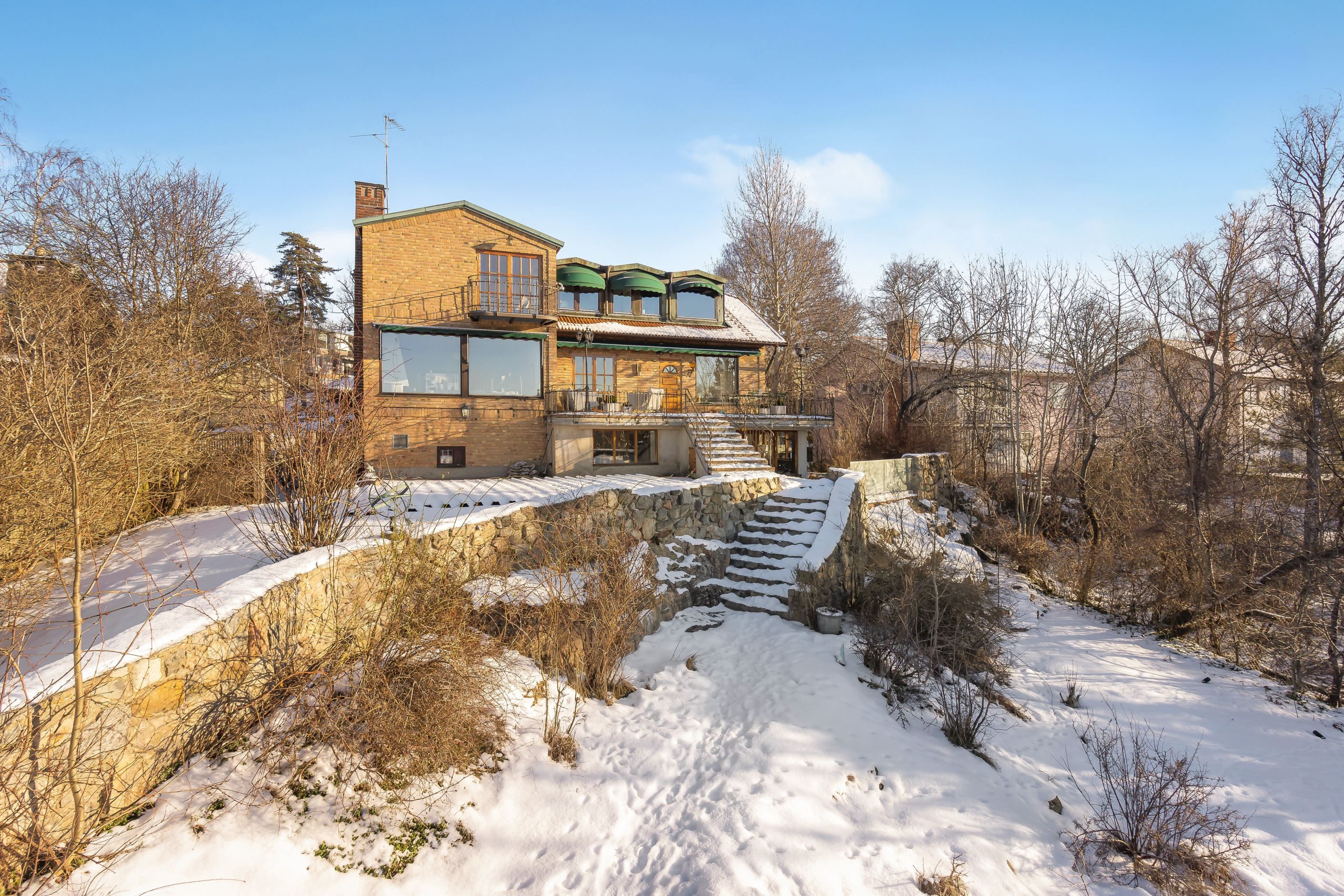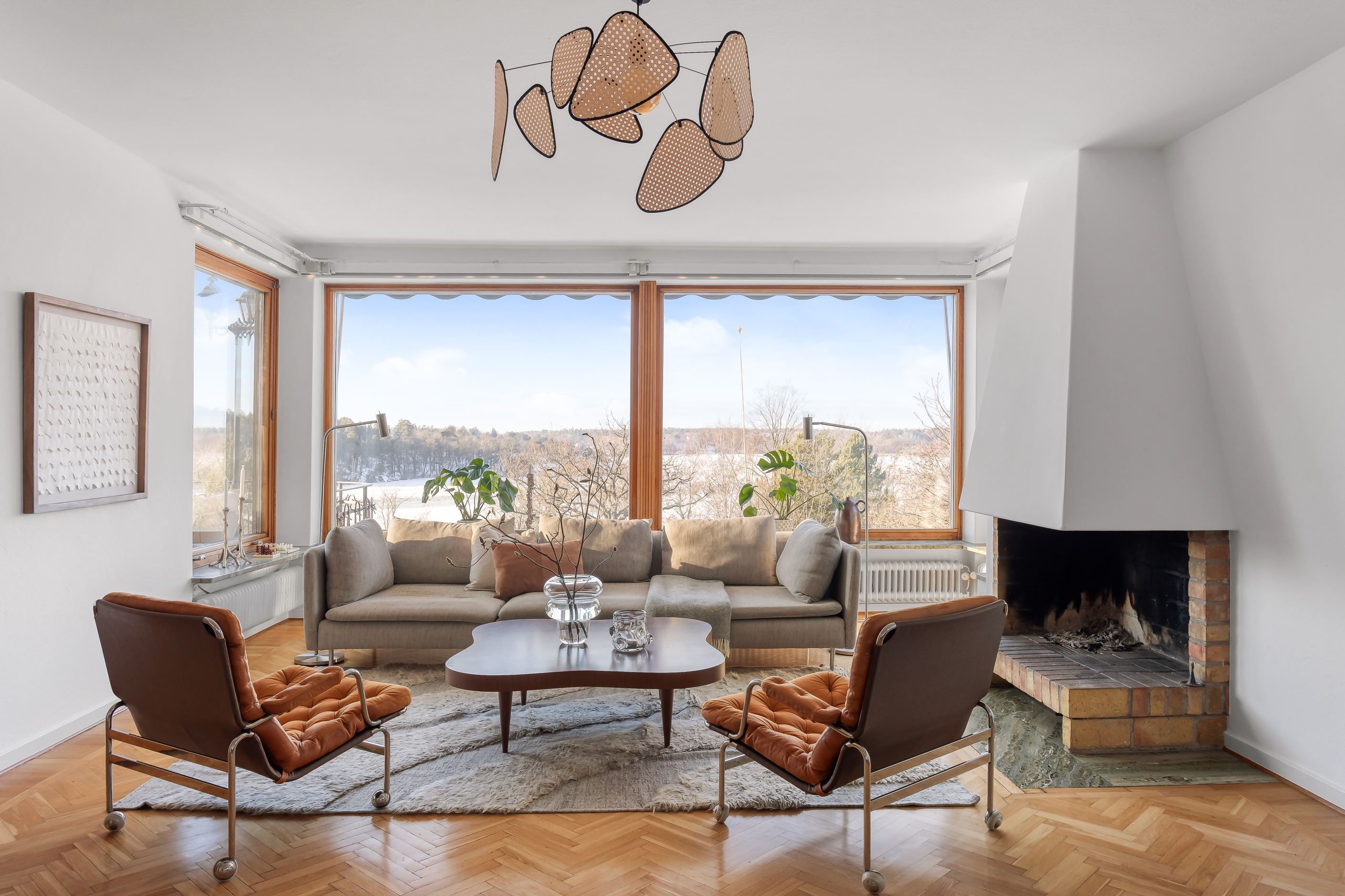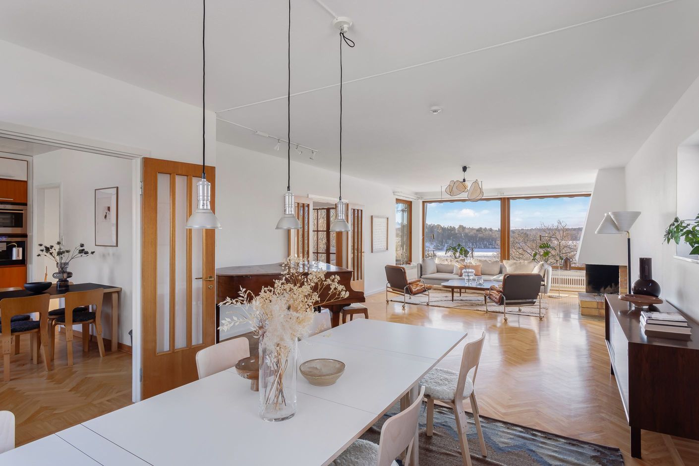 Gedigen villa med "strandtomtsatmosfär" och endast någon minuts gångväg, över tomt och allmänning, ner till strandkant samt gemensam brygga. Naturskönt och skyddat Mälarläge med frodig grönska och fin sjökontakt från såväl trädgård, uteplatser som husets storslagna interiör. Spektakulär 40-talsarkitektur - något utöver det vanliga. En förstklassig och genomtänkt boendemiljö, tot. ca 400 kvm, med ljus och luftig planlösning samt generösa fönsterpartier mot den glittrande fjärden. Stora soldränkta altaner i sydväst med underbara solnedgångar över vattnet. Från nedre altanen leder trappa ner till den terrasserade lättskötta tomten - ett trivsamt sätt att binda samman hus med trädgård. Pool som med sitt stensatta pooldäck av tidstrogen Ölandssten samt tilltalande form adderar ytterligare livskvalitet - ett "smycke" i trädgården.