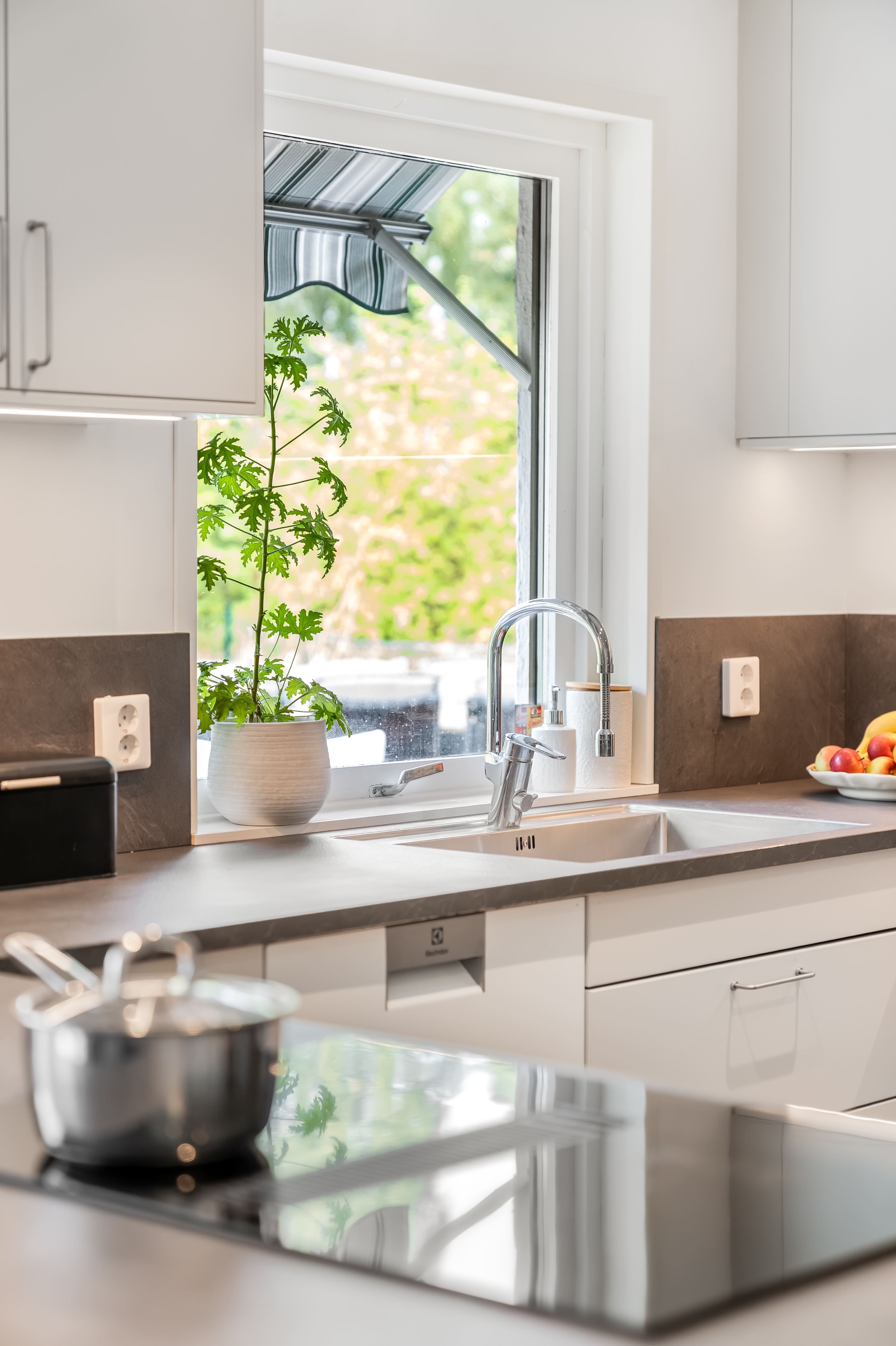 Från kök och vardagsrum når du det inglasade uterummet i soligt västerläge – en underbar plats att njuta av långa kvällar med utsikt över sjön. Den lättskötta tomten bjuder på en fin mix av gräsmatta, uteplatser och vacker omgivning med skog och ängar precis utanför knuten.