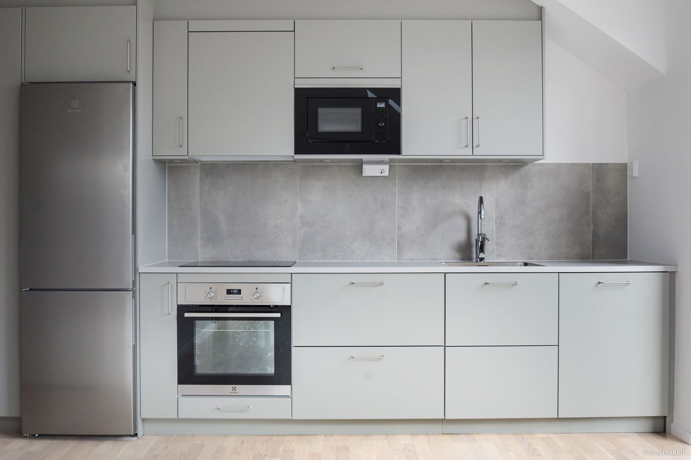 Köket är fullt utrustat med eleganta vitvaror från Electrolux – spishäll, ugn, mikro, diskmaskin samt kyl/frys – allt du behöver för att sätta guldkant på matlagningen. Sovrummet erbjuder plats för en dubbelsäng och har generös förvaring i en praktisk skjutdörrsgarderob.