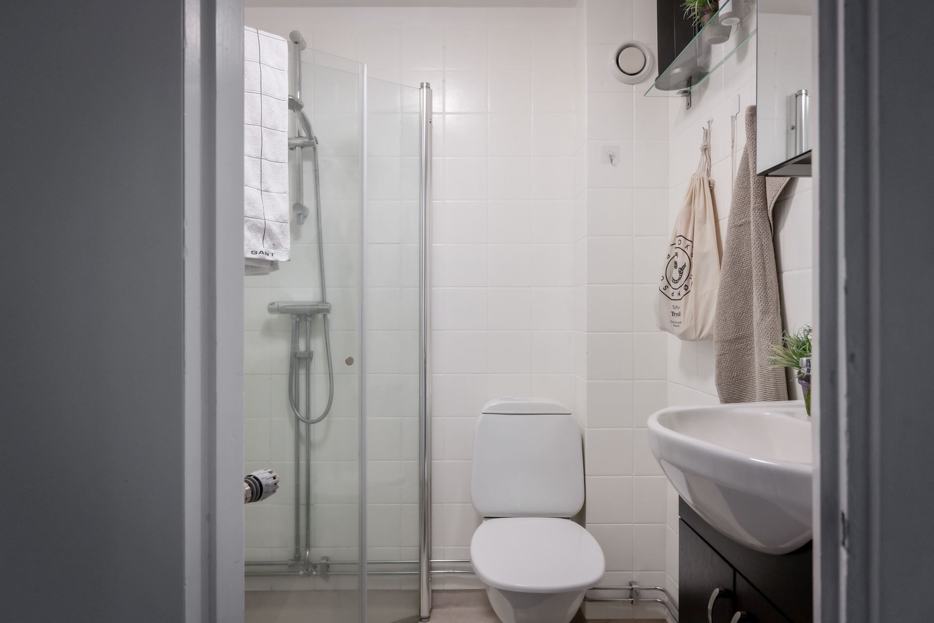 Föreningen har annars ett flertal uteplatser åt sina medlemmar med grillplats och utemöbler. Badrummet är från föreningens stambyte, kakel på väggarna och plastmatta på golvet. Här har man moderniserat med dusch bakom glasvägg.