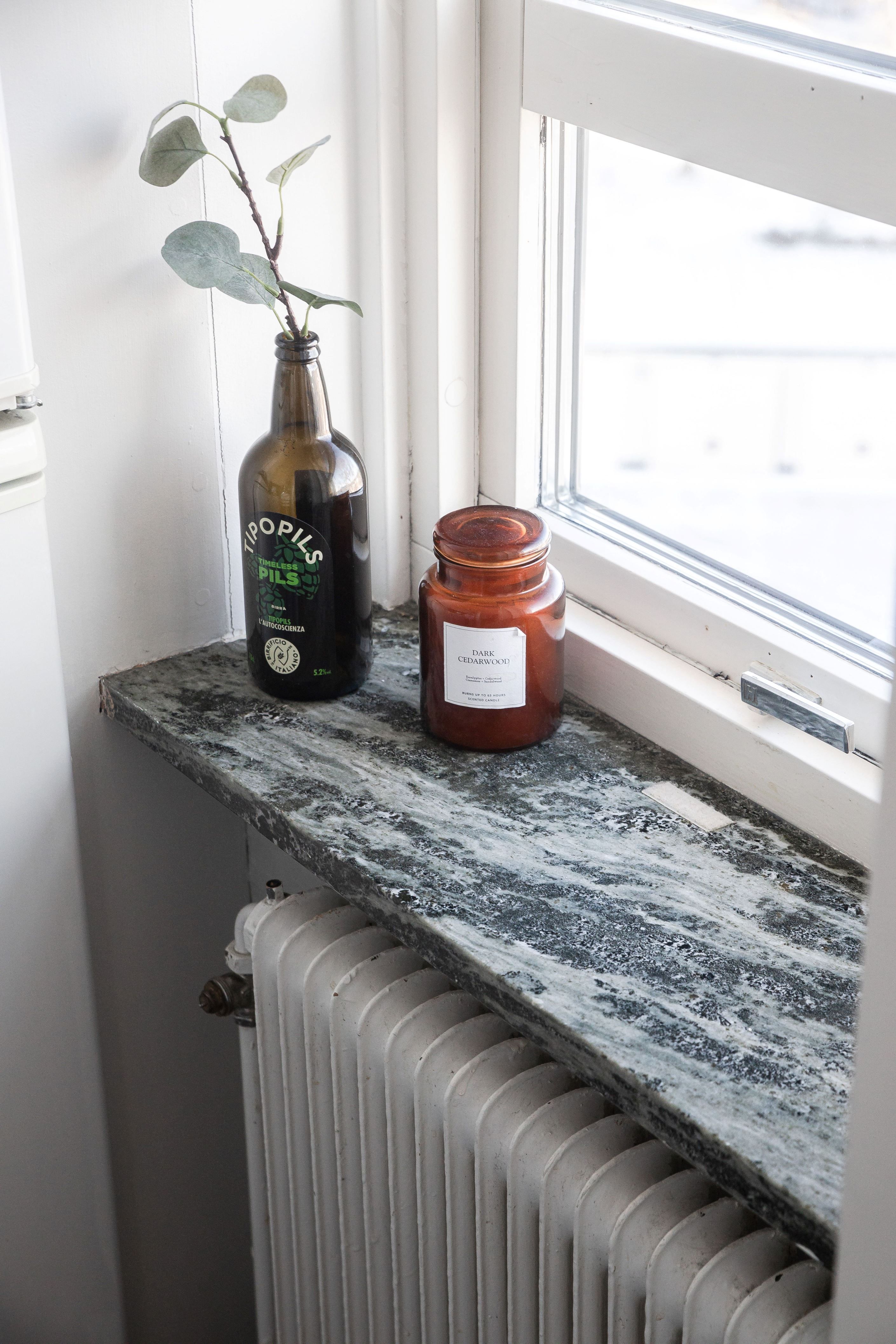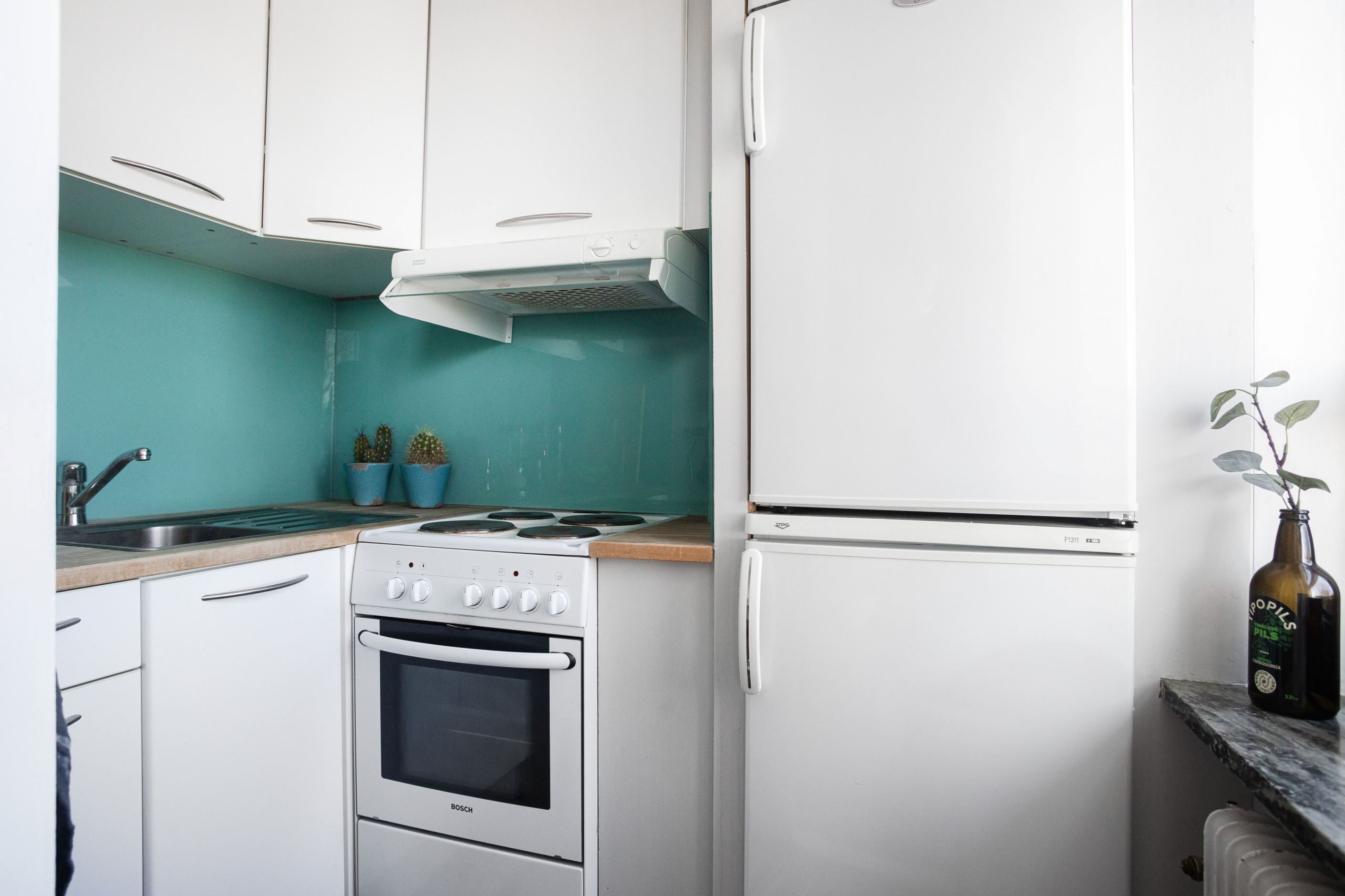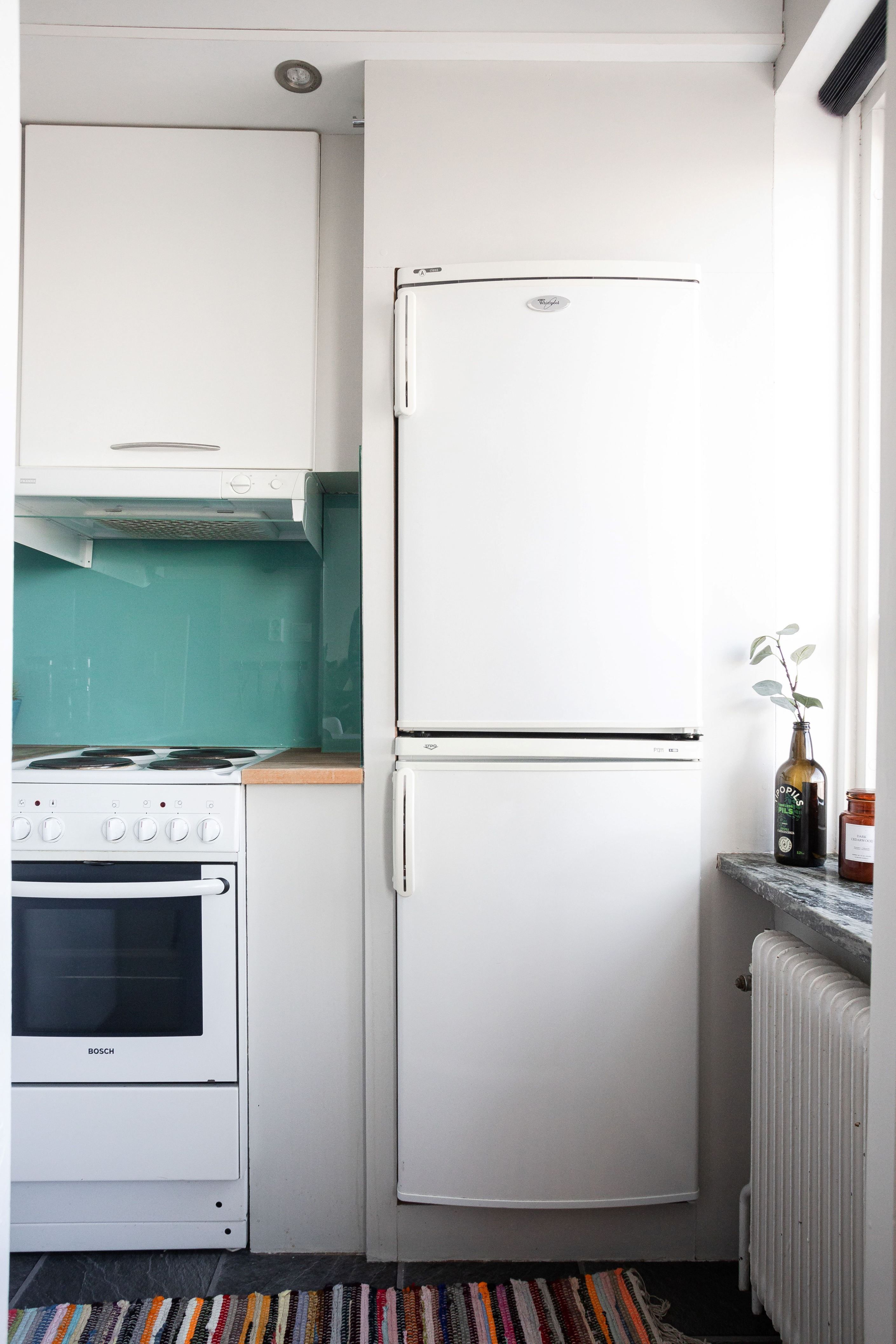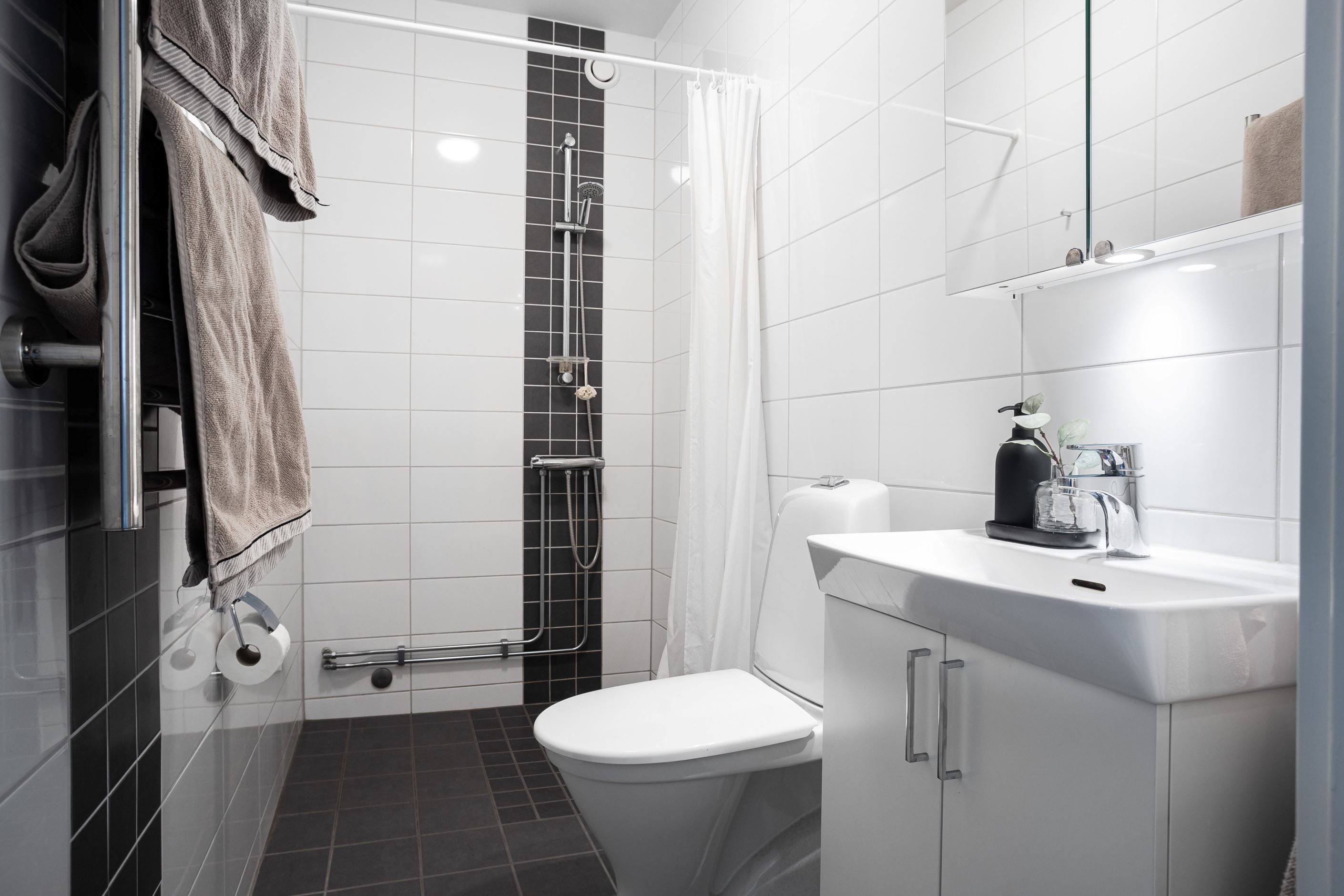 Det helkaklade badrummet renoverades av föreningen 2016 och håller en fräsch standard. Läget högst upp i huset ger en härlig utsikt över trädtopparna och den franska balkongen kan öppnas upp för frisk luft och morgonsol – här får du sol som sällskap under hela morgonen och förmiddagen.