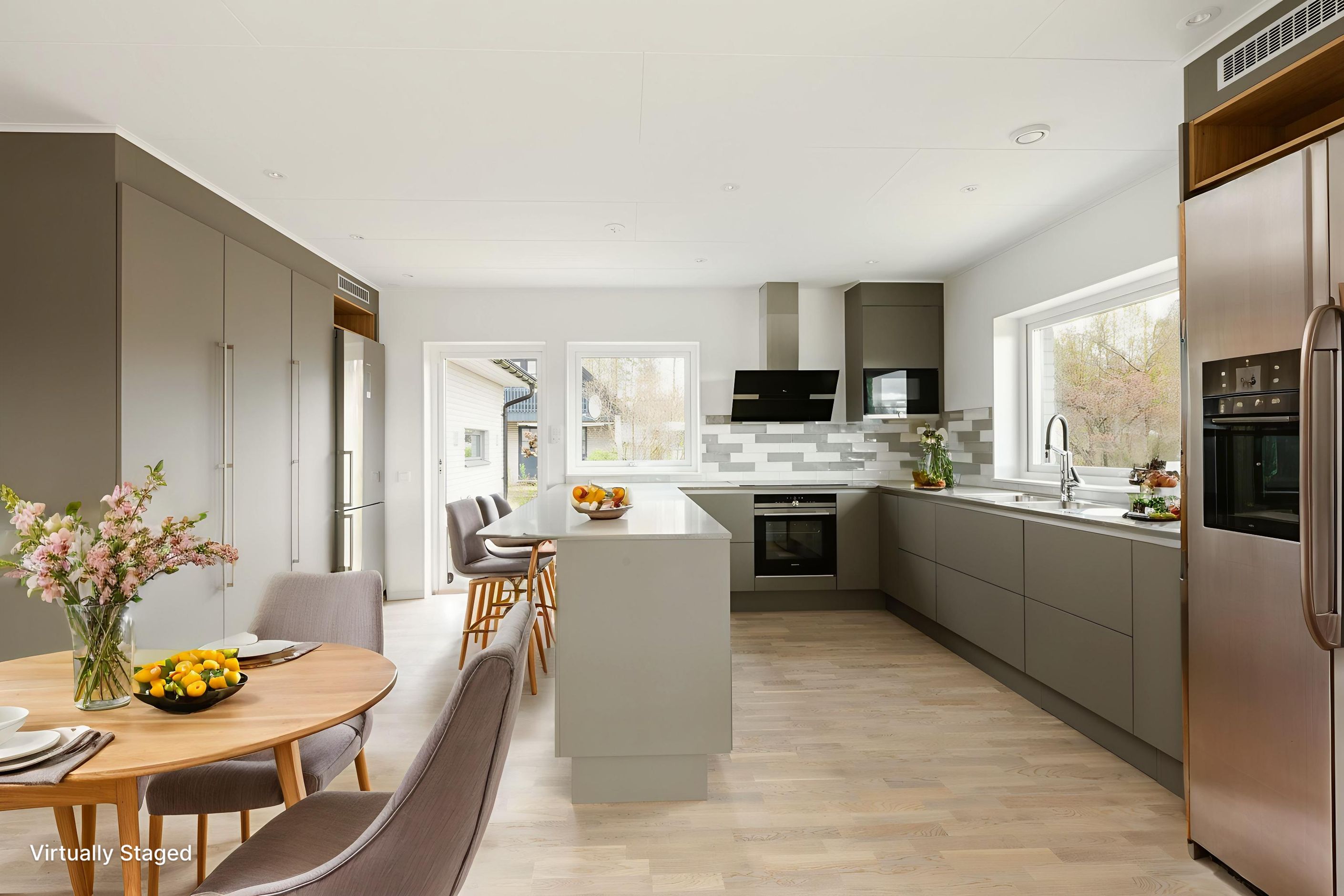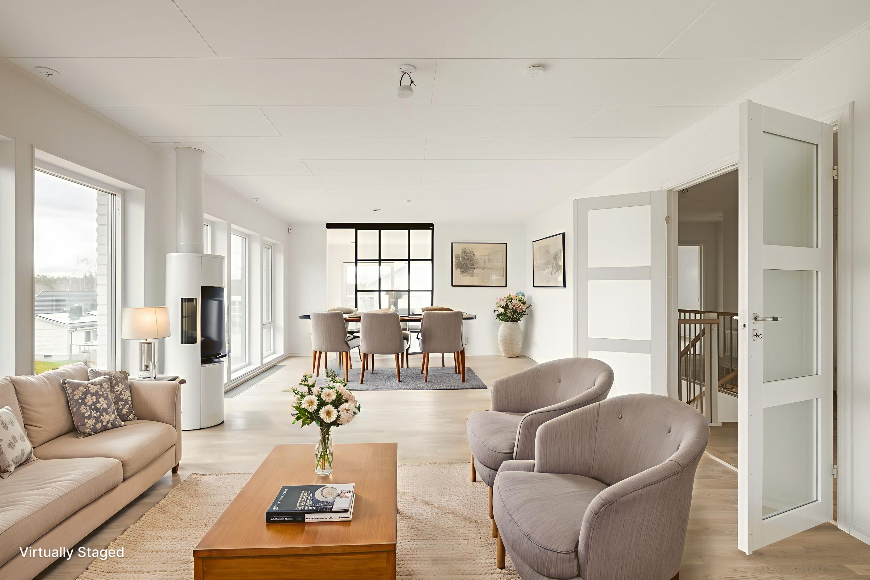 Det rymliga och välutrustade HTH köket är hjärtat i detta hem, komplett med dubbla kylskåp och frysar samt premiummaterial och apparater. Den öppna planlösningen skapar en övergång till det generösa vardagsrummet, vars stora fönster släpper in naturligt ljus och skapar en behaglig känsla, kompletterat med en mysig kamin.