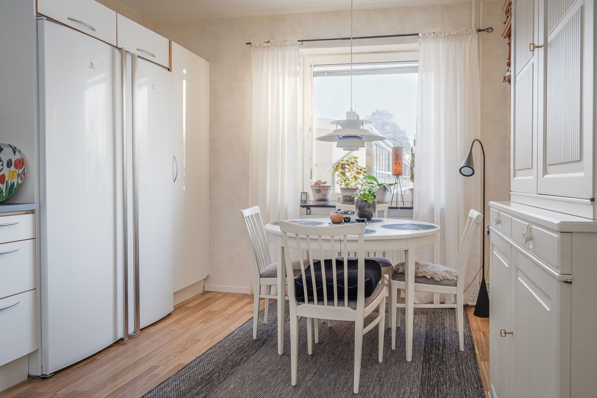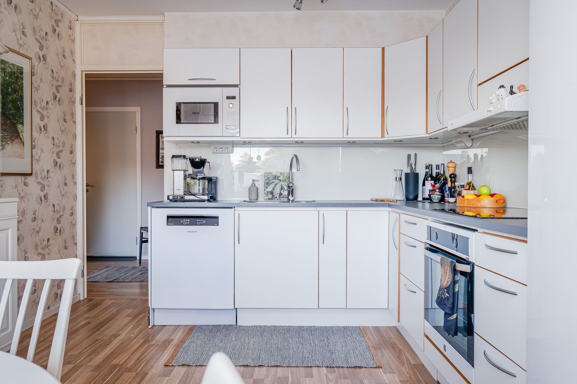 Hallen välkomnar med gott om plats för avhängning och vidare in möts du av ett ljust och hemtrevligt kök med bra arbetsytor, gott om förvaring och en naturlig matplatsdel för både vardag och helg.
