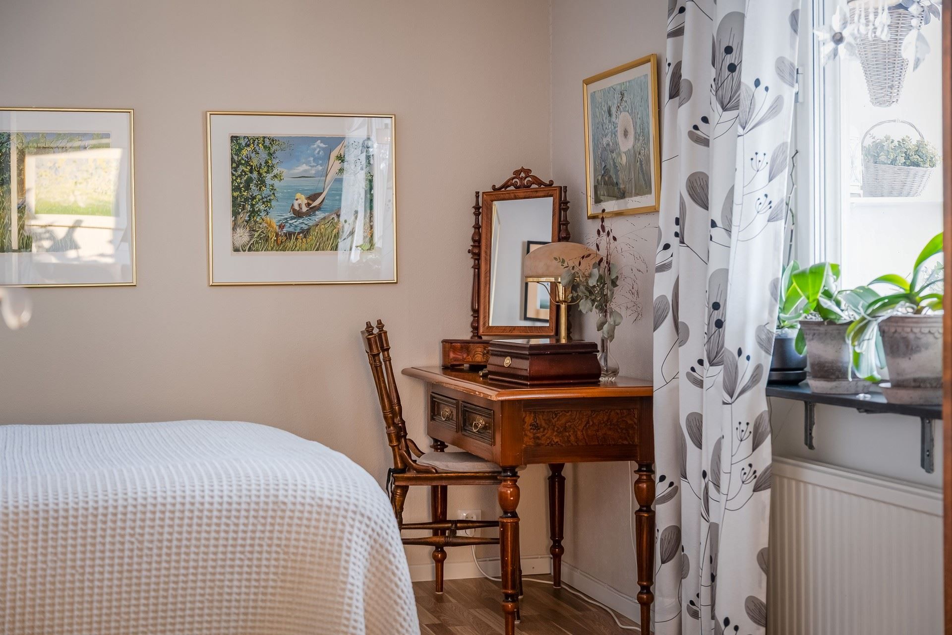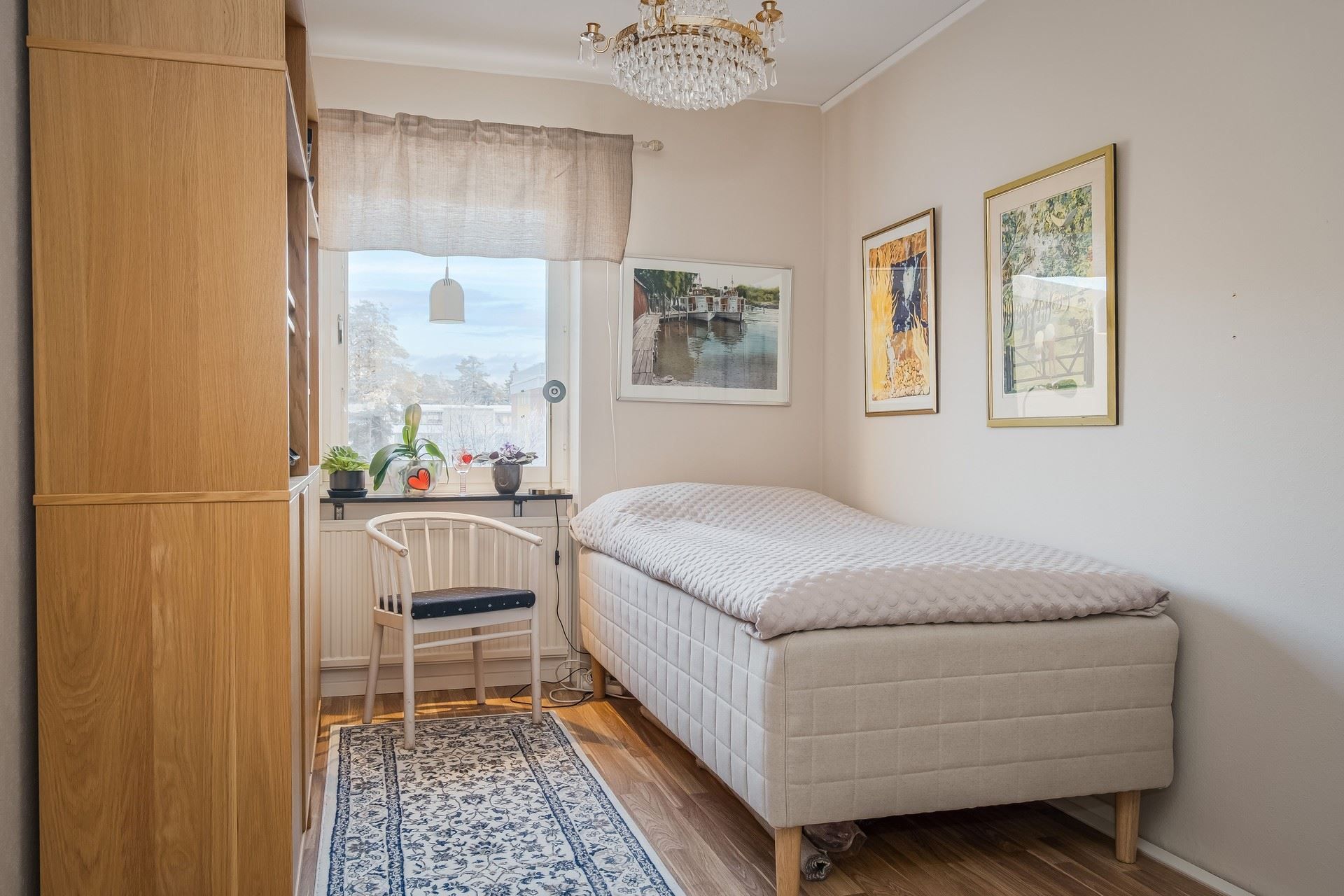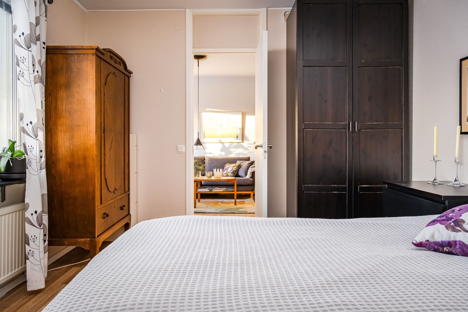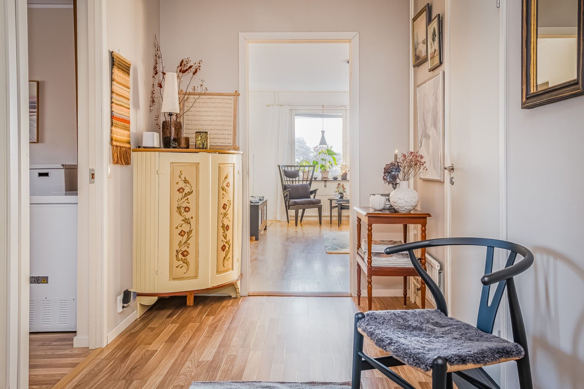 Lägenheten har två rymliga sovrum, båda med bra förvaringsmöjligheter och flexibel möblering. Badrummet är utrustat med våtrumsmatta och tvättmaskin som gör vardagen smidigare. Genom hela bostaden löper ett stilrent och enhetligt parkettgolv som skapar en harmonisk helhet.