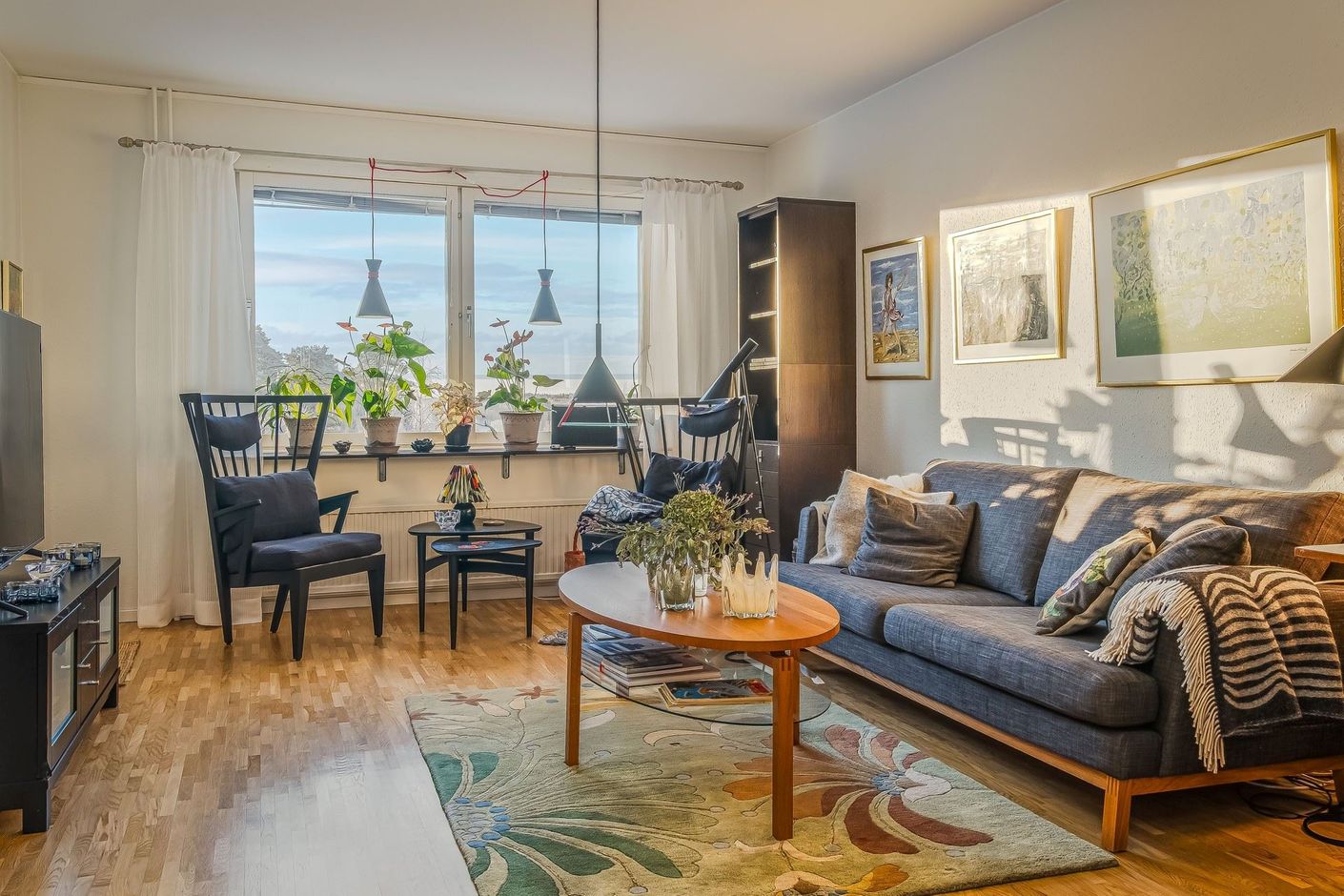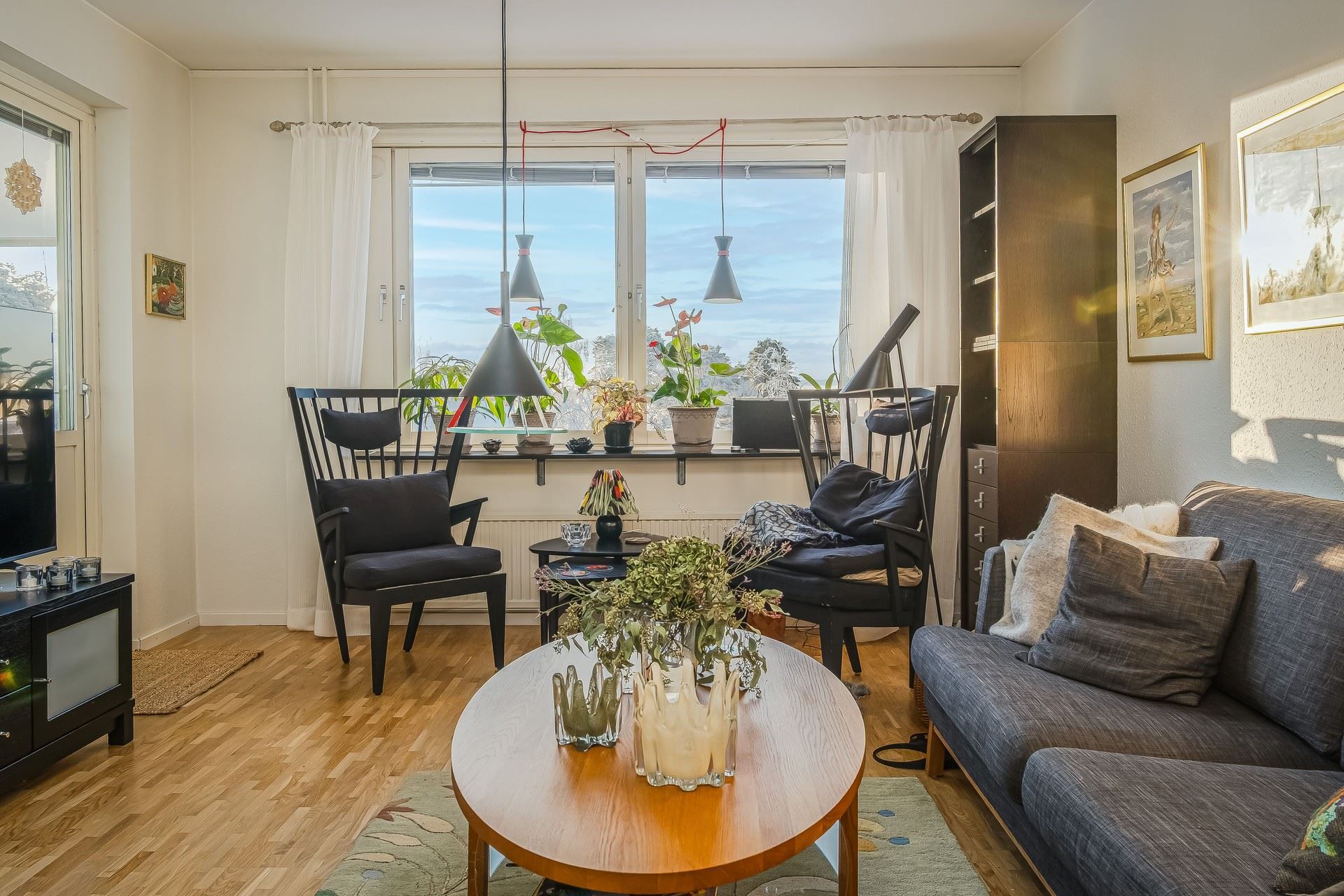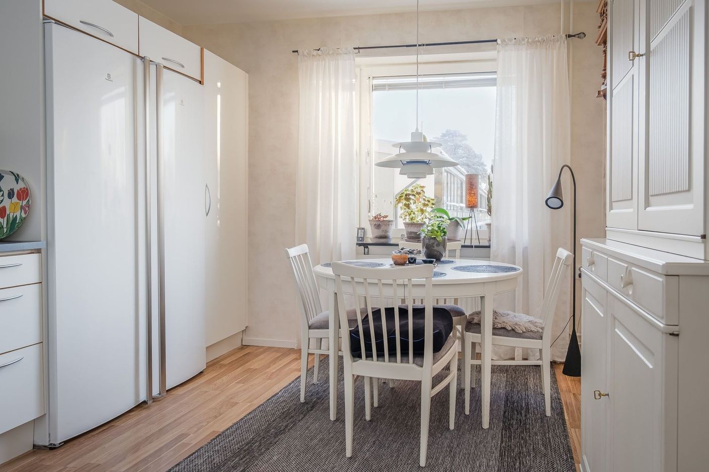 Det generösa vardagsrummet erbjuder fint ljusinsläpp och plats för både soffgrupp och matbord – perfekt för umgänge och avkoppling. Härifrån nås den inglasade balkongen, en favoritplats för morgonkaffet eller en lugn stund i kvällssolen.