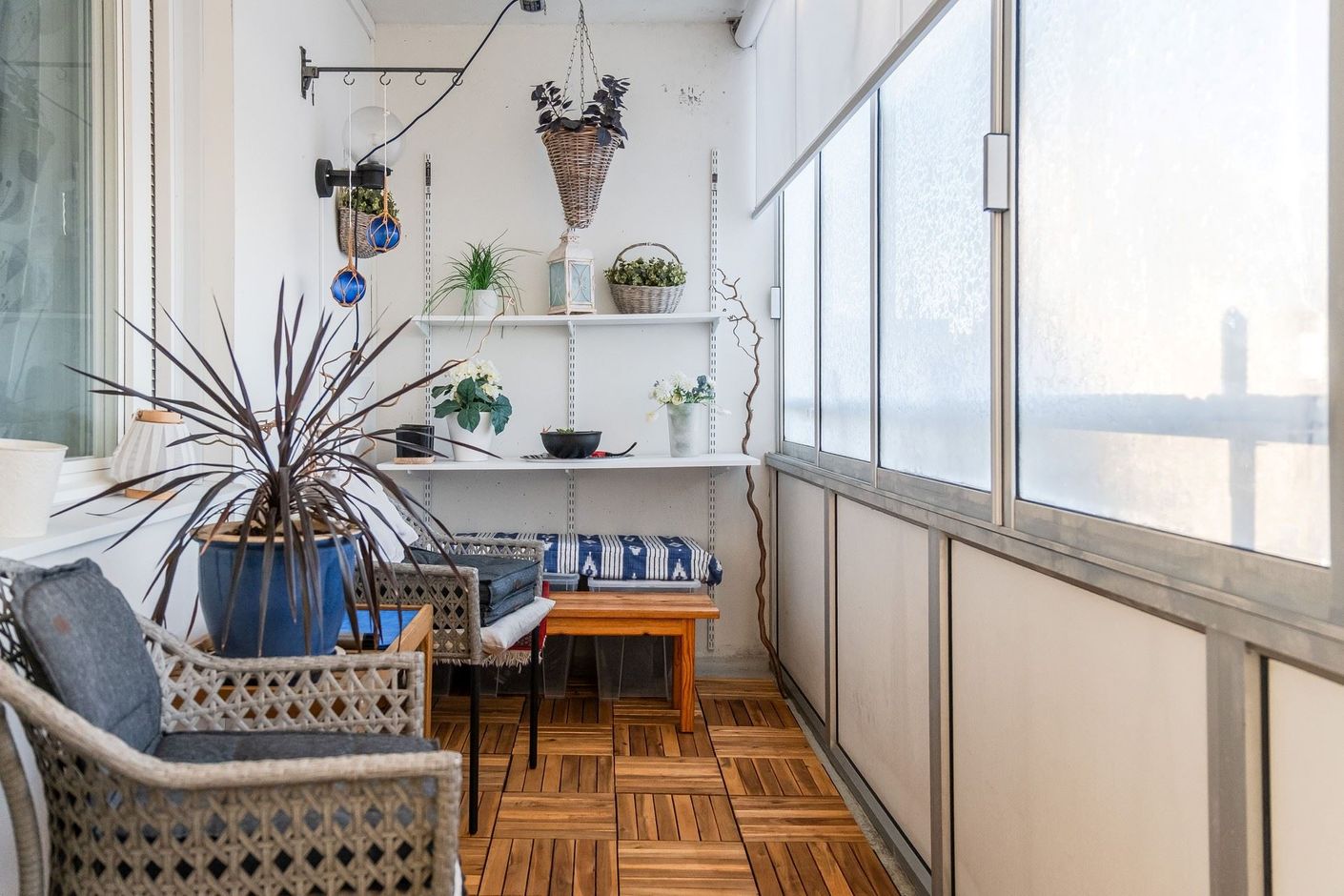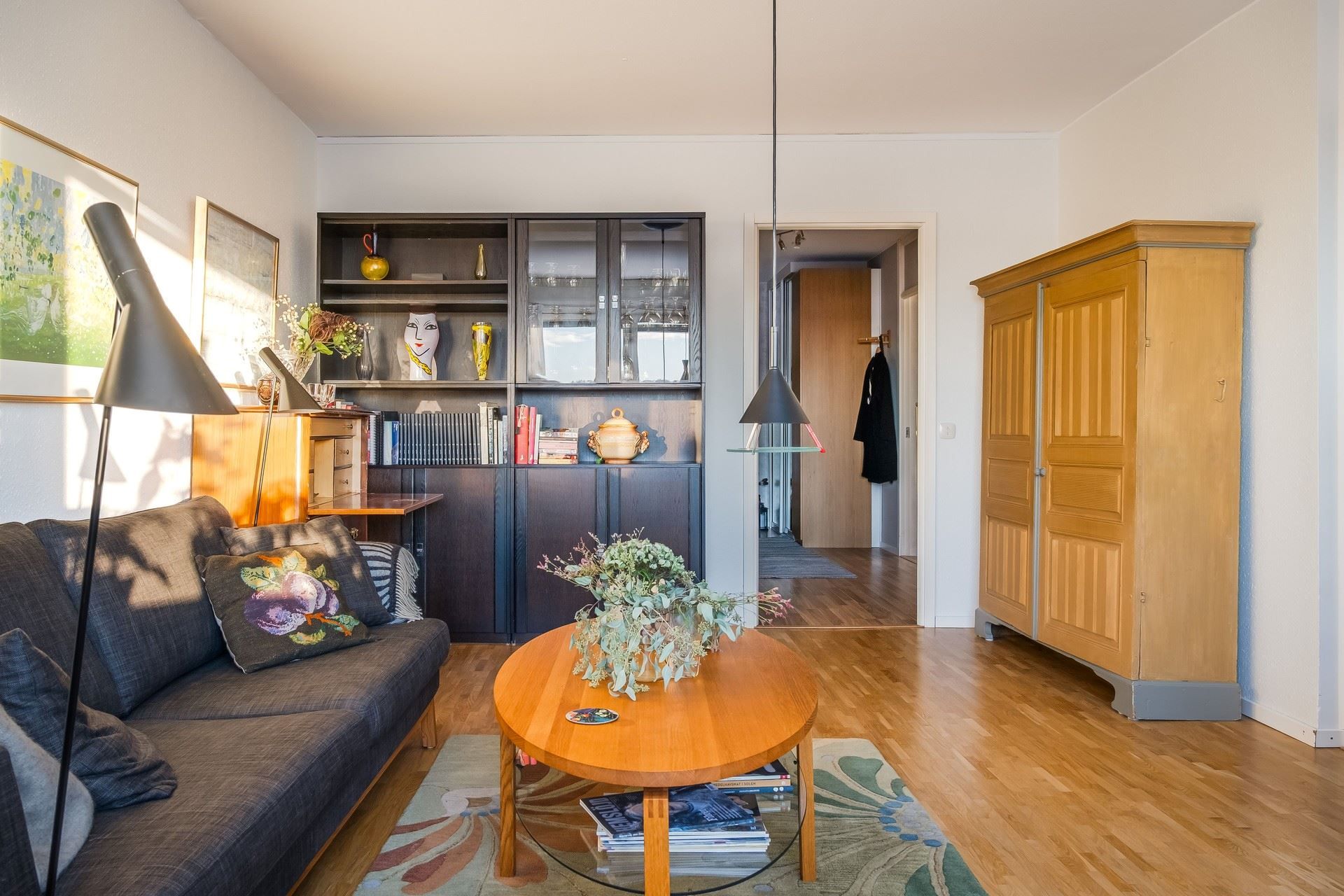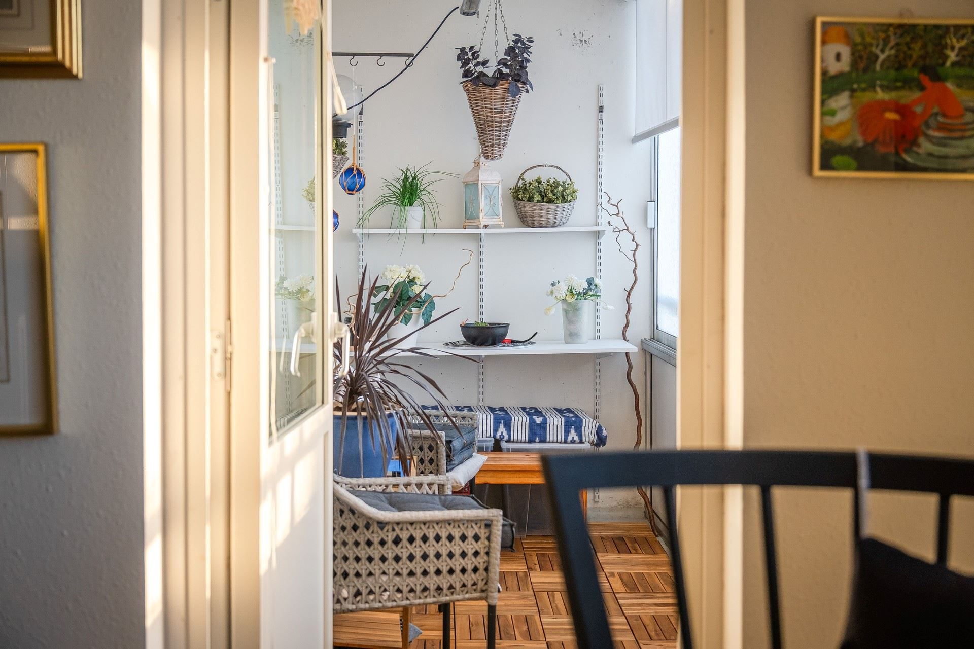 Det generösa vardagsrummet erbjuder fint ljusinsläpp och plats för både soffgrupp och matbord – perfekt för umgänge och avkoppling. Härifrån nås den inglasade balkongen, en favoritplats för morgonkaffet eller en lugn stund i kvällssolen.