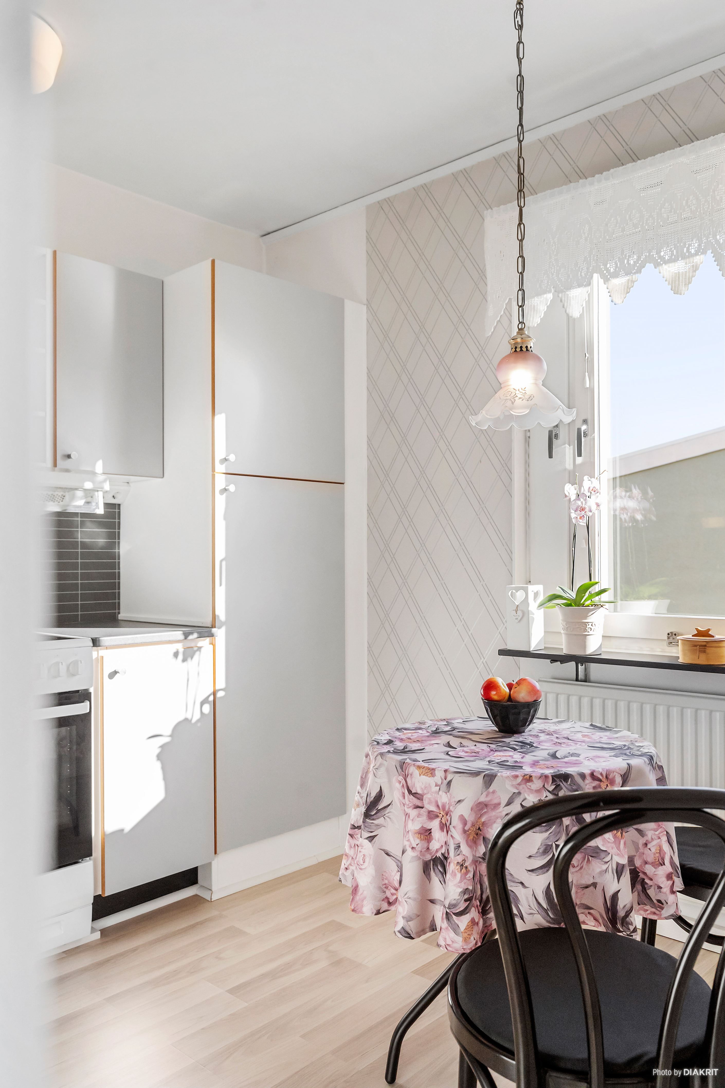 Vardagsrummet har morgon- och förmiddagssol och erbjuder ett fint ljusinsläpp som tillsammans med de vita väggarna och det ljusa klickgolvet skapar en luftig känsla. Från vardagsrummet når du det separata köket som har gott om förvaring och är utrustat med ugn, glashäll, fläkt och en kombinerad kyl/frys.