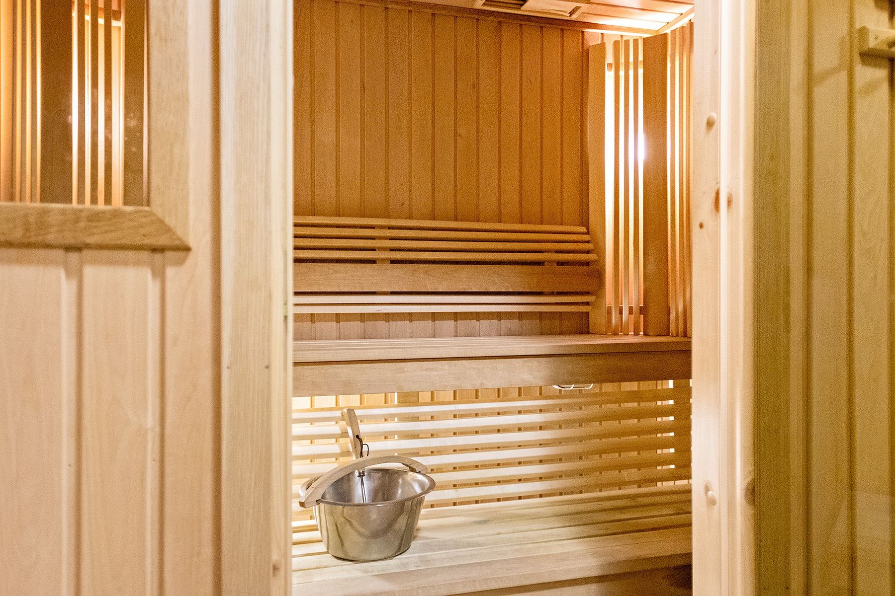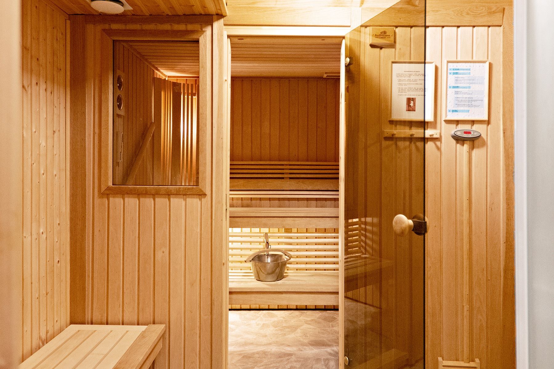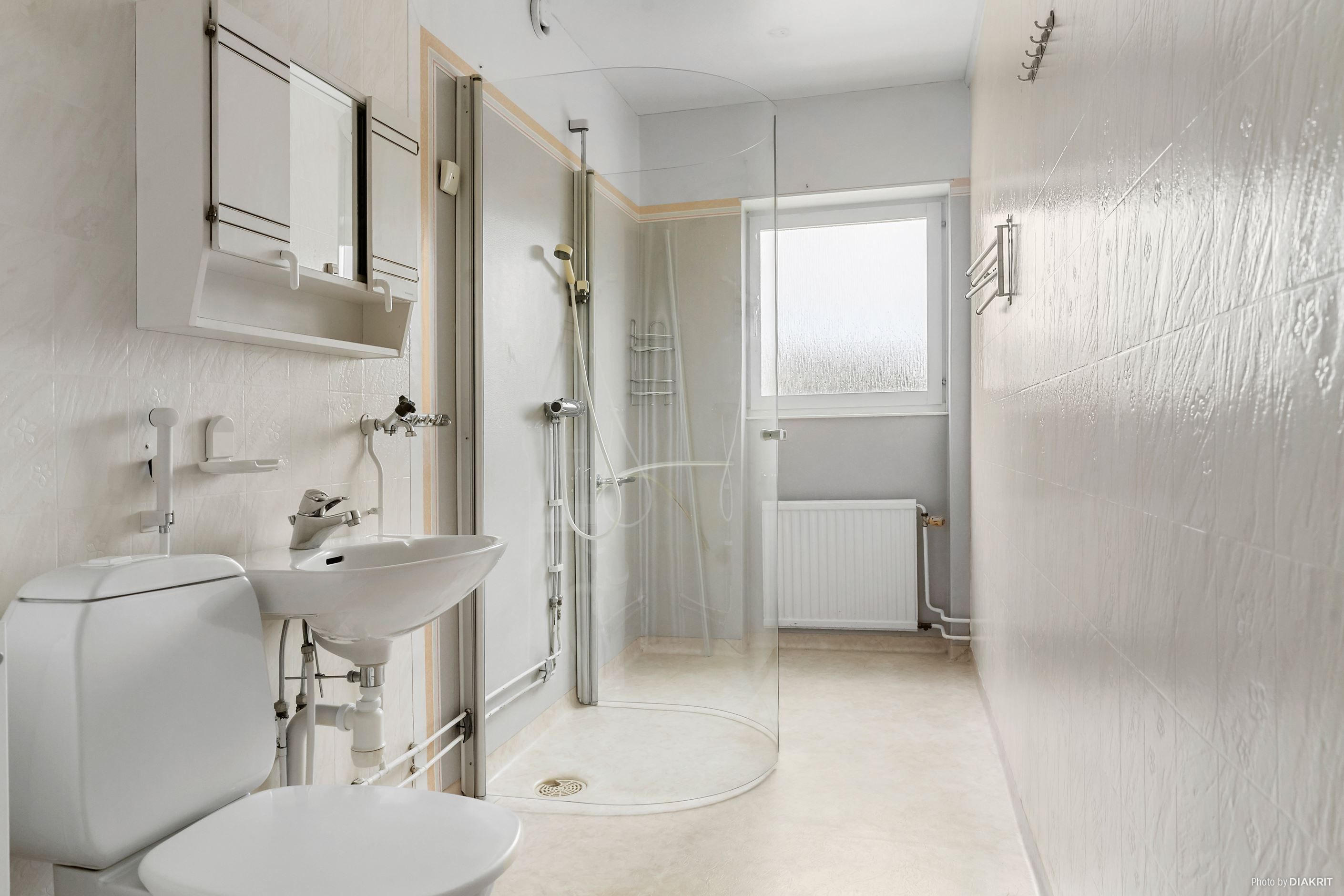 Badrummet är utrustat med våtrumsmatta, våtrumstapet och dusch med glasväggar.