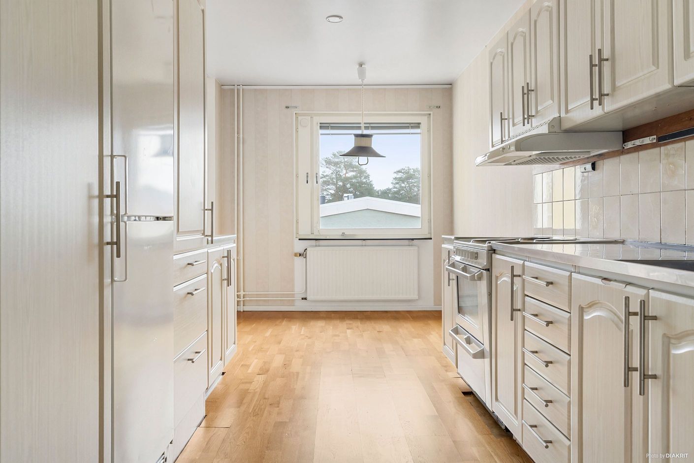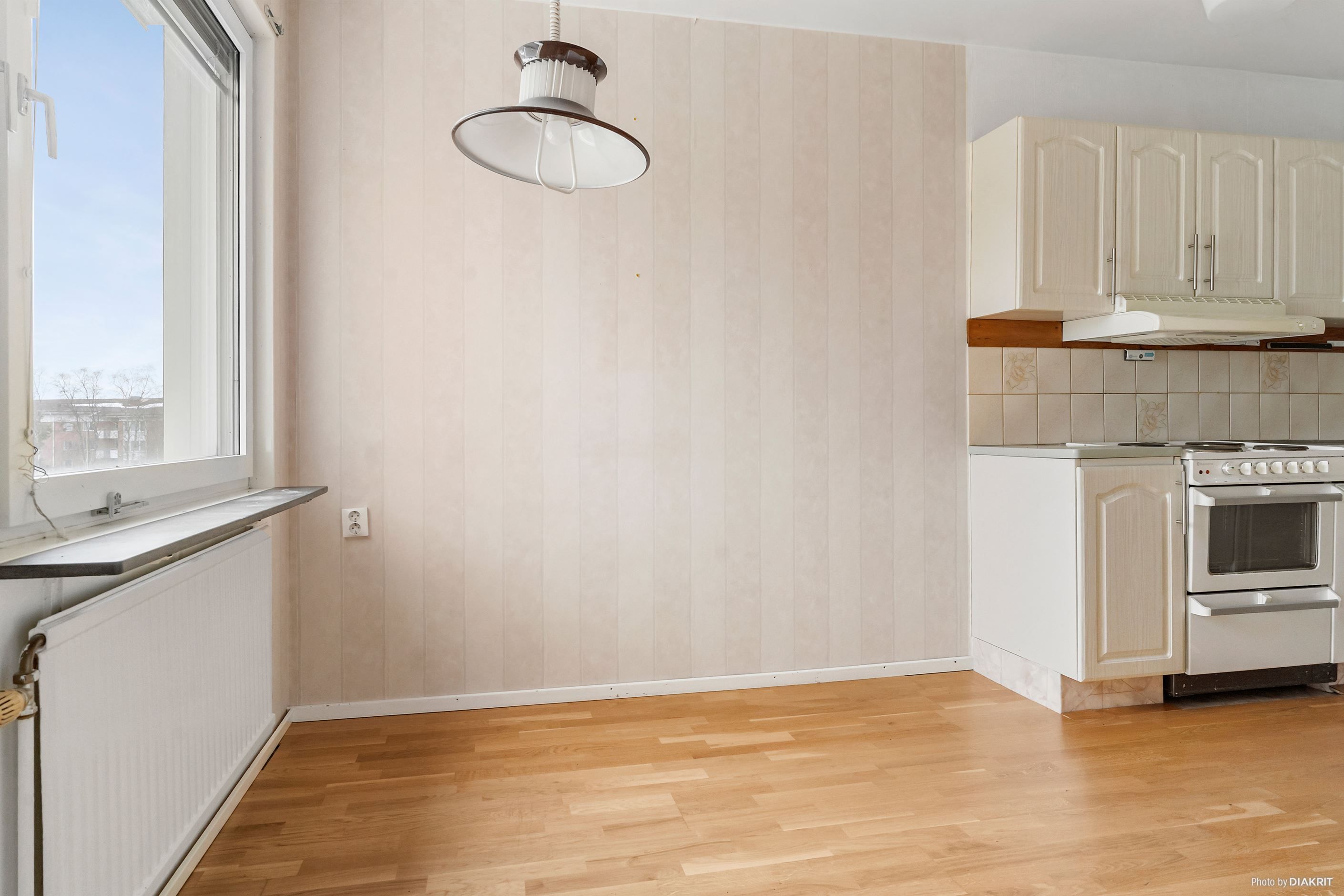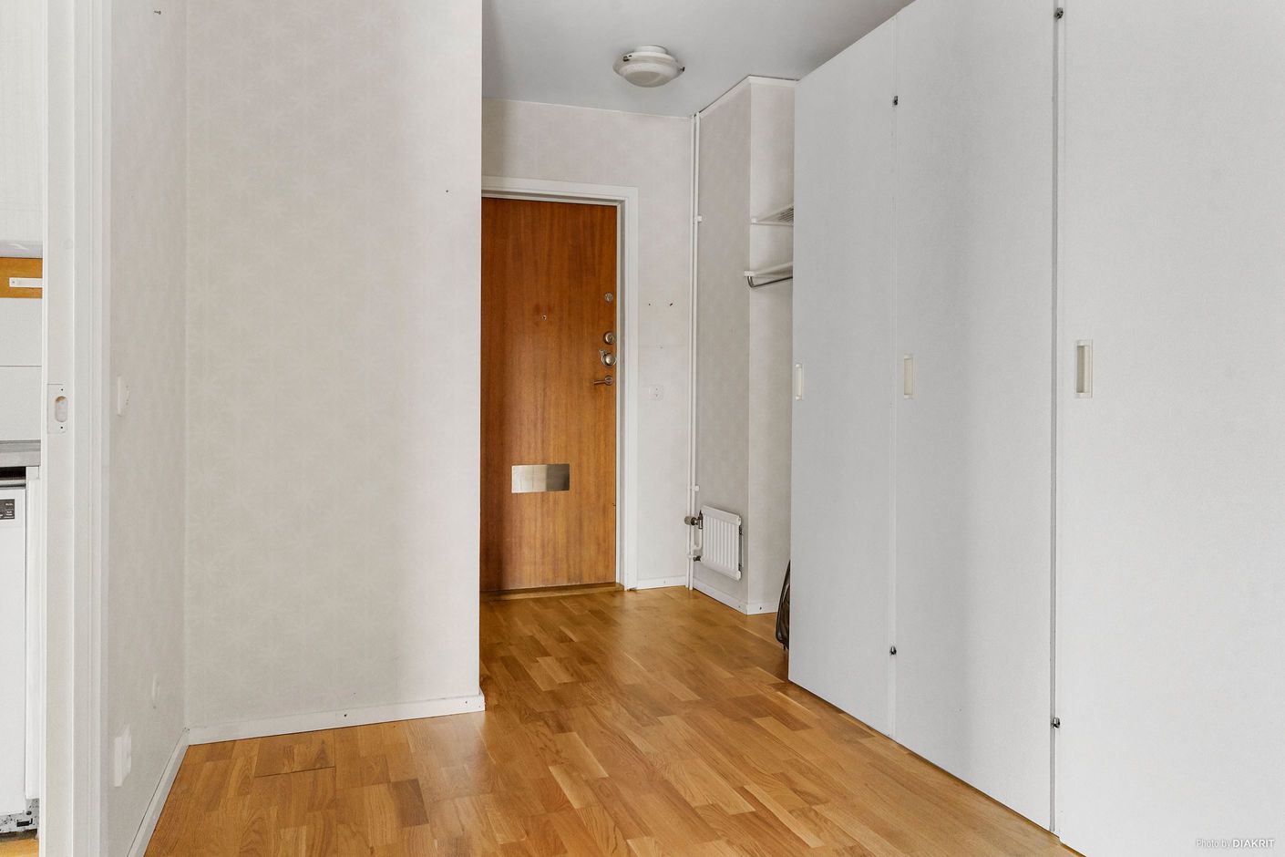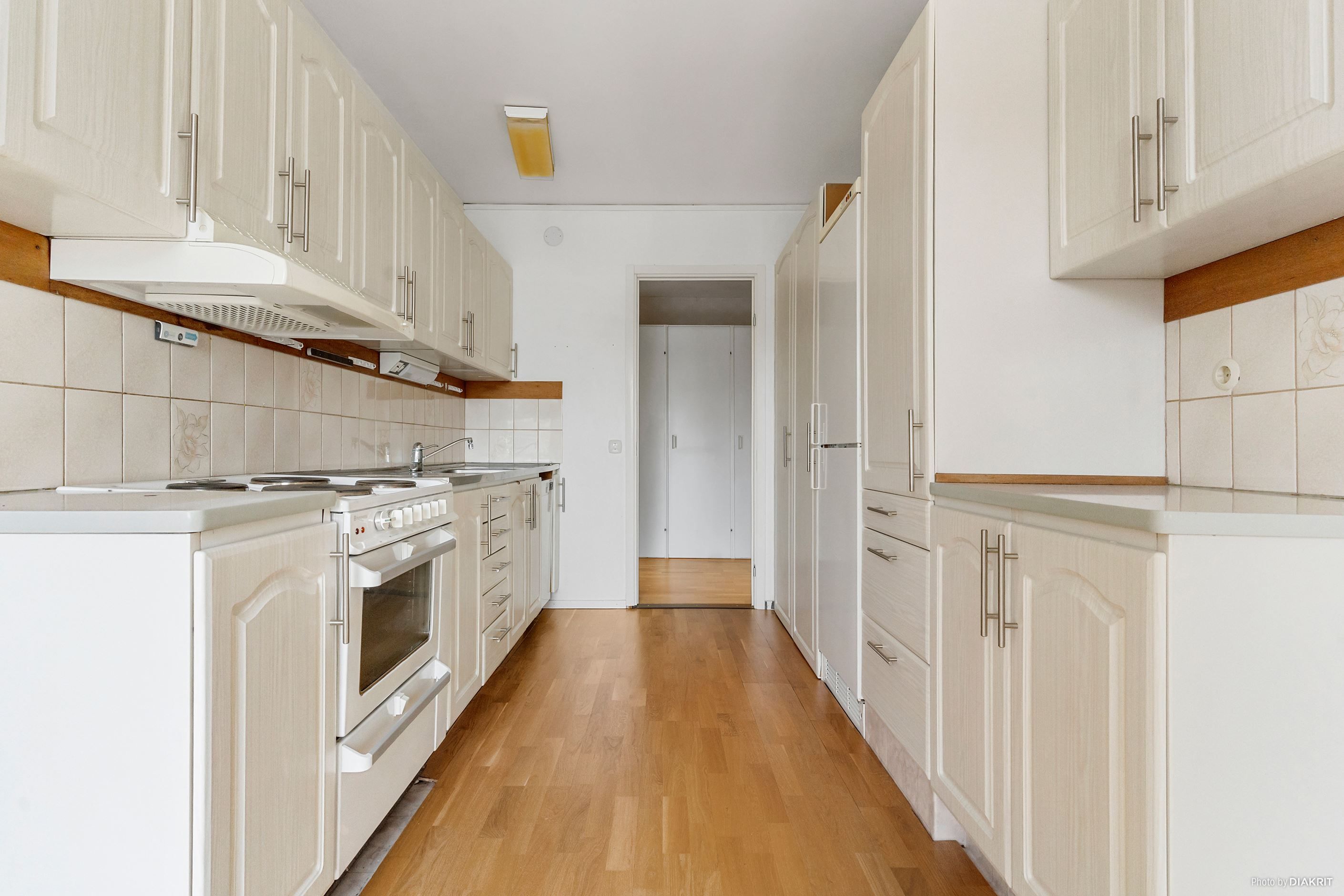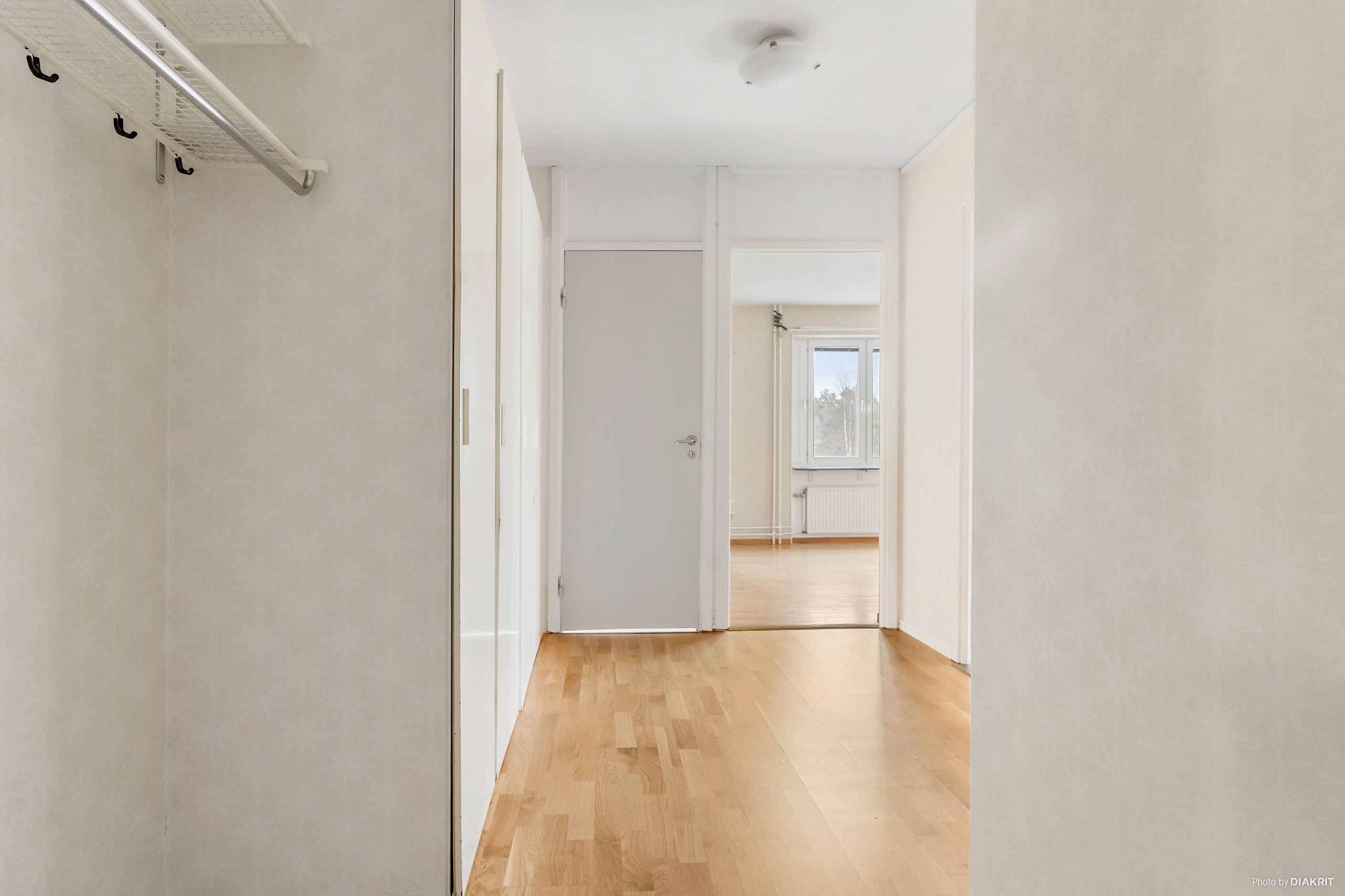Här välkomnas du in i en rymlig hall med gott om förvaring. hallen har tapetserade väggar och ett klickgolv. Från hallen når du köket med ljusa köksluckor, gott om förvaring, diskbänk i rostfritt stål, tapetserade väggar och ett klickgolv.