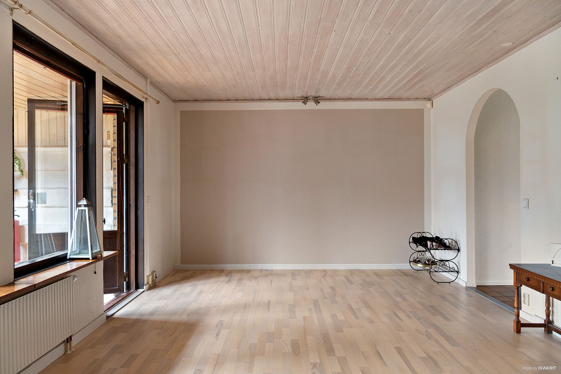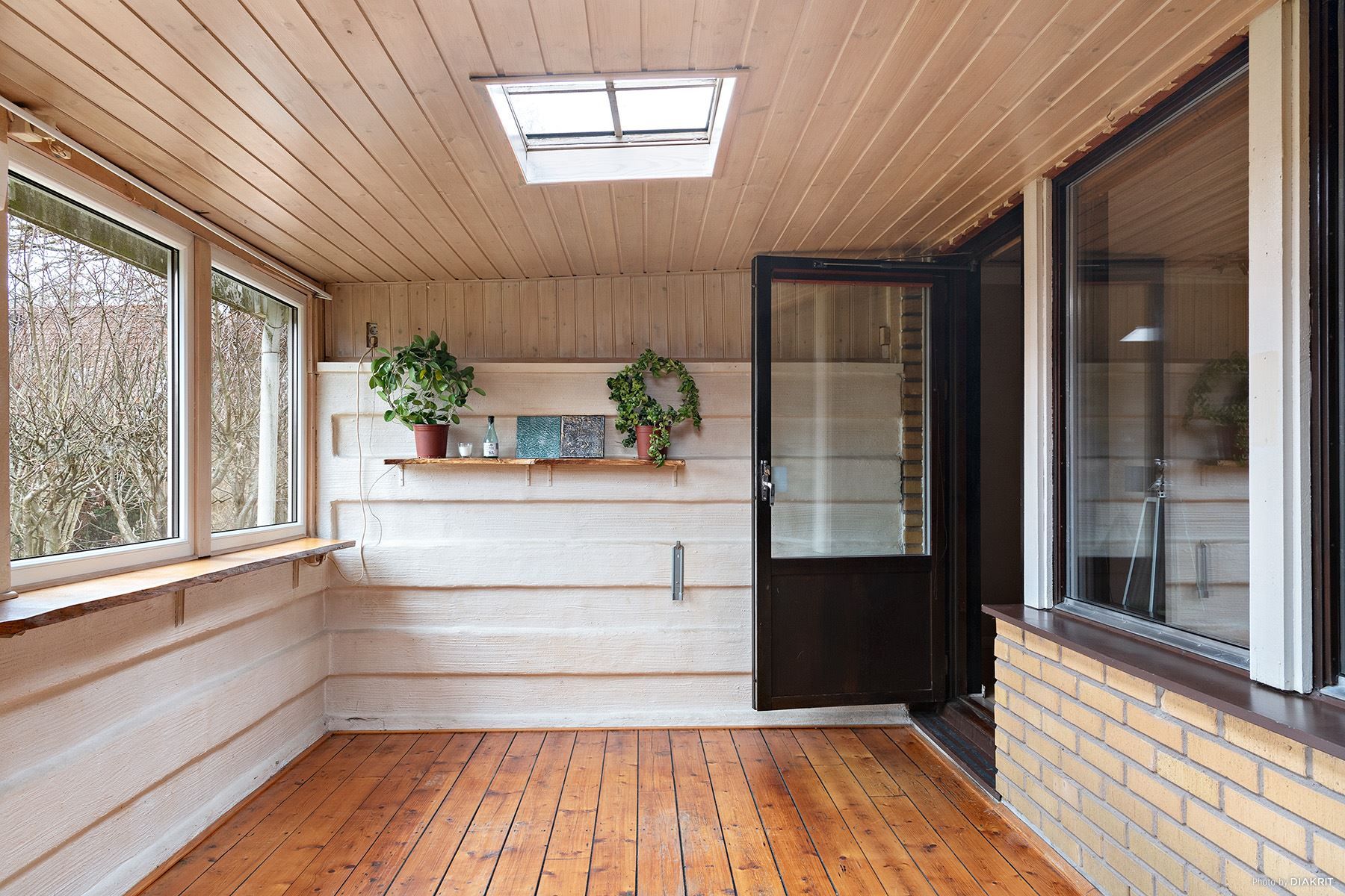 Vid entrén möts du av en stenlagd uteplats som skapar ett inbjudande första intryck. Här finns även ett praktiskt förråd för extra förvaring. När du kliver in i bostaden välkomnas du av en rymlig hall med gott om plats för ytterkläder och skor. Till vänster ligger det generösa köket med plats för en matgrupp – en naturlig samlingsplats för familj och vänner. I anslutning finns en praktisk tvättstuga utrustad med tvättmaskin och torktumlare. På entréplanet finns också ett badrum med dusch samt ett stort och ljust vardagsrum med utgång till den insynsskyddade trädgården. Här kan du njuta av ett härligt inglasat uterum som förlänger utesäsongen och ger extra yta för umgänge och avkoppling.