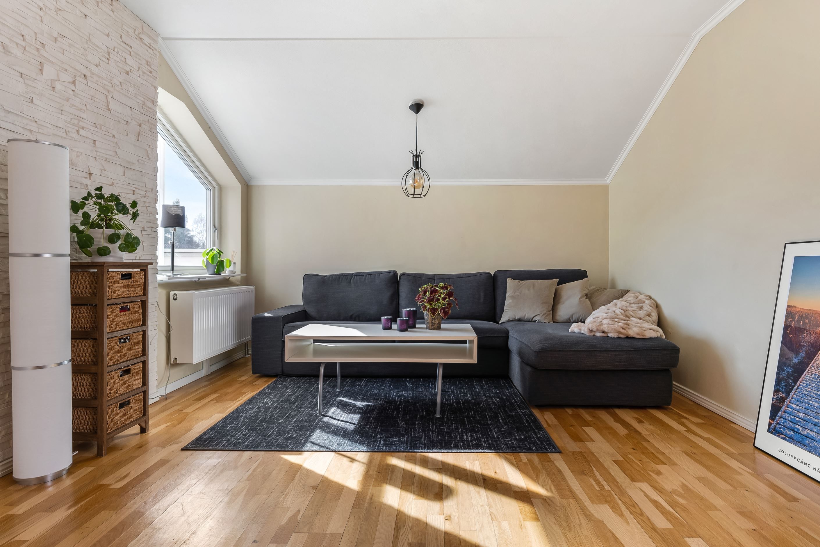 Ljuset flödar från fönster i flera väderstreck och här investerar du i en förening som genomgår en stor förändring i form av ett helt nytt område med gångväg ner till badplats med bastu, carportar, nya entréer, grönområden, balkonger m.m.