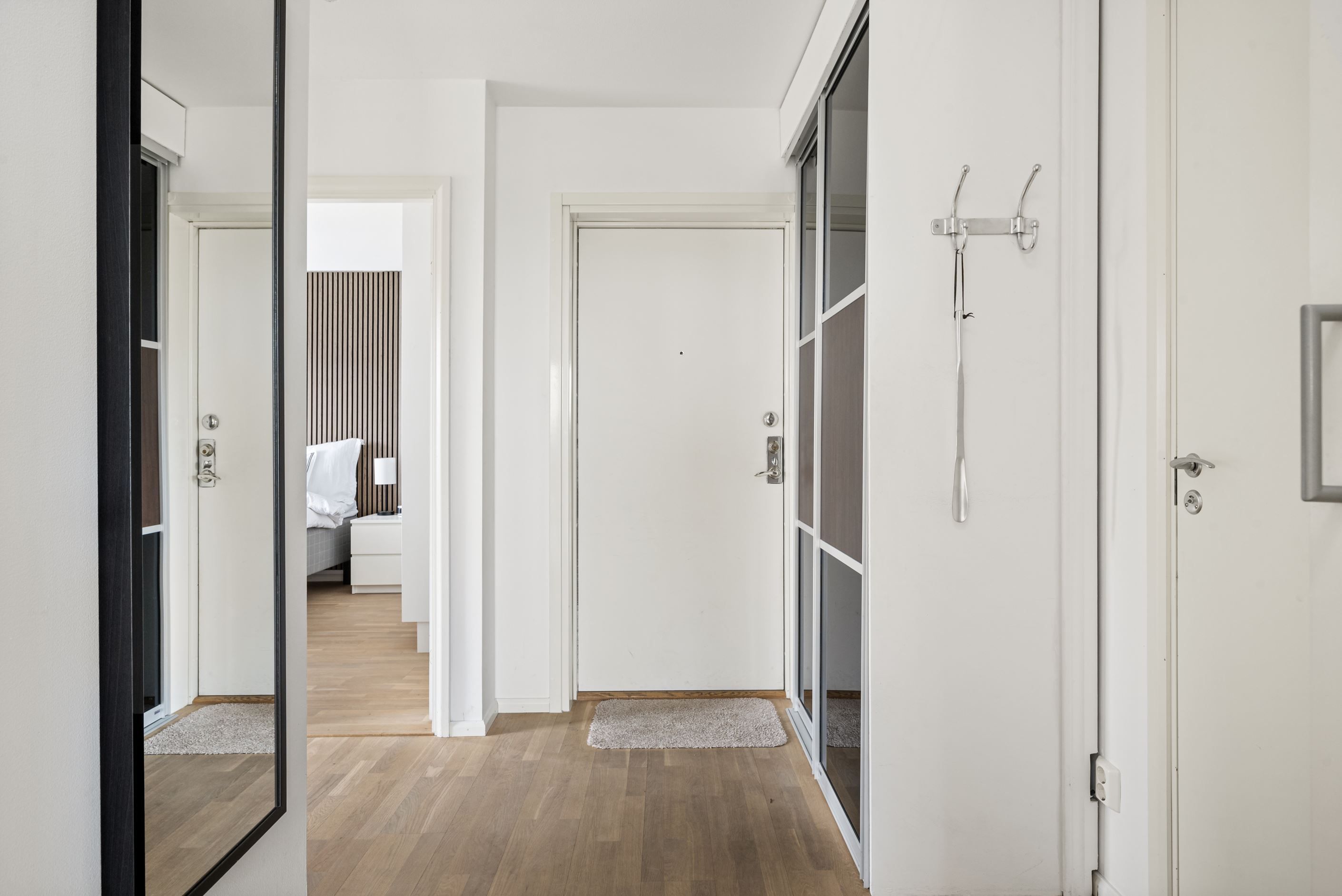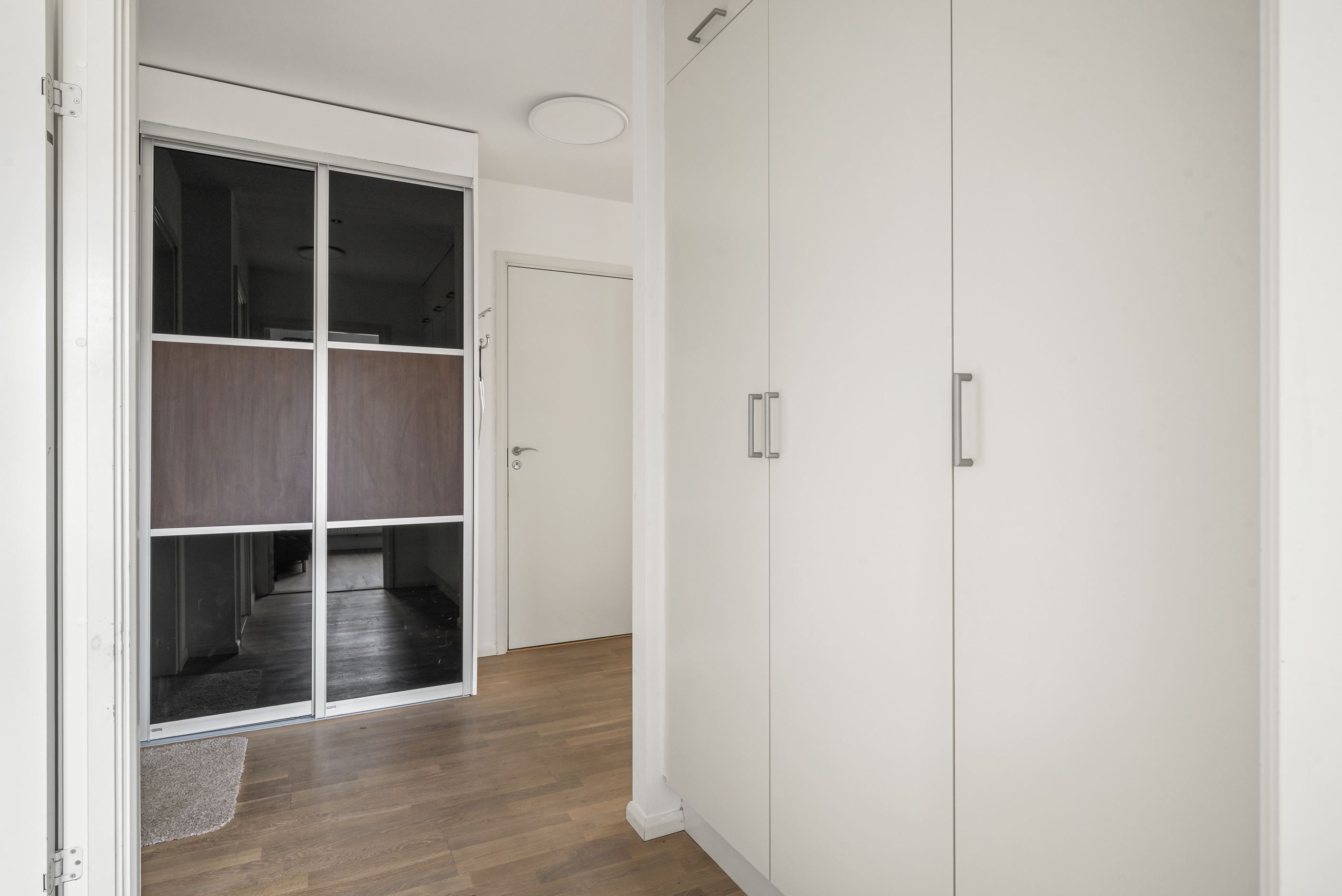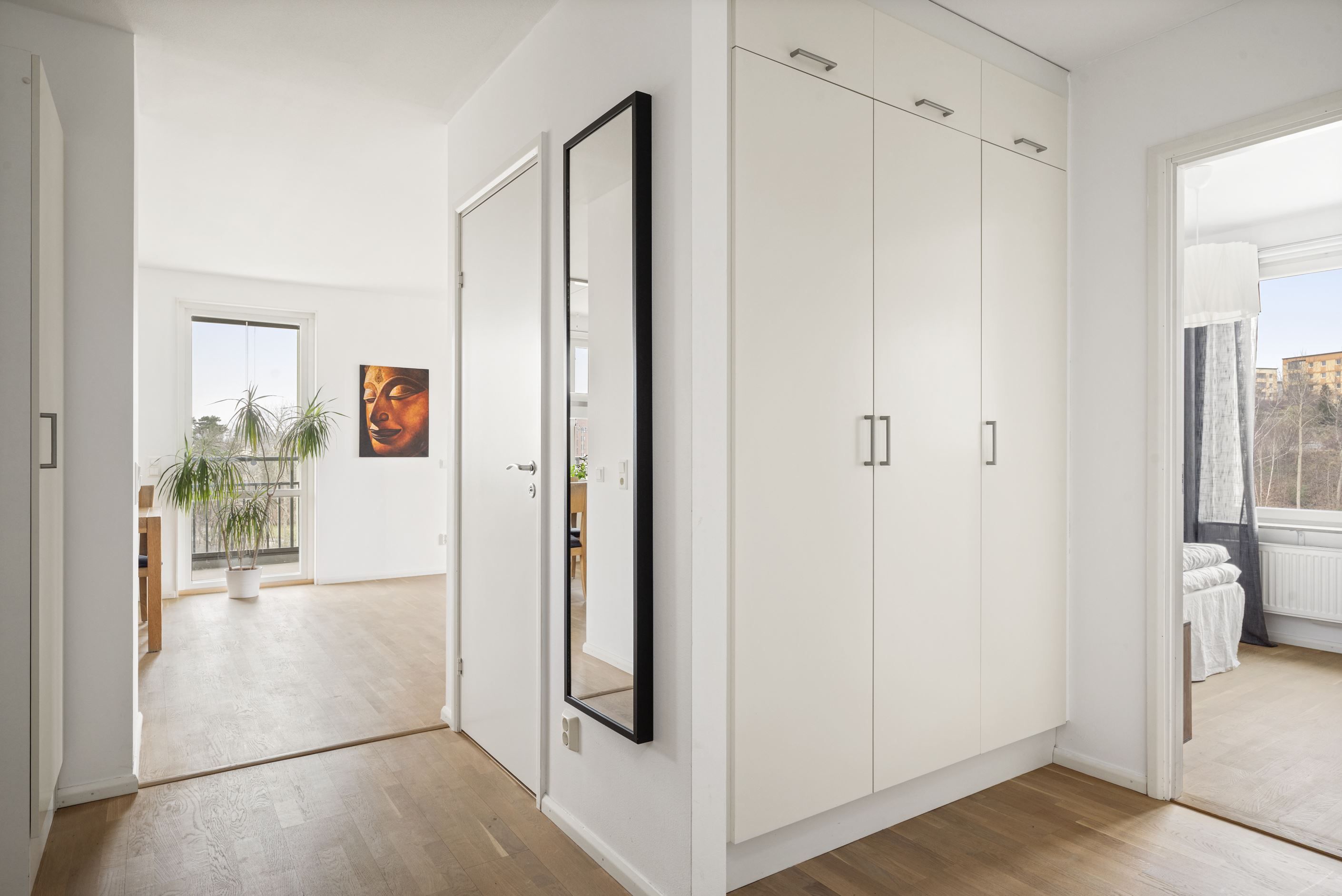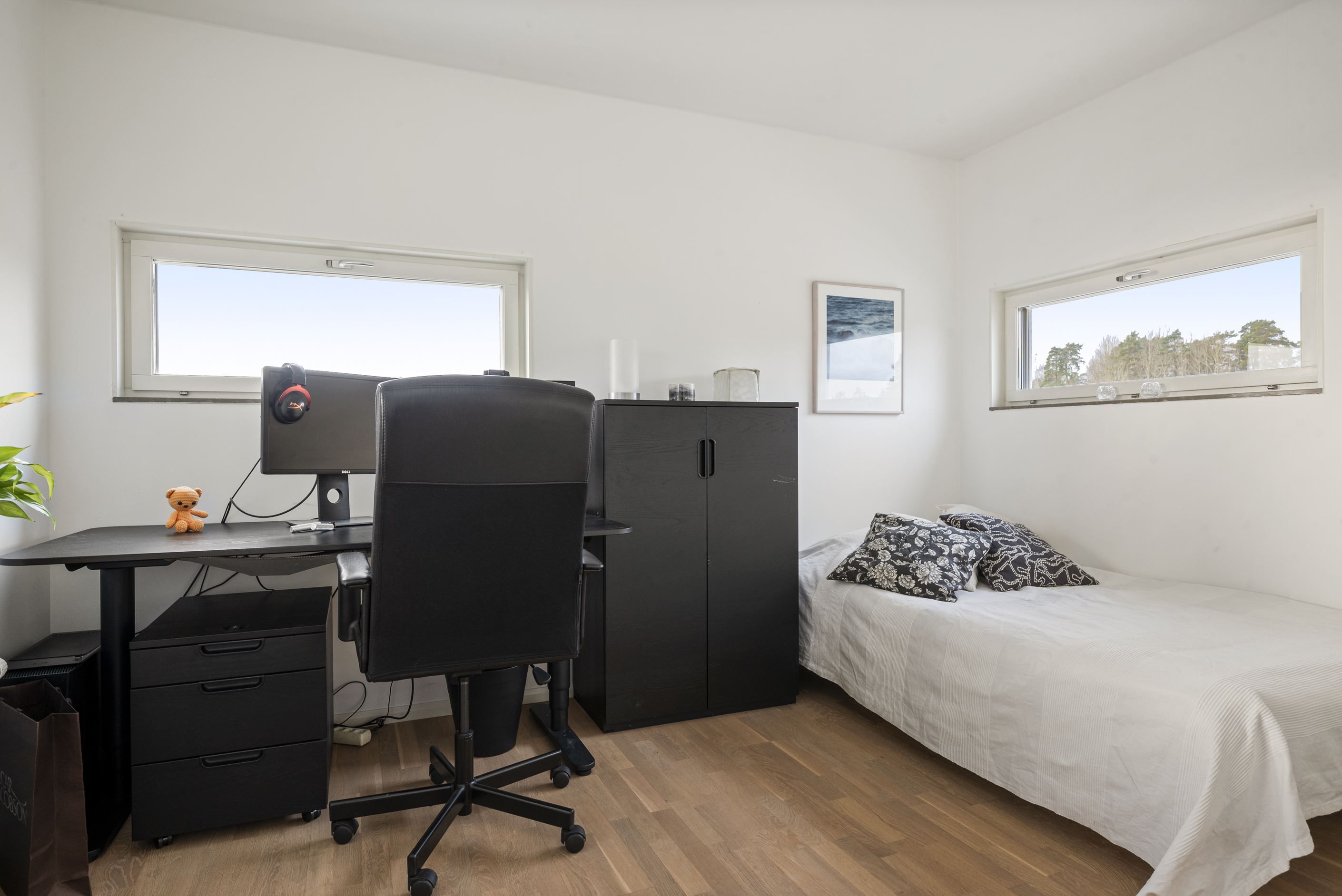 Till höger från hallen ligger ett stort sovrum med plats för dubbelsäng och gott om förvaring i fyra garderober. Intill ligger ytterligare ett mindre sovrum som passar perfekt som barnrum, gästrum eller hemmakontor. I hallen finns också ett fräscht badrum med dusch, tvättmaskin och torktumlare samt en praktisk gäst-WC. Från vardagsrummet nås det tredje sovrummet, där ljusinsläpp från tre väderstreck skapar en härligt ljus och harmonisk atmosfär.