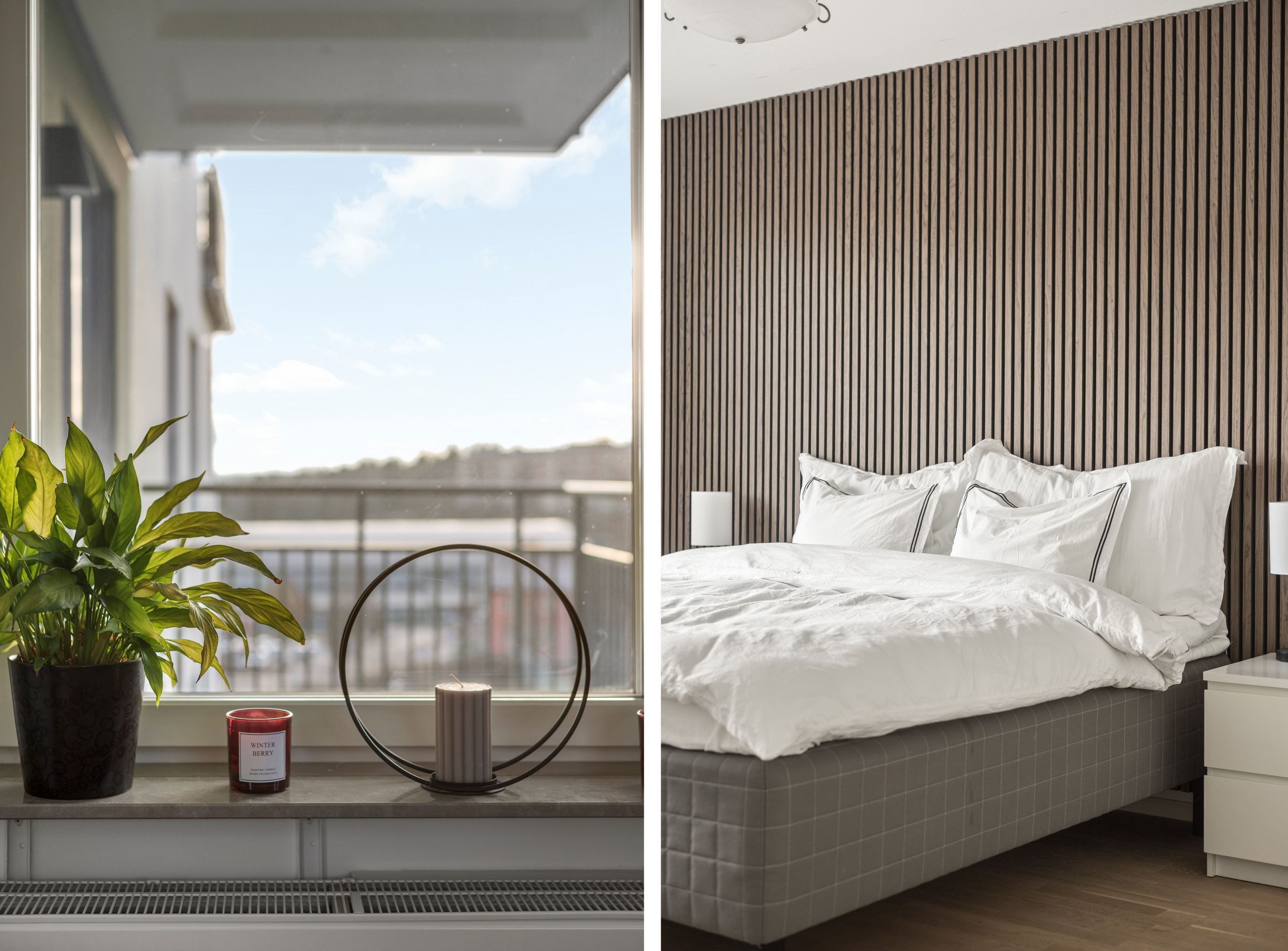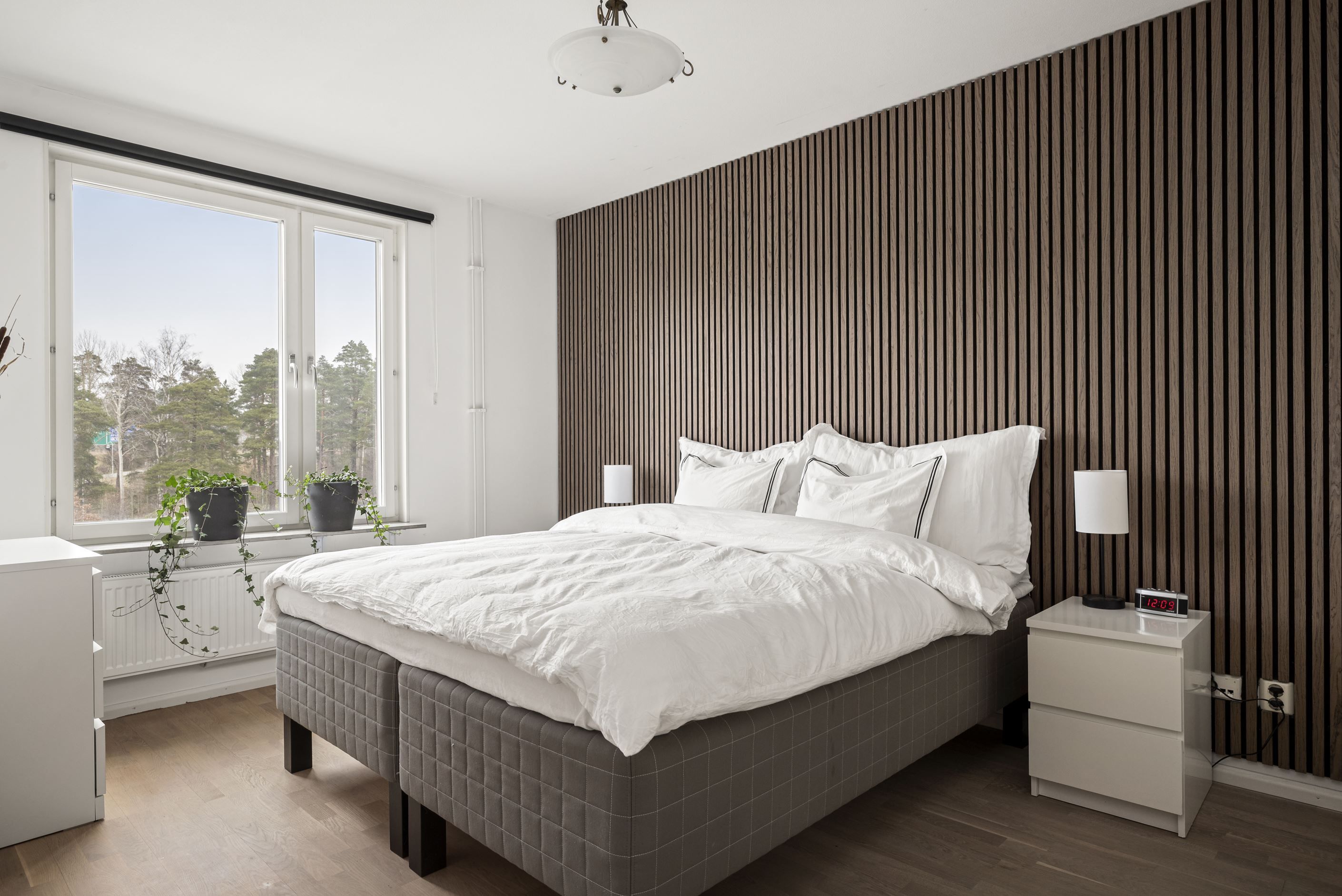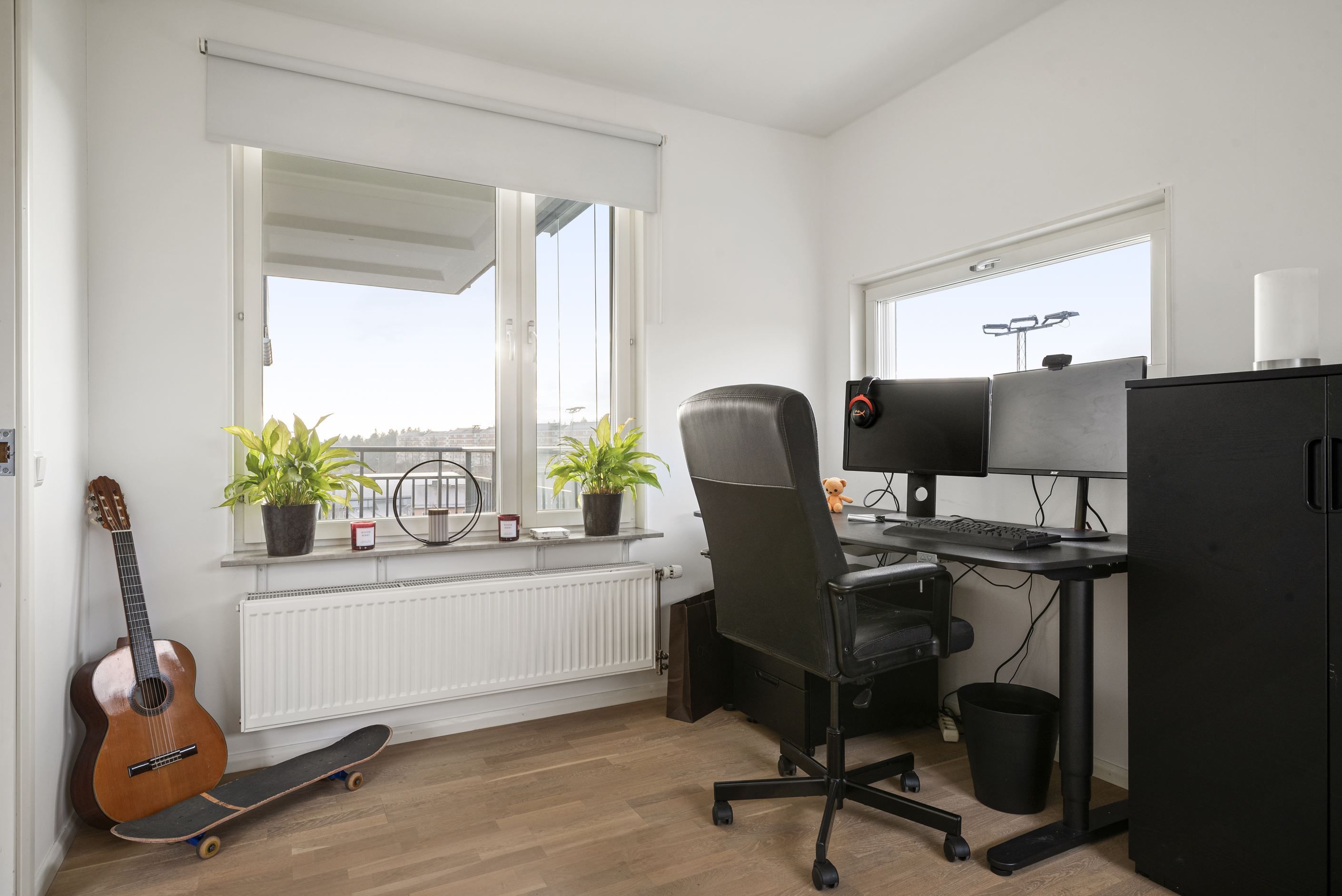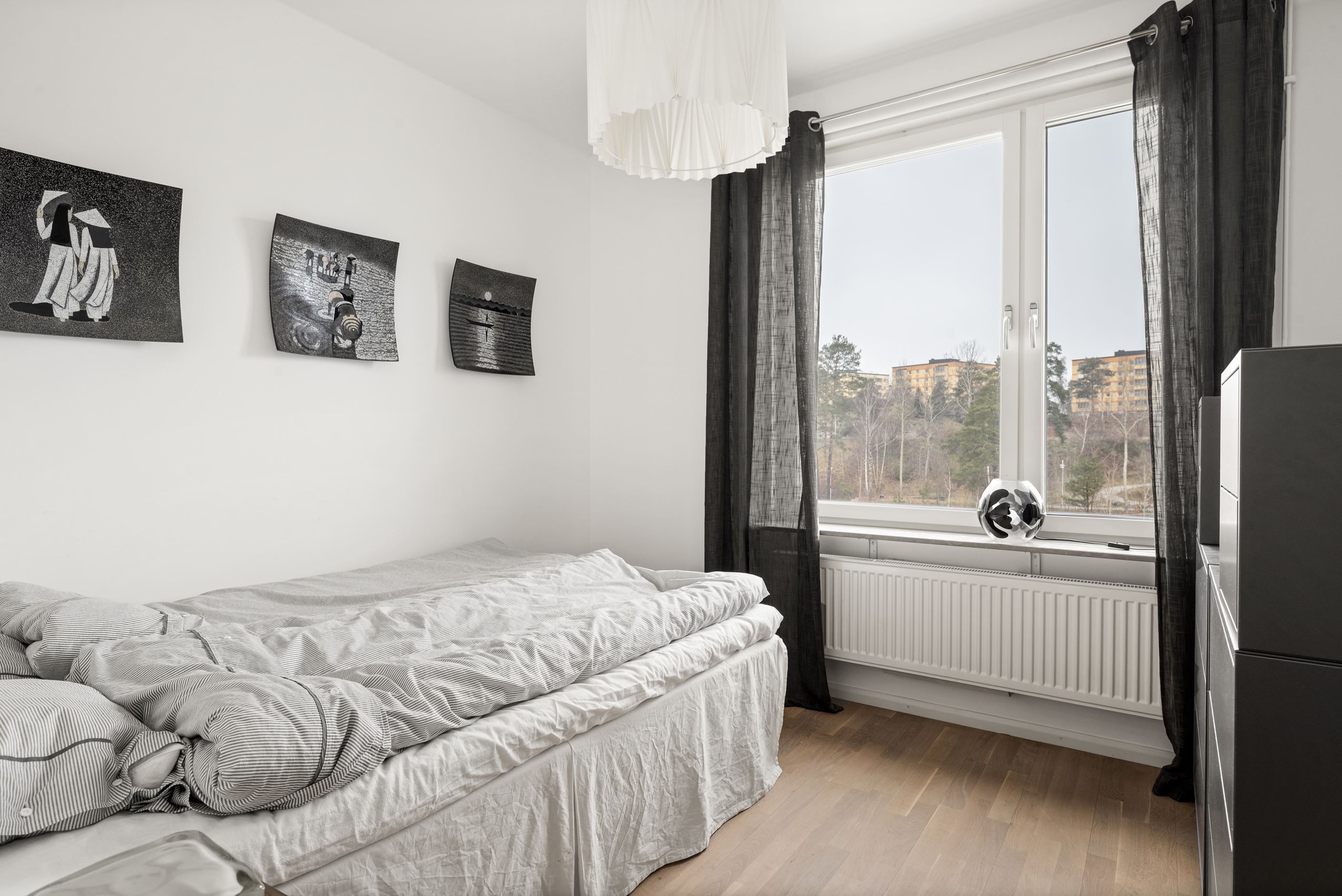 Till höger från hallen ligger ett stort sovrum med plats för dubbelsäng och gott om förvaring i fyra garderober. Intill ligger ytterligare ett mindre sovrum som passar perfekt som barnrum, gästrum eller hemmakontor. I hallen finns också ett fräscht badrum med dusch, tvättmaskin och torktumlare samt en praktisk gäst-WC. Från vardagsrummet nås det tredje sovrummet, där ljusinsläpp från tre väderstreck skapar en härligt ljus och harmonisk atmosfär.