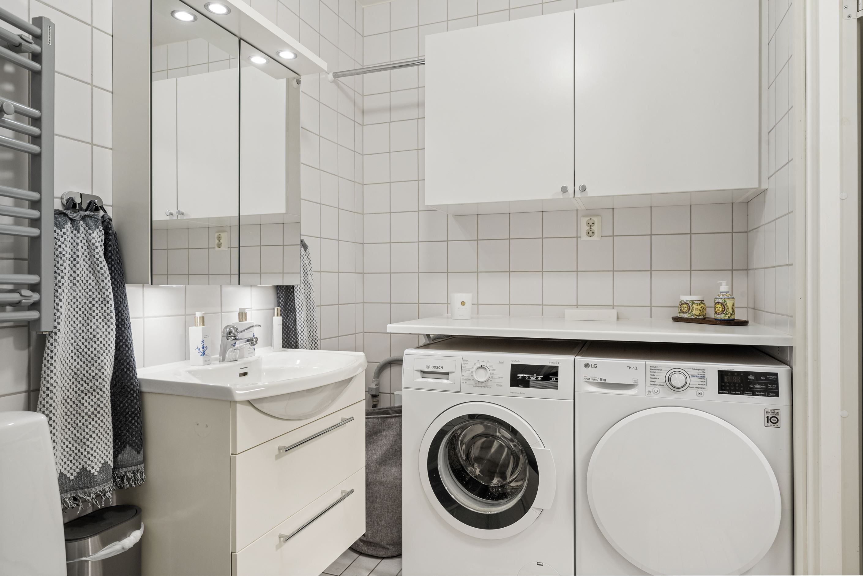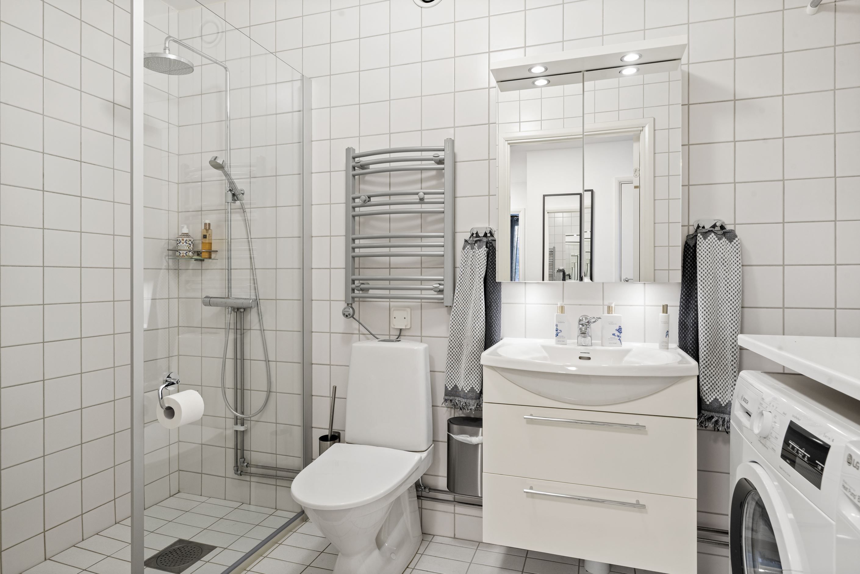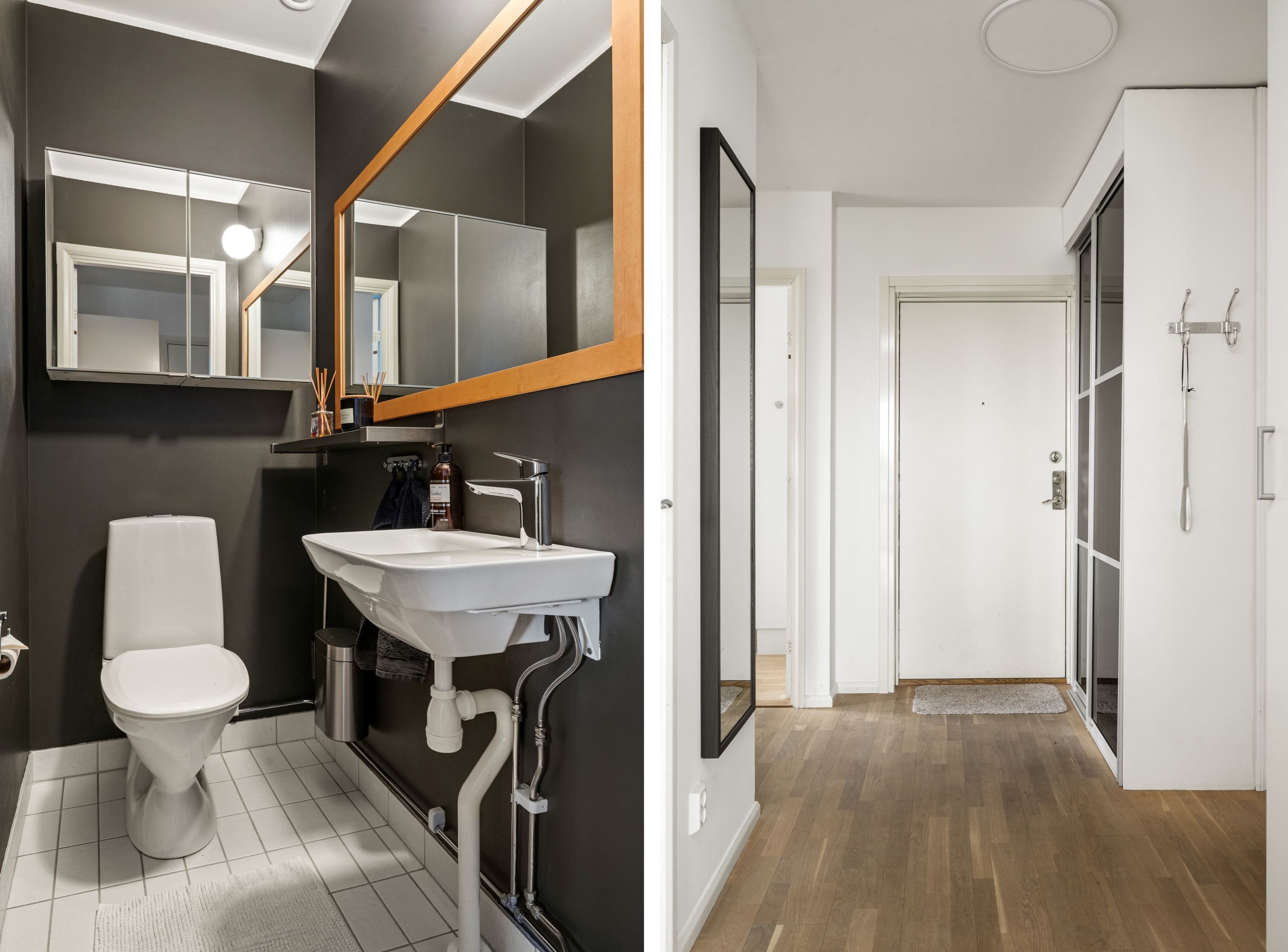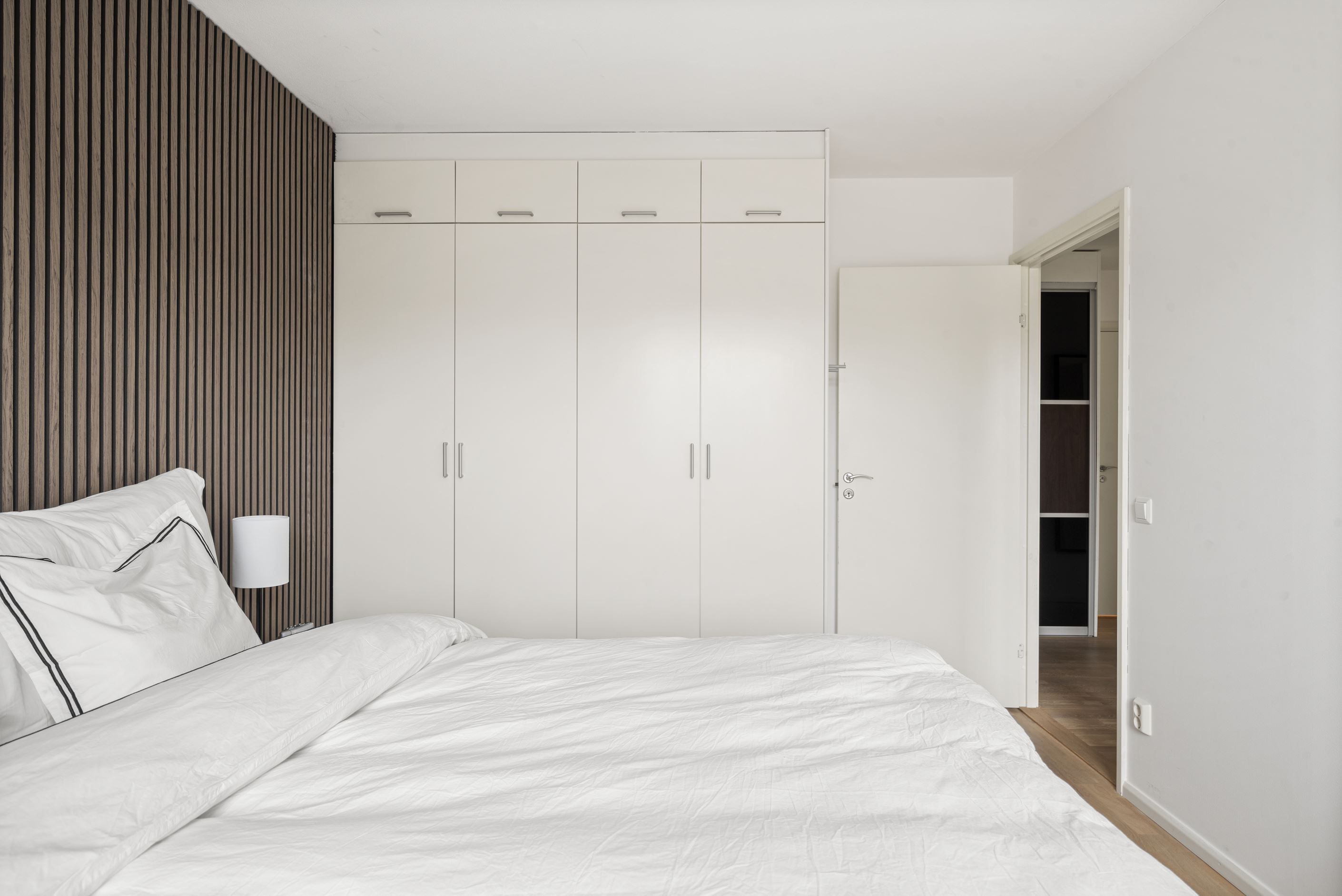 Till höger från hallen ligger ett stort sovrum med plats för dubbelsäng och gott om förvaring i fyra garderober. Intill ligger ytterligare ett mindre sovrum som passar perfekt som barnrum, gästrum eller hemmakontor. I hallen finns också ett fräscht badrum med dusch, tvättmaskin och torktumlare samt en praktisk gäst-WC. Från vardagsrummet nås det tredje sovrummet, där ljusinsläpp från tre väderstreck skapar en härligt ljus och harmonisk atmosfär.