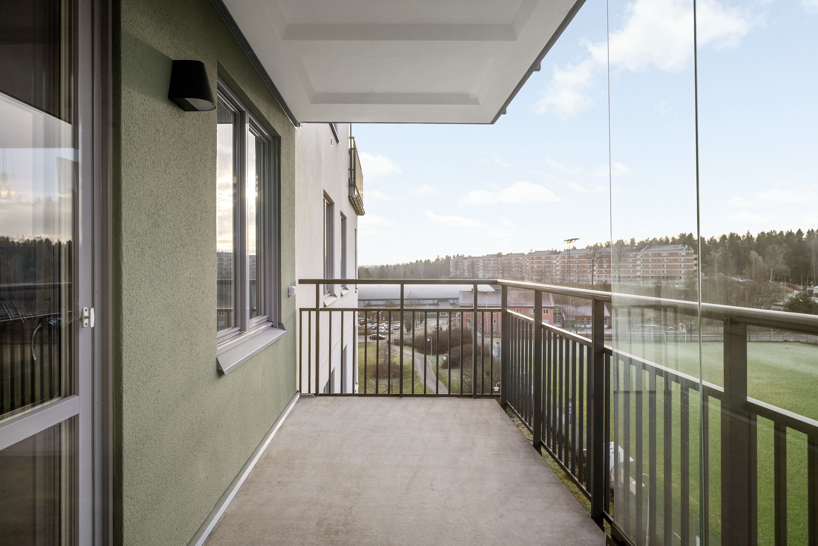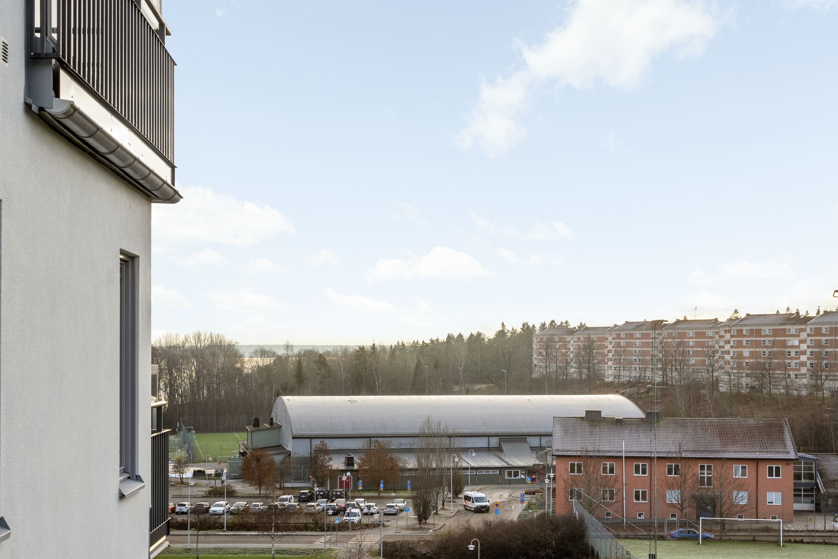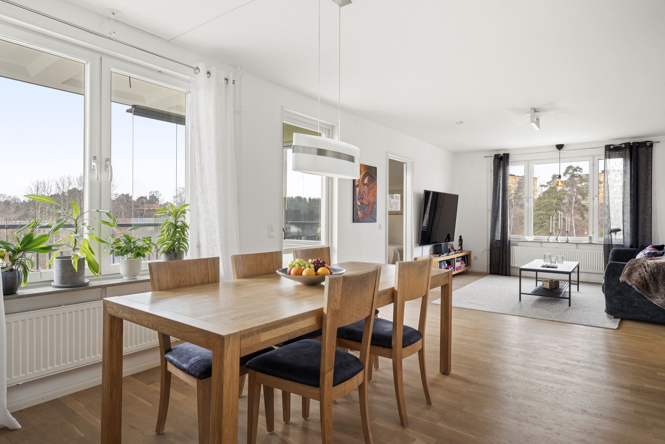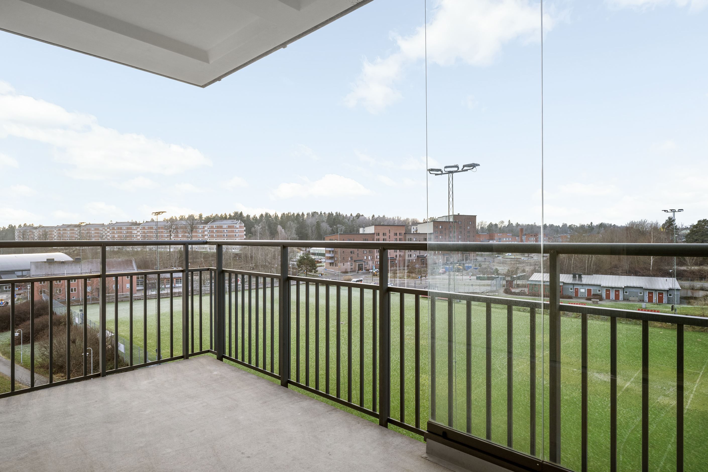 Från vardagsrummet når du den stora, delvis inglasade balkongen i soligt söder- och västerläge. Här kan du njuta av solen från lunch till kväll – en naturlig förlängning av hemmet under årets varmare månader.