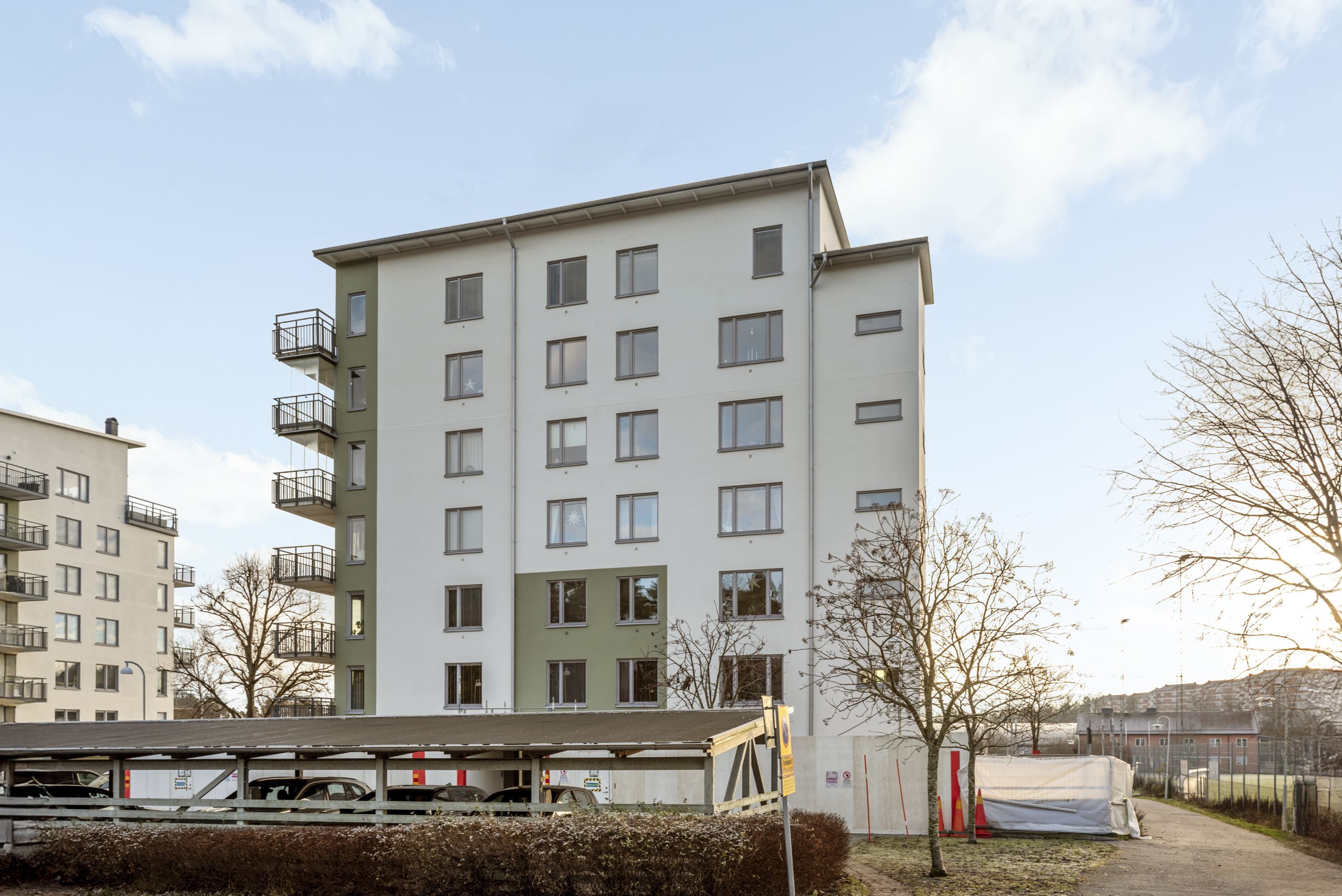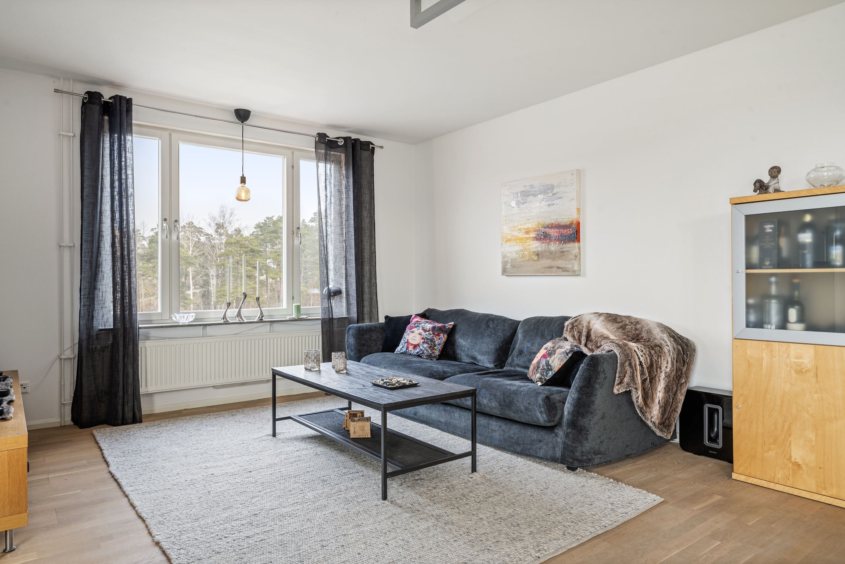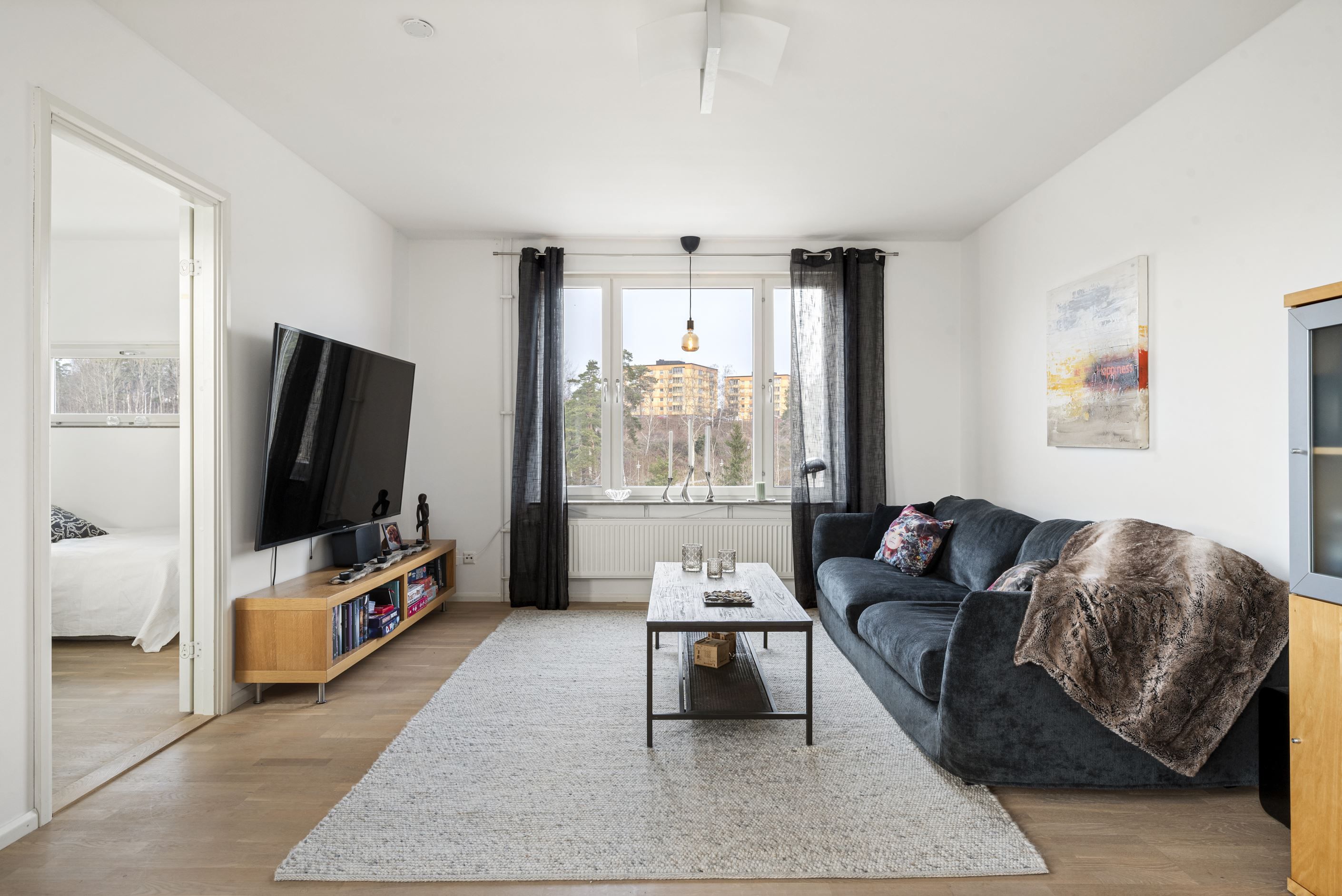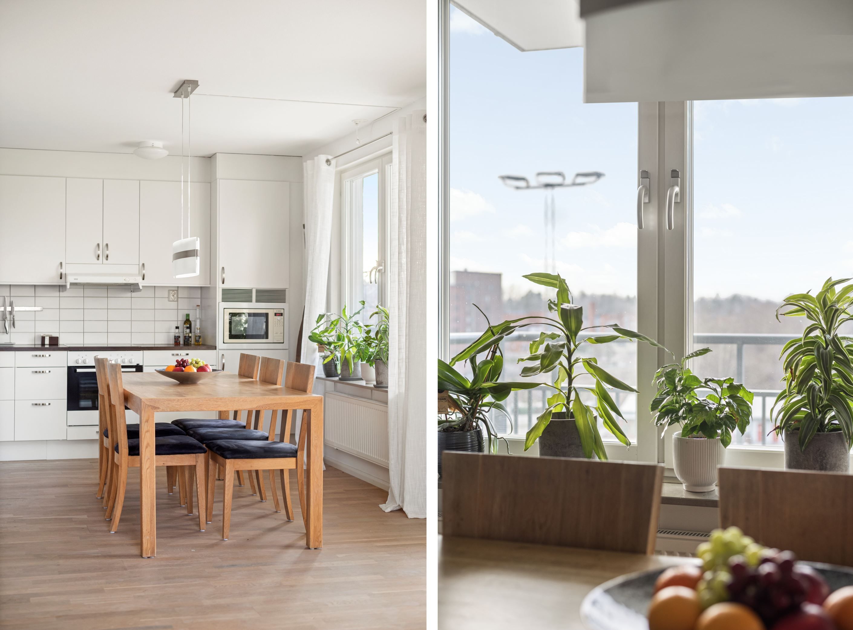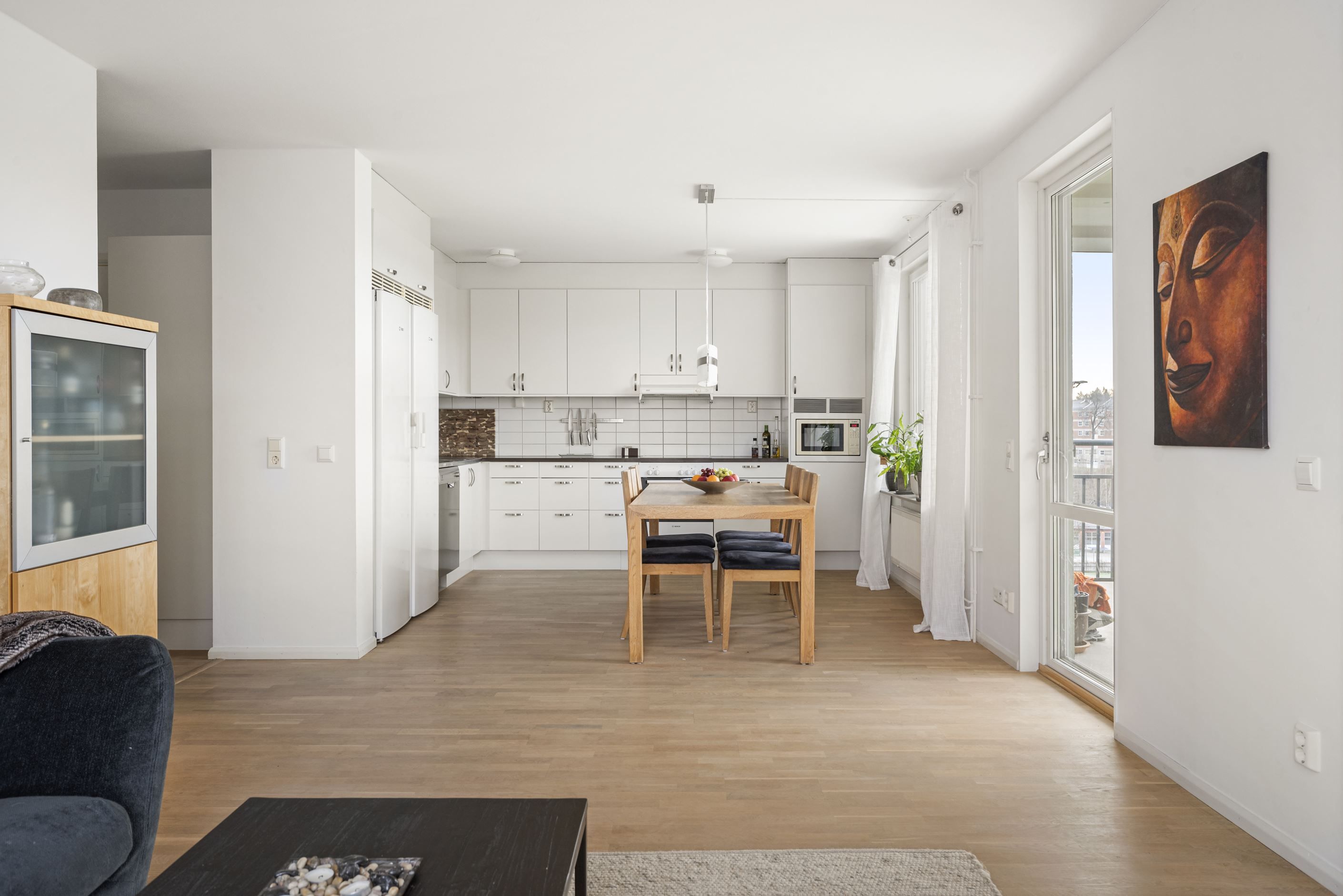 Från vardagsrummet når du den stora, delvis inglasade balkongen i soligt söder- och västerläge. Här kan du njuta av solen från lunch till kväll – en naturlig förlängning av hemmet under årets varmare månader.