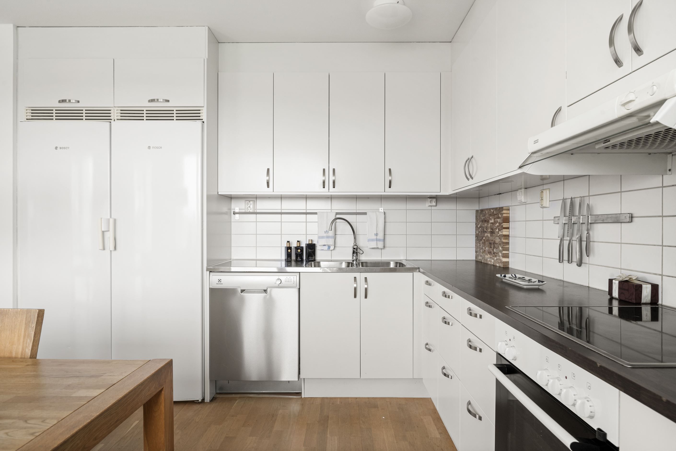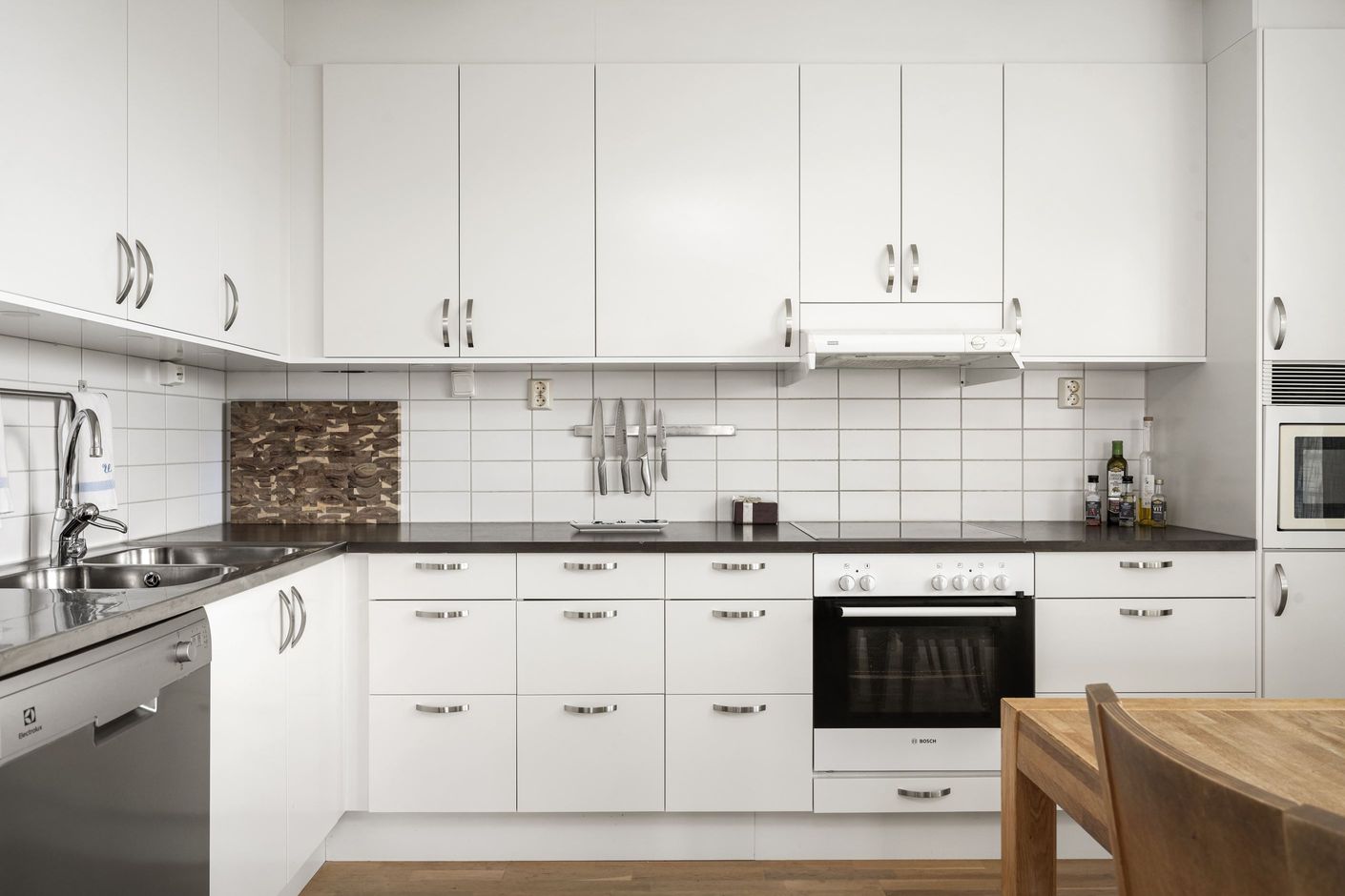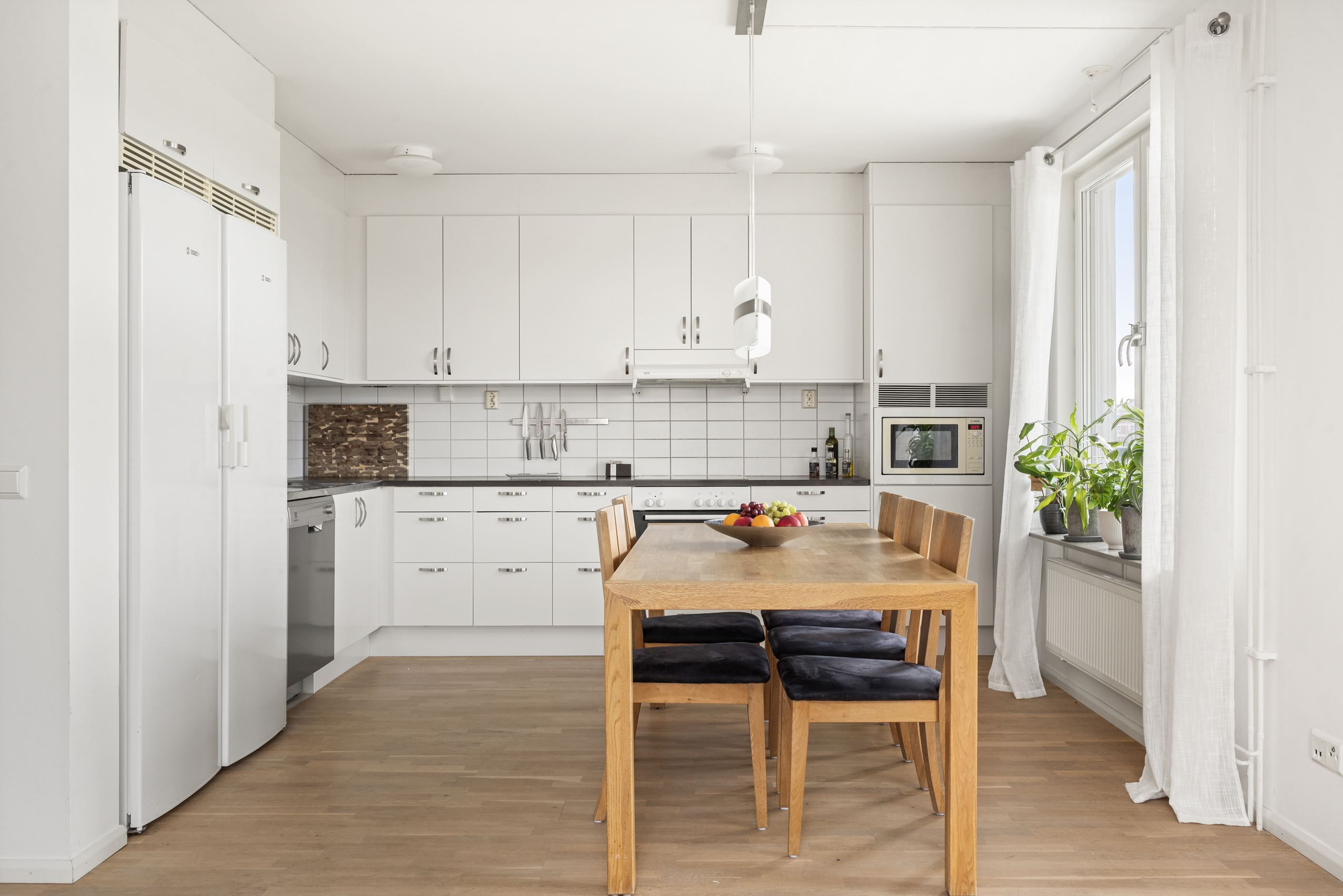 Hallen är rymlig med gott om plats för ytterkläder och skor. Vidare öppnar hemmet upp sig i ett stort, ljust vardagsrum och kök i en social och trevlig öppen planlösning. Här finns utrymme för både en generös soffgrupp, tv-möbel och ett stort matbord i direkt anslutning till köket – perfekt för middagar, umgänge och familjeliv.