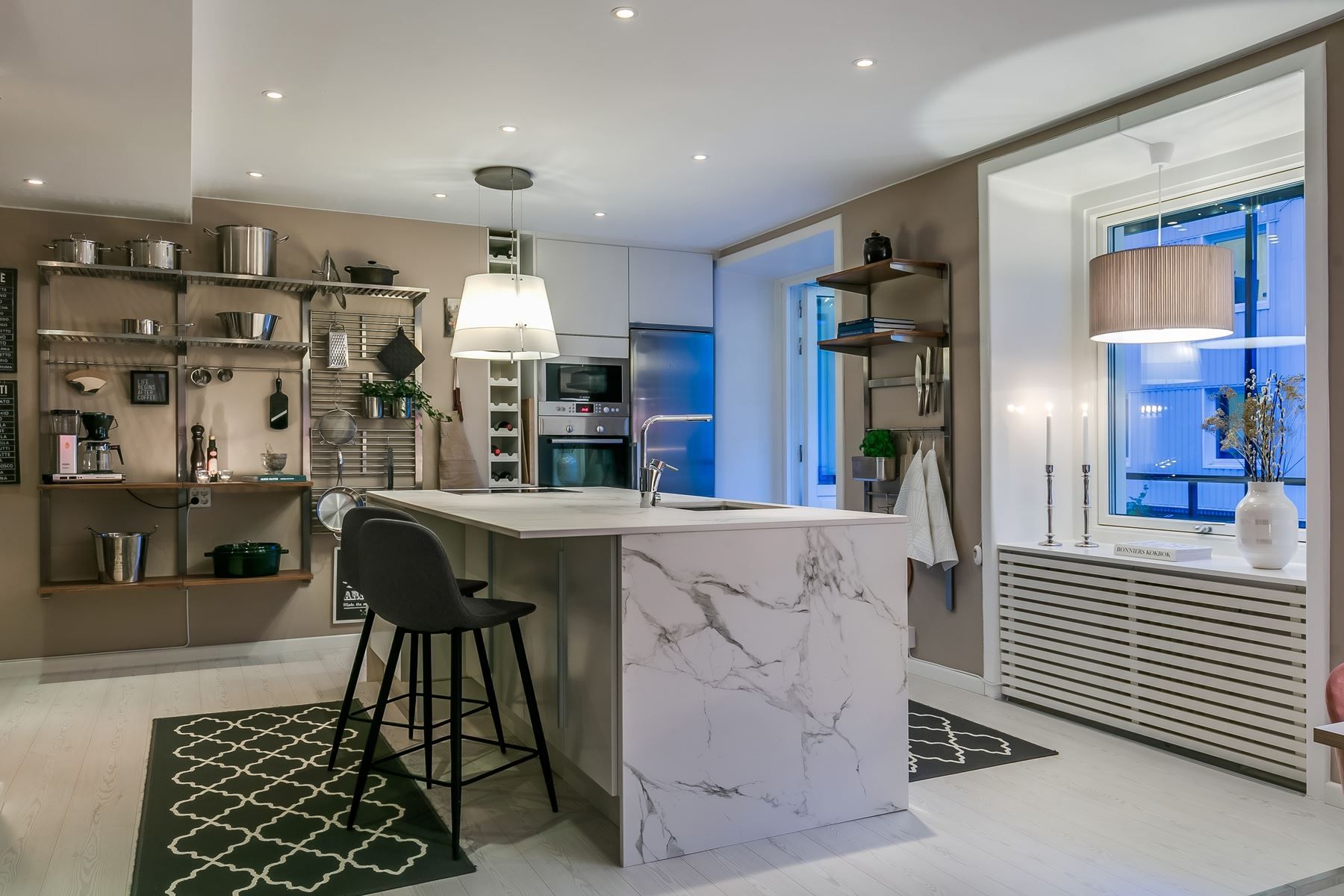 Genomgående exklusiva materialval samt en genomtänkt planlösning ger tillsammans med stora fönsterpartier en härlig rymd och ett fint ljusinsläpp.