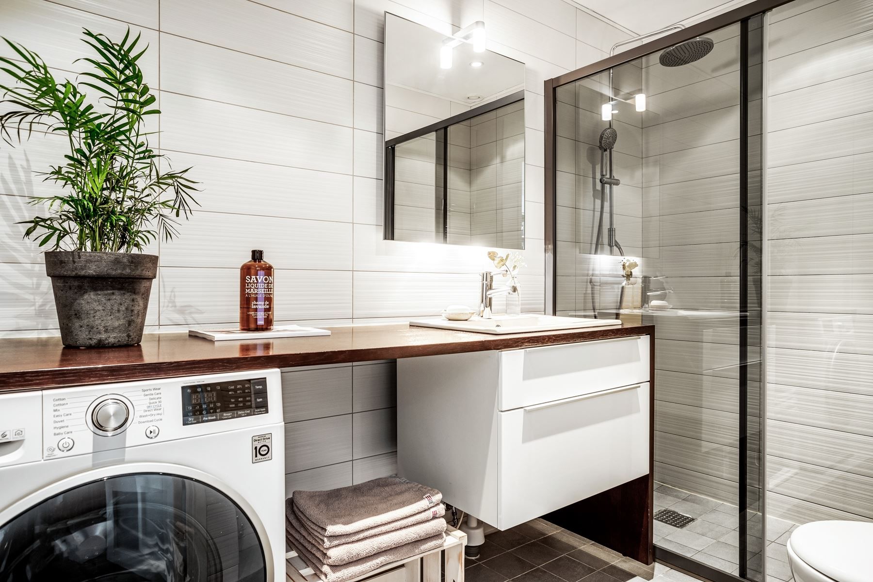 Exklusivt renoverat kök med köksö och stilfullt badrum med tvättmaskin.