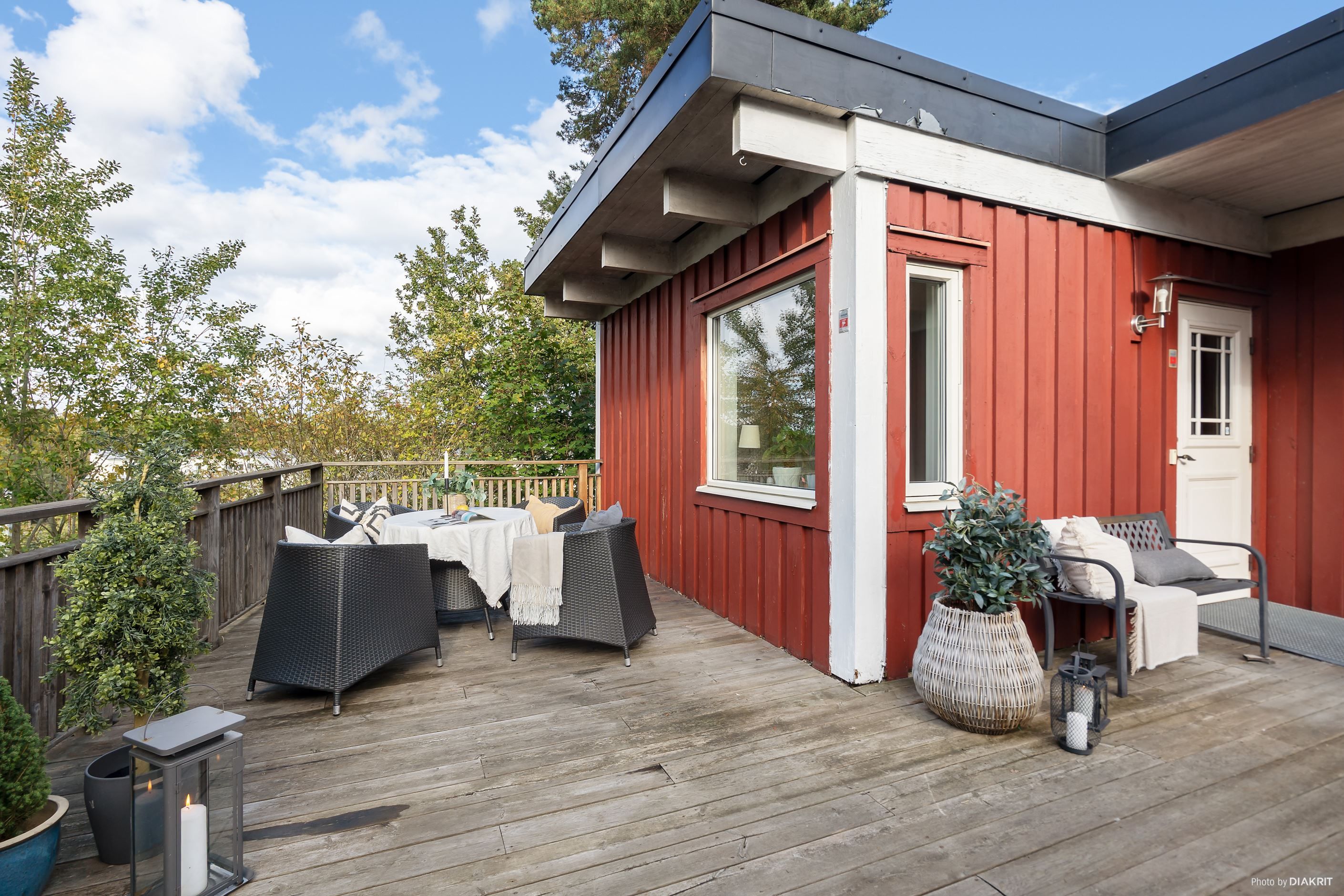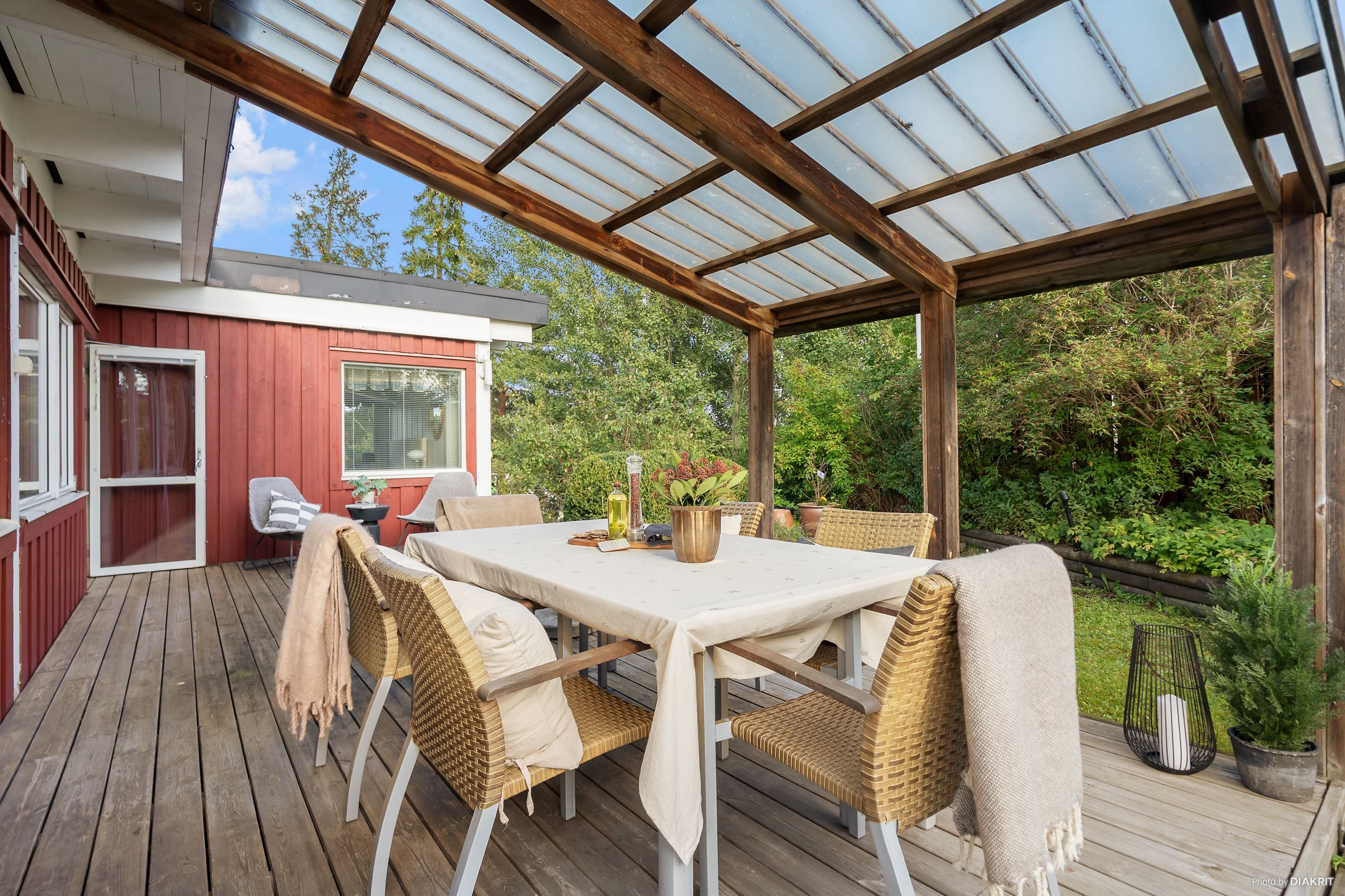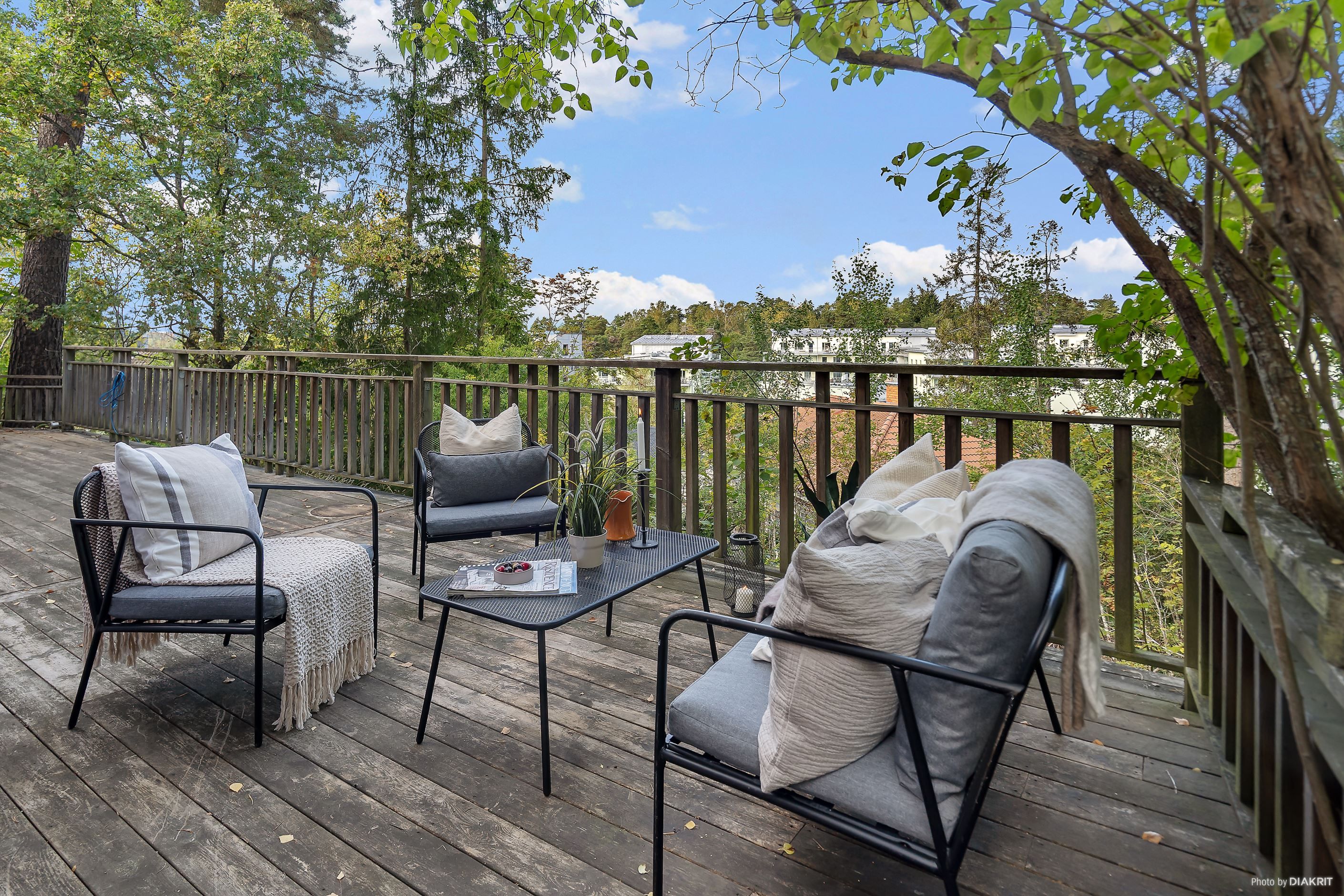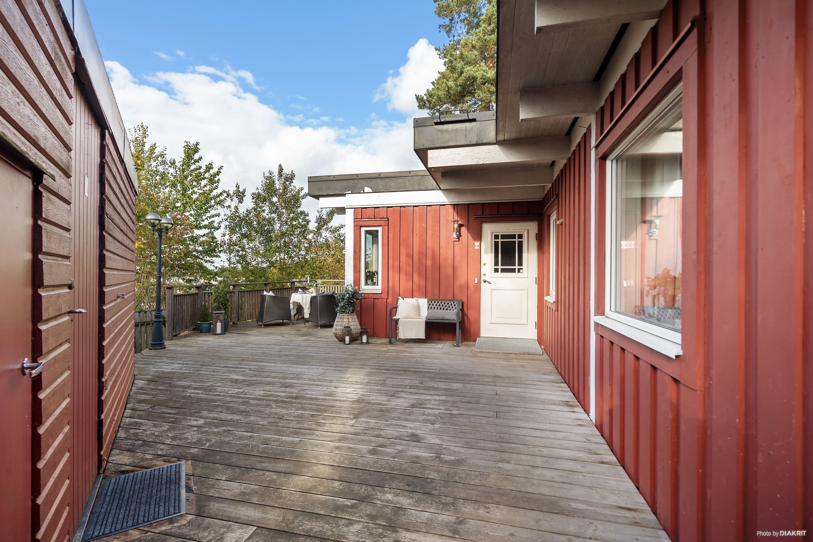 Trädgården som är på ca 500 kvm kvm, är en lagom stor och en privat oas och för slappa sommardagar finns flera stora terrasser i samtliga väderstreck. Här finns också praktiskt förråd med arbetsbänk och förvaringshyllor.