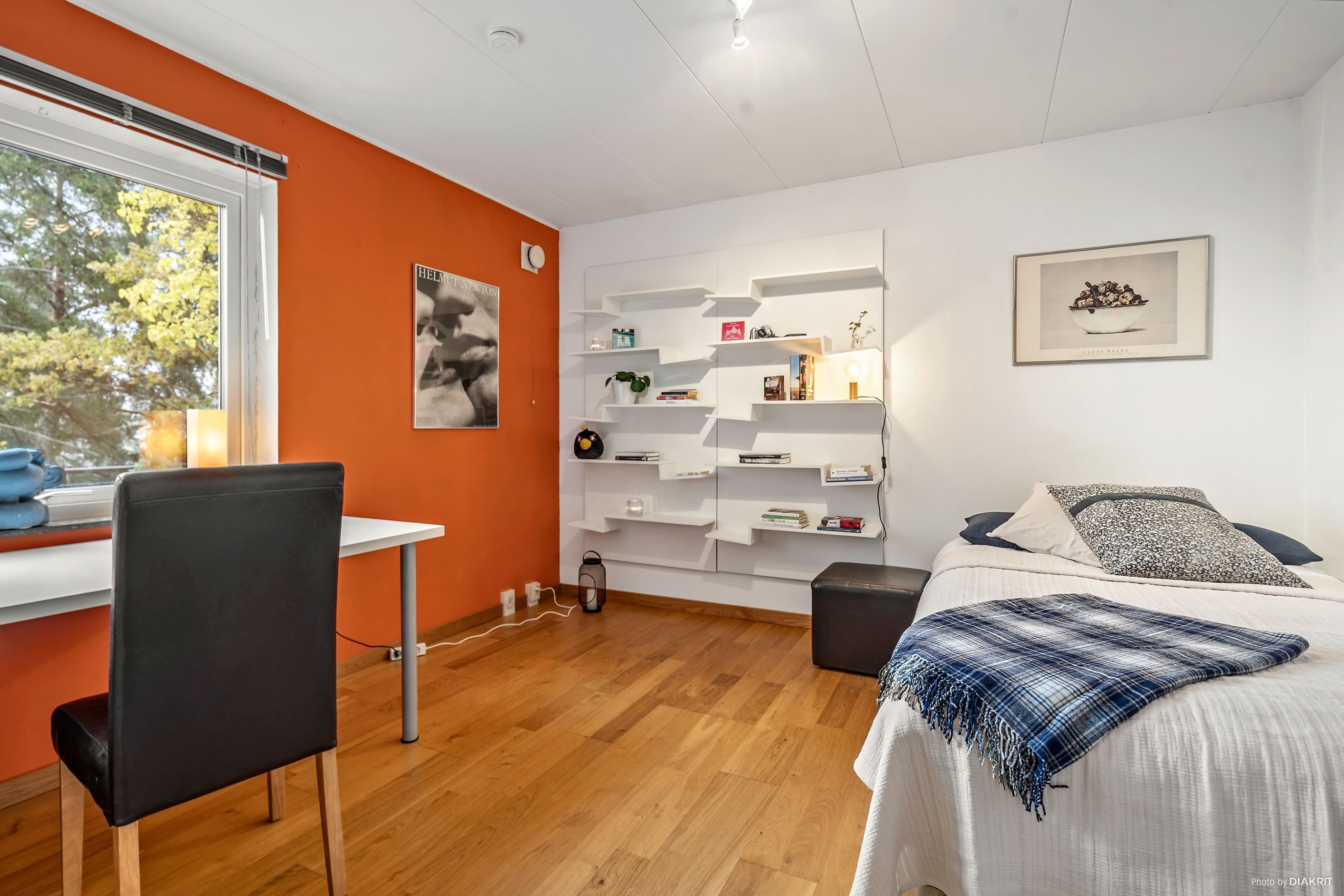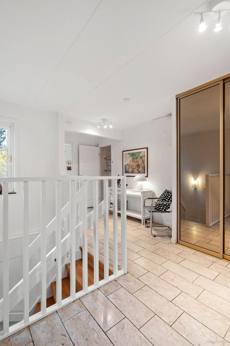 I sluttningsvåningen som ni når via trappan i ek, finns en stor ungdomsavdelning/allrum med utgång till den skyddade terrassen, rymligt sovrum, wc-rum och duschavdelning samt större förrådsdel.