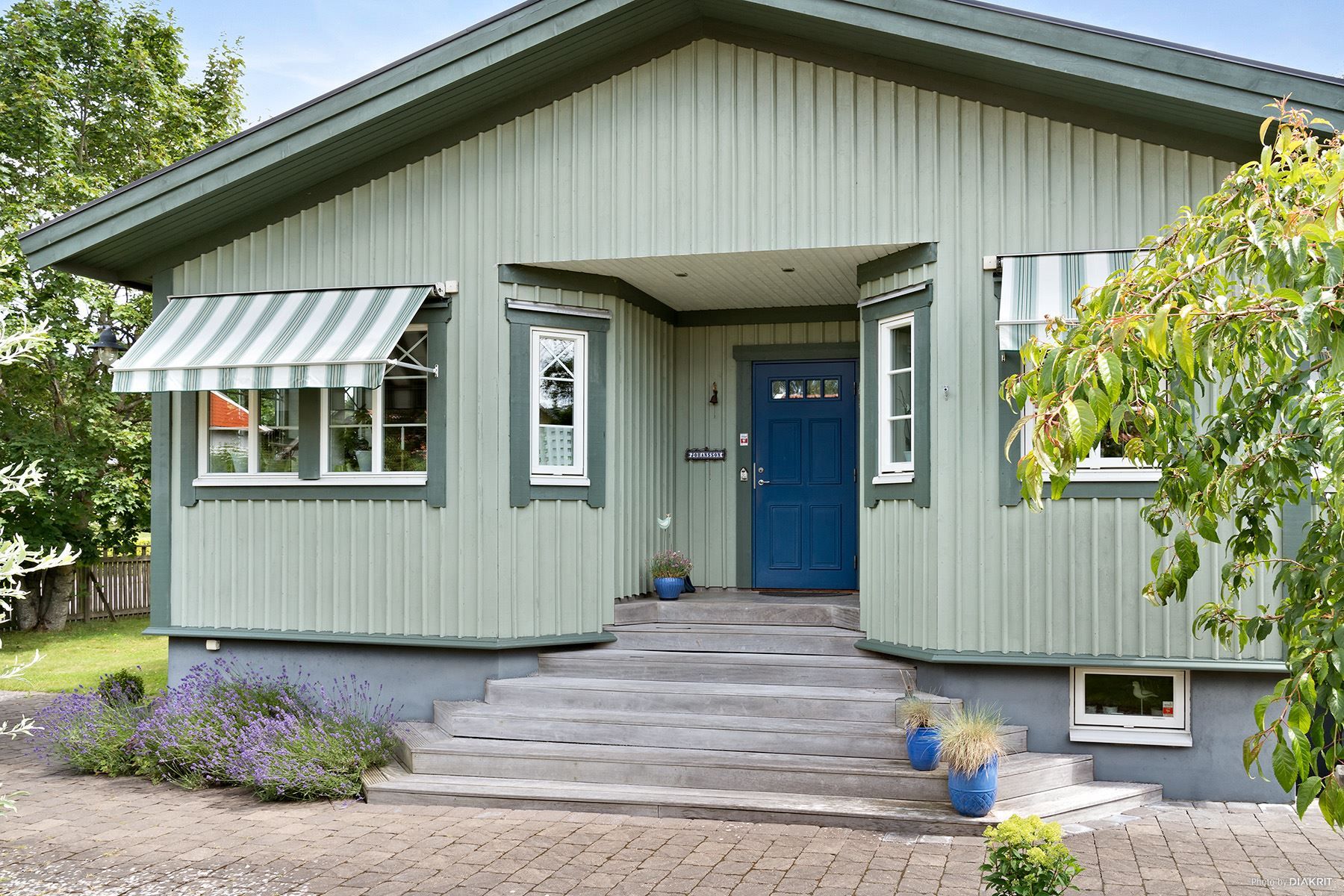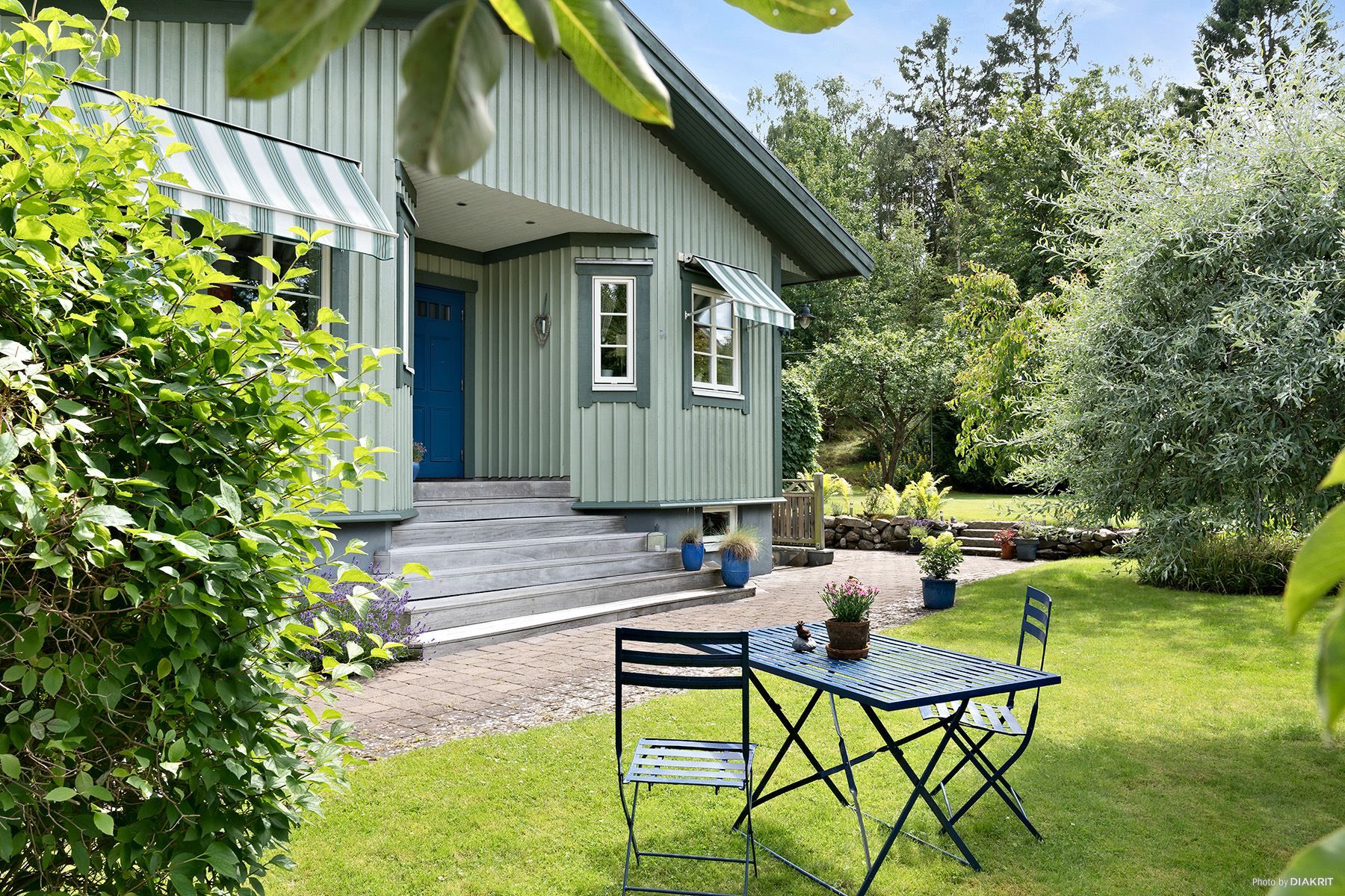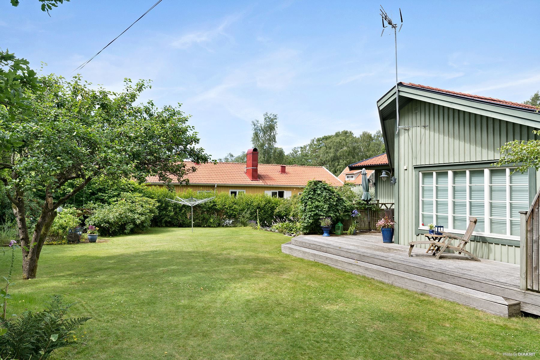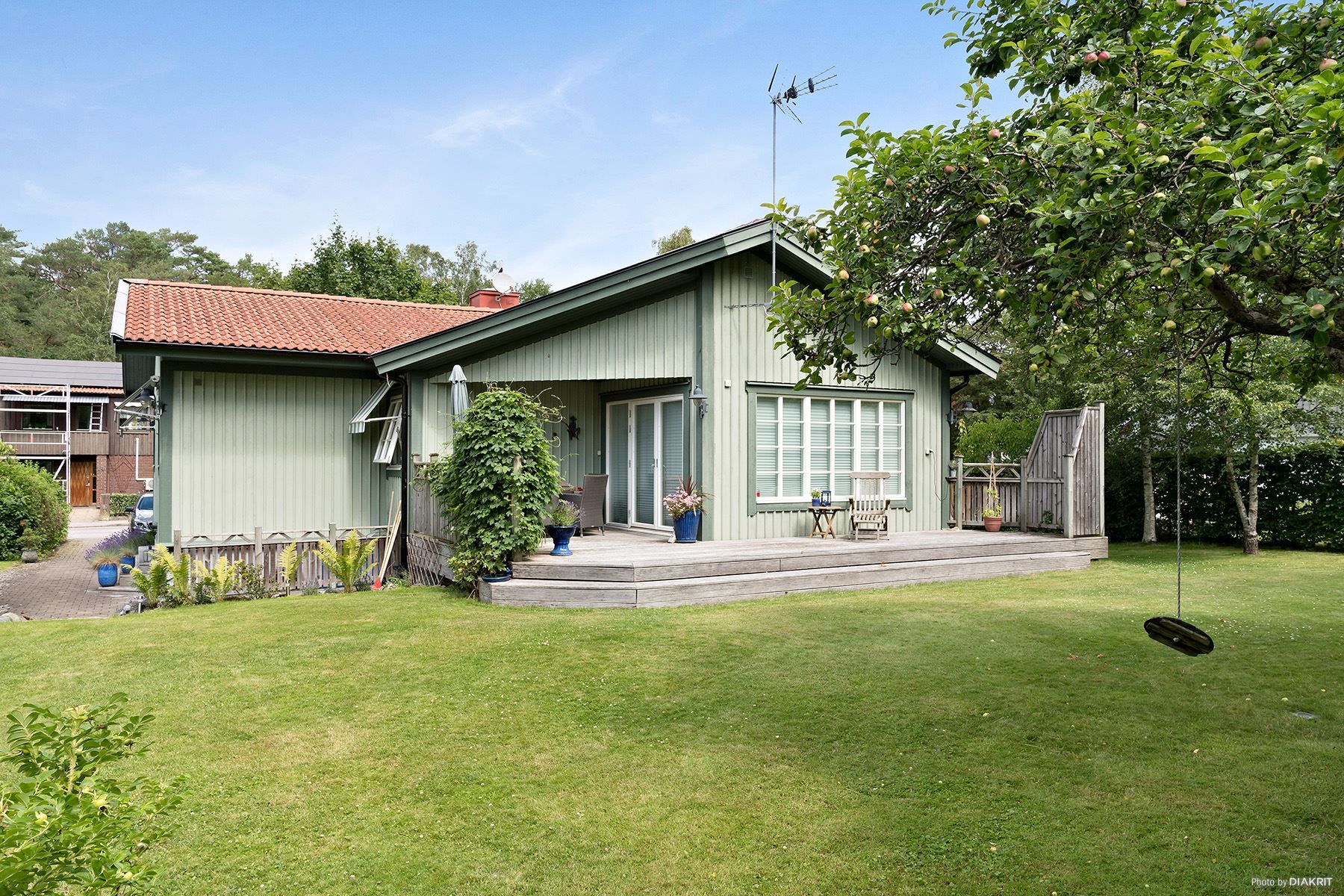 Huset står på en lättskött, lummig och barnvänlig naturtomt med fruktträd, bärbuskar, välskött gräsmatta och soligt sydvästläge.