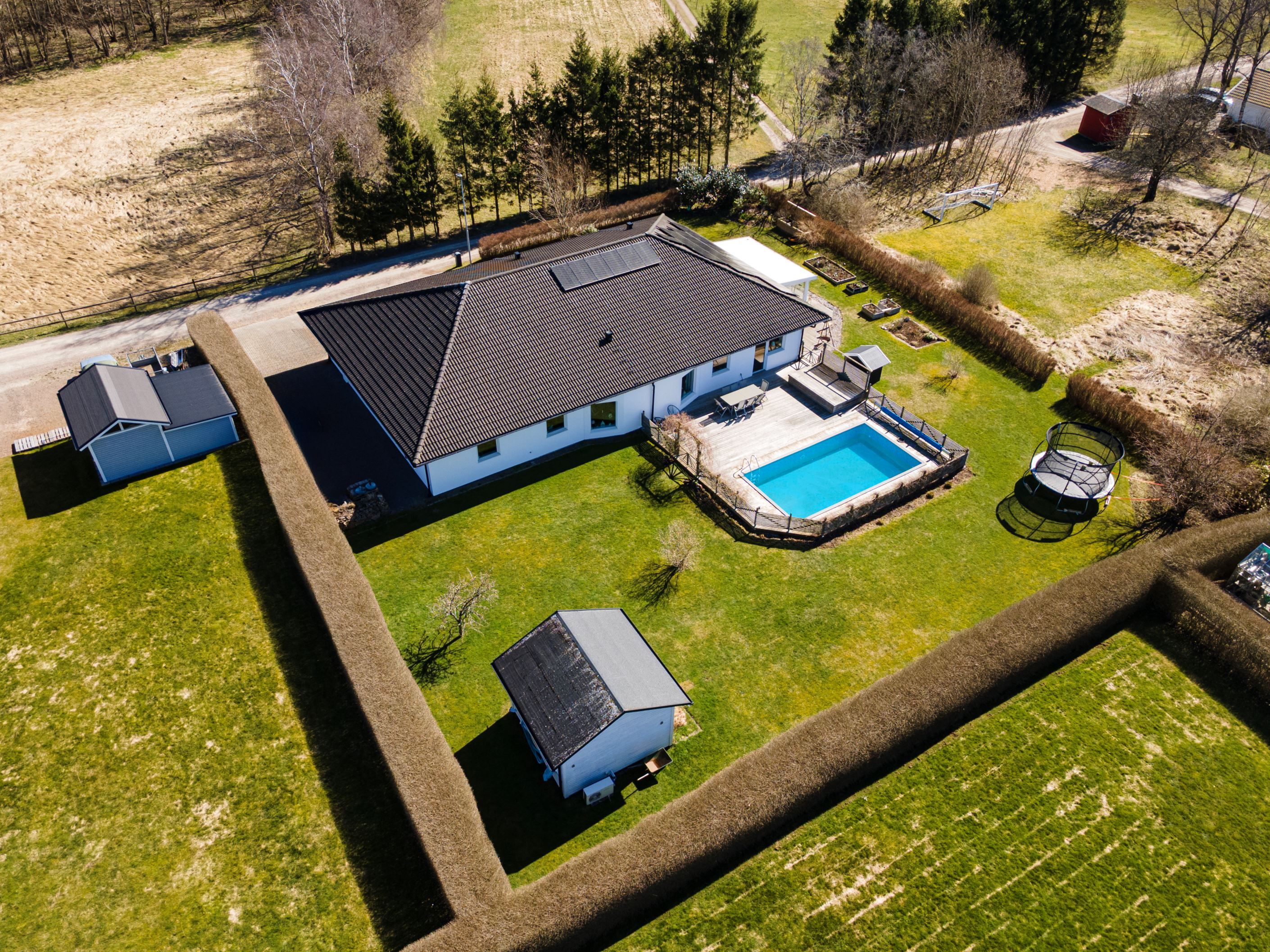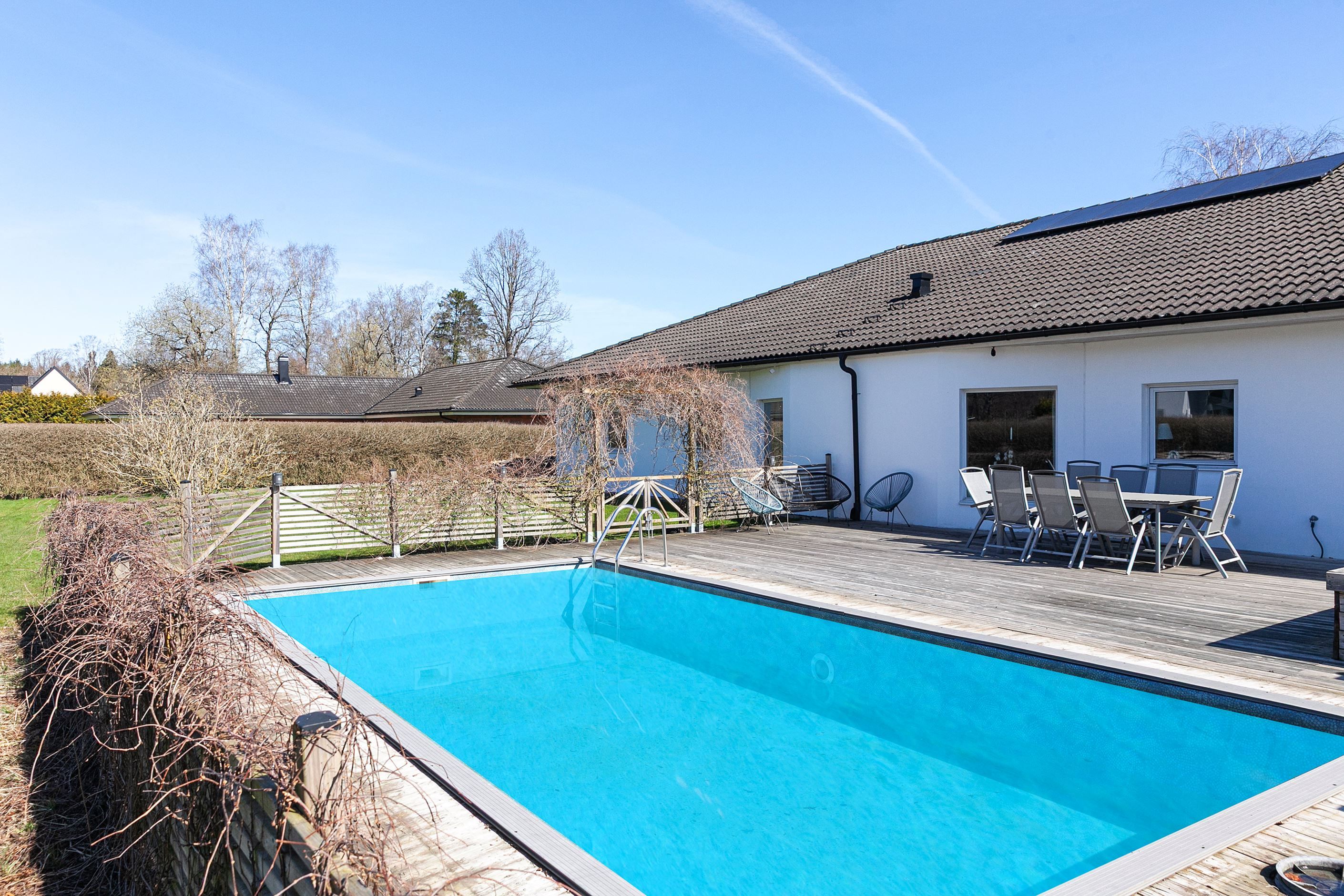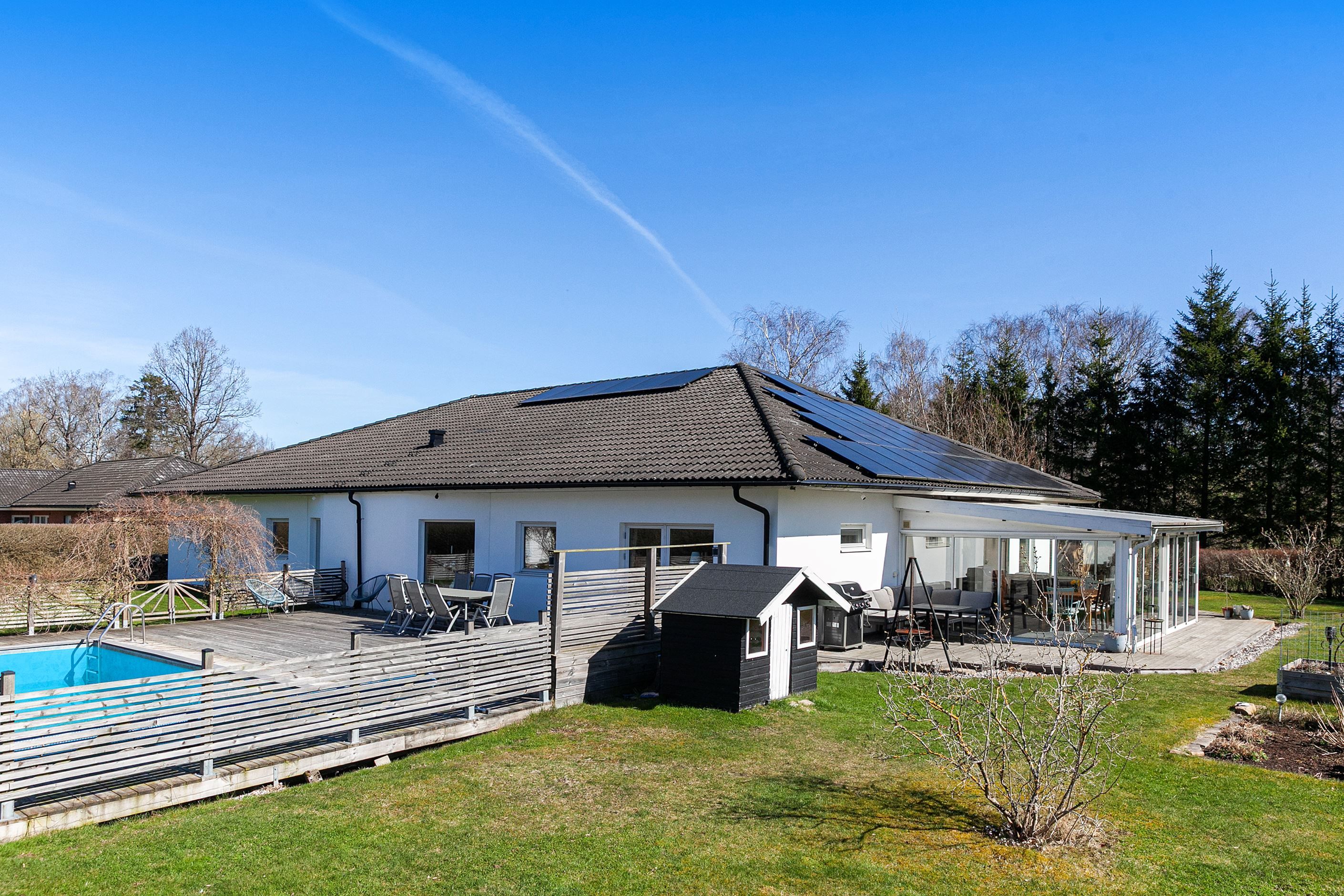 Nu har vi möjligheten att presentera ett fantastiskt enplanshus, beläget på Forntidsvägen uppe på Björnås. Här bor ni med omedelbar närhet till naturen, omgivet av gårdar i en modern enplansvilla på hela 235kvm, fördelat på hela fem sovrum, stort vardagsrum och kök, två badrum och tvättstuga. Ett perfekt boende för hela familjen som erbjuder massiva sociala ytor, högt i tak och en härlig stor trädgårdstomt med poolområde och uterum. Läget är lantligt, trots att det ligger nära det nyare villaområdet på Björnås och Åstorps centrala utbud av service och kommunikationer via tåg och buss.