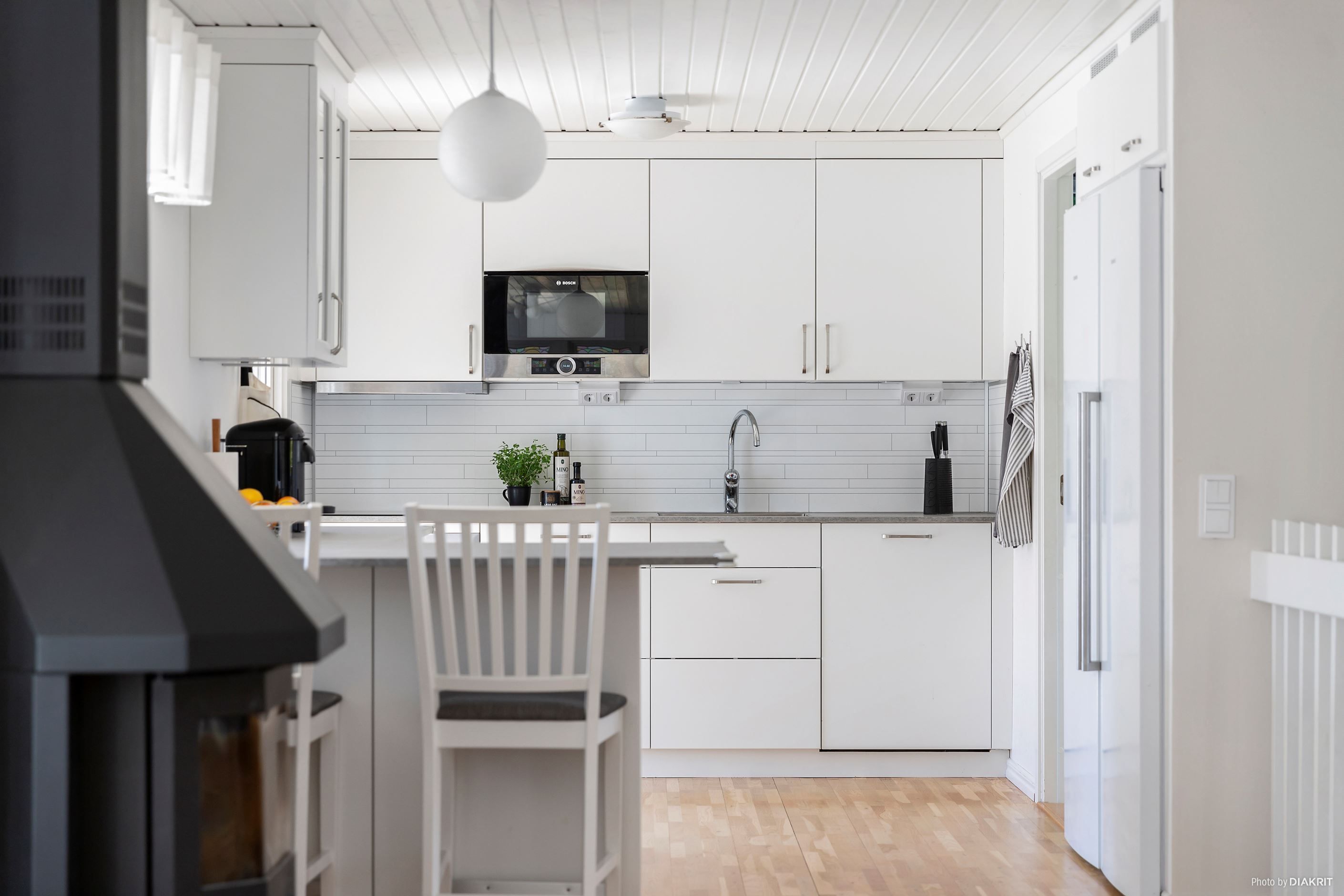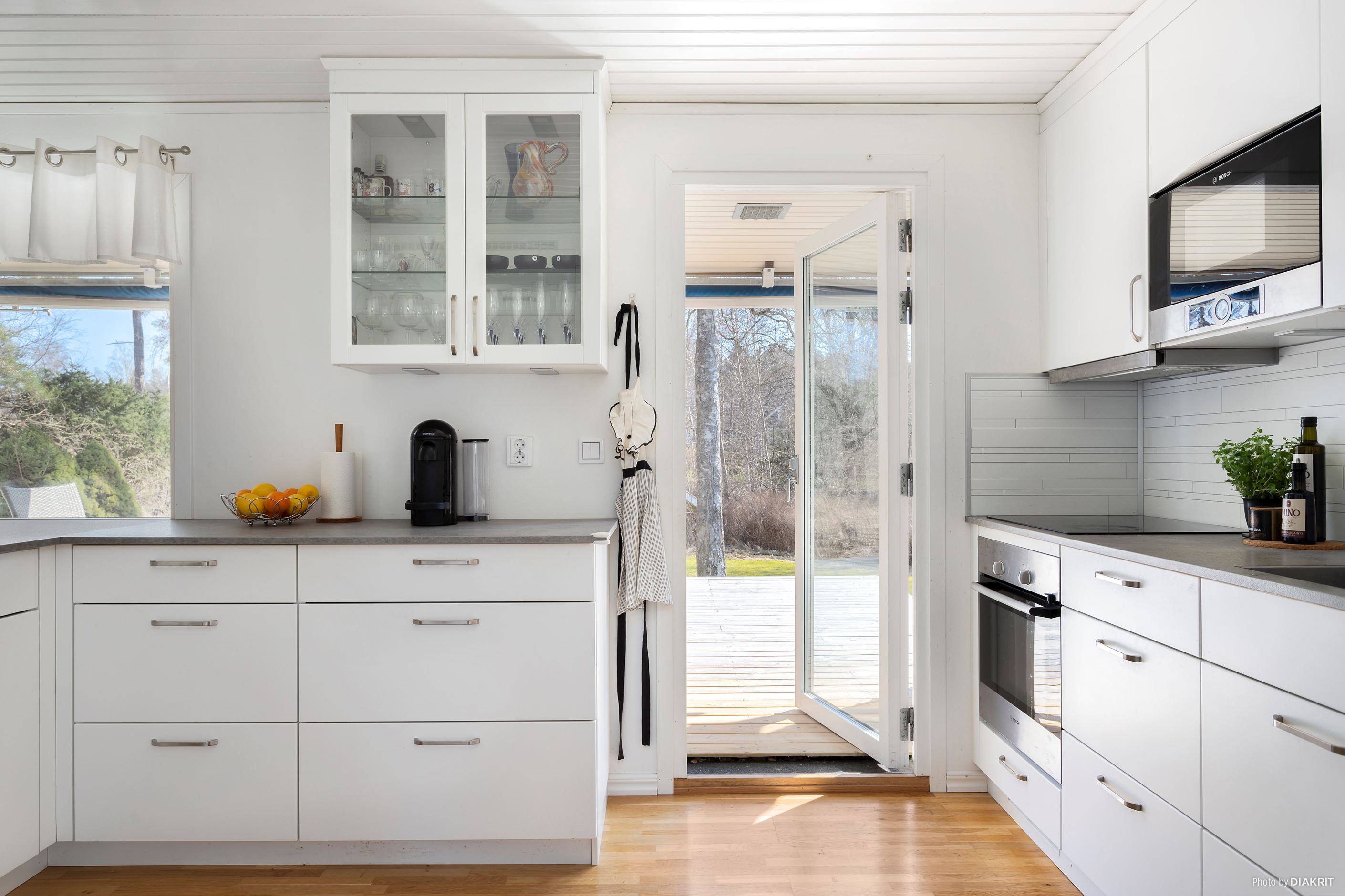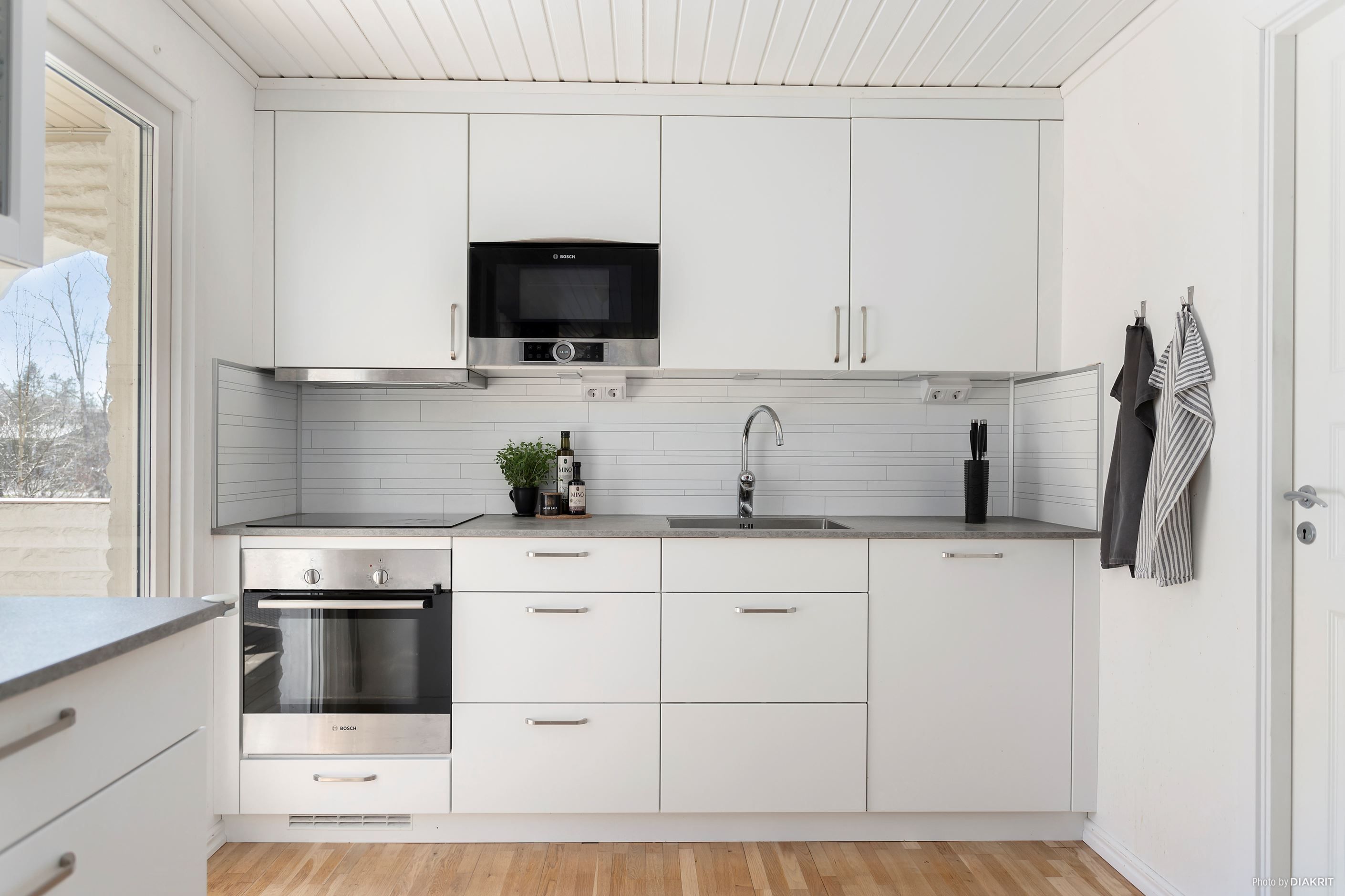 Intill ligger köket som totalrenoverades 2017 i en tidlös, ljus utformning med goda arbetsytor, förvaring och moderna vitvaror. Matlagningen blir en social del av vardagen och härifrån nås även altanen, vilket gör det enkelt att låta inne och ute samspela under årets varmare månader.