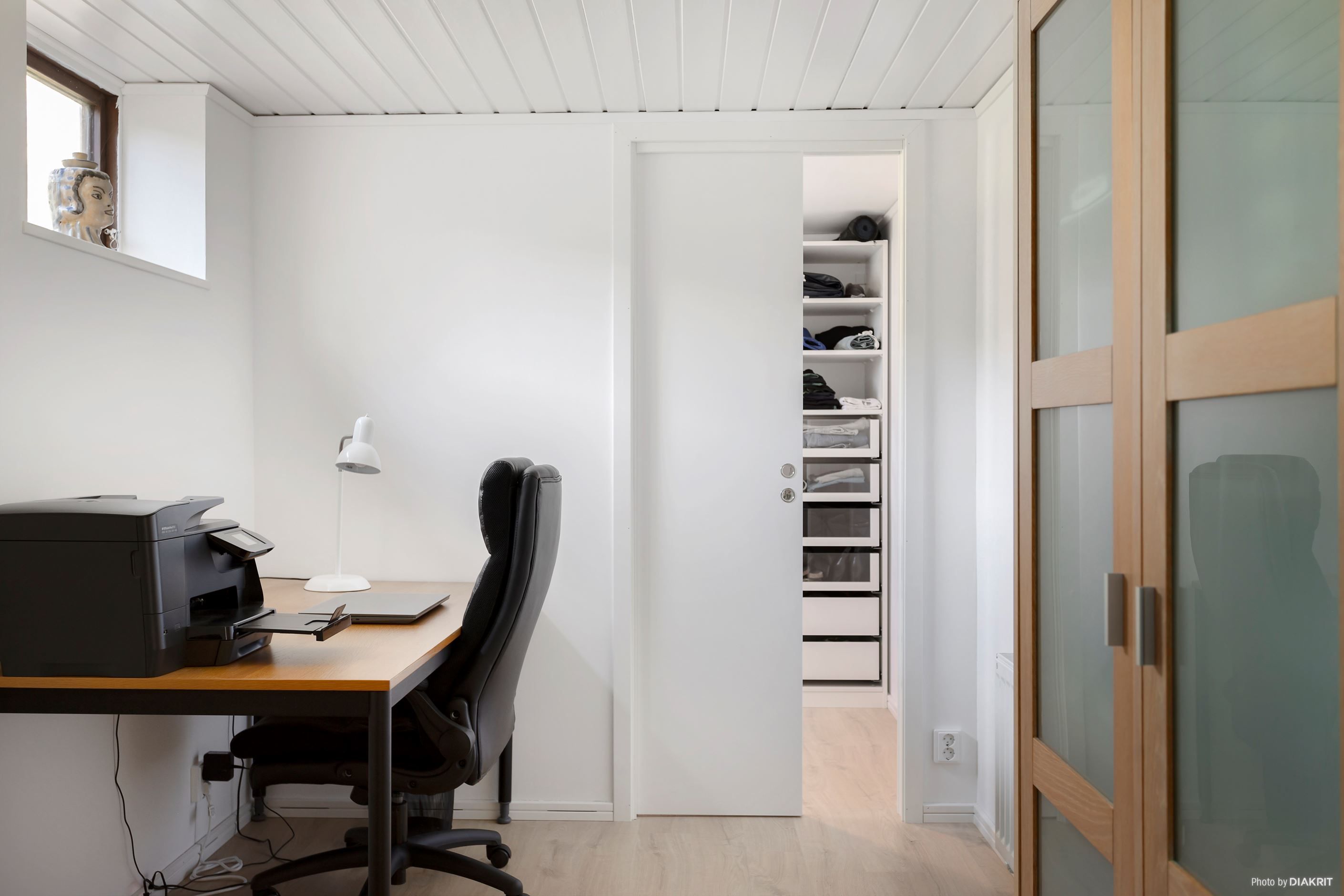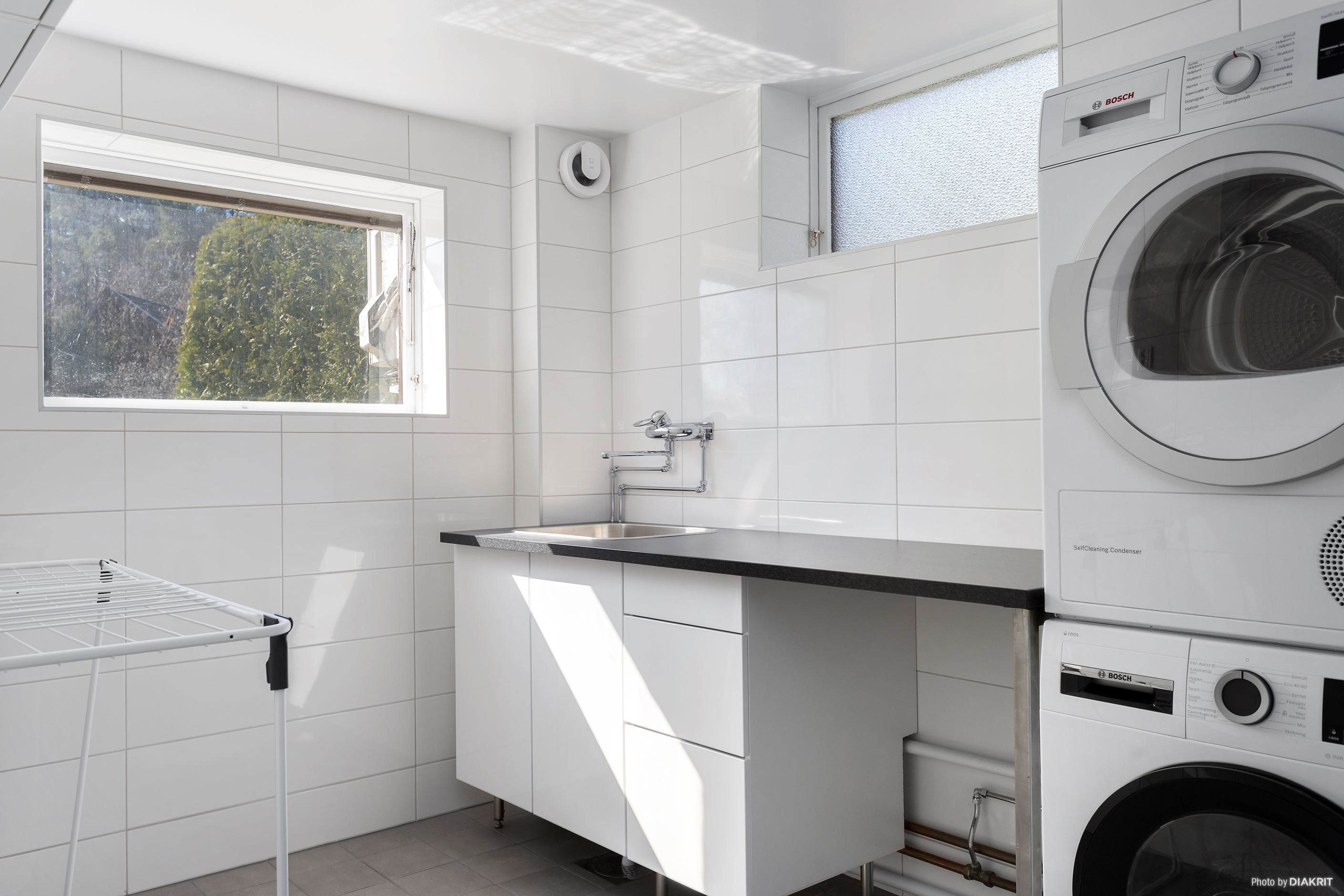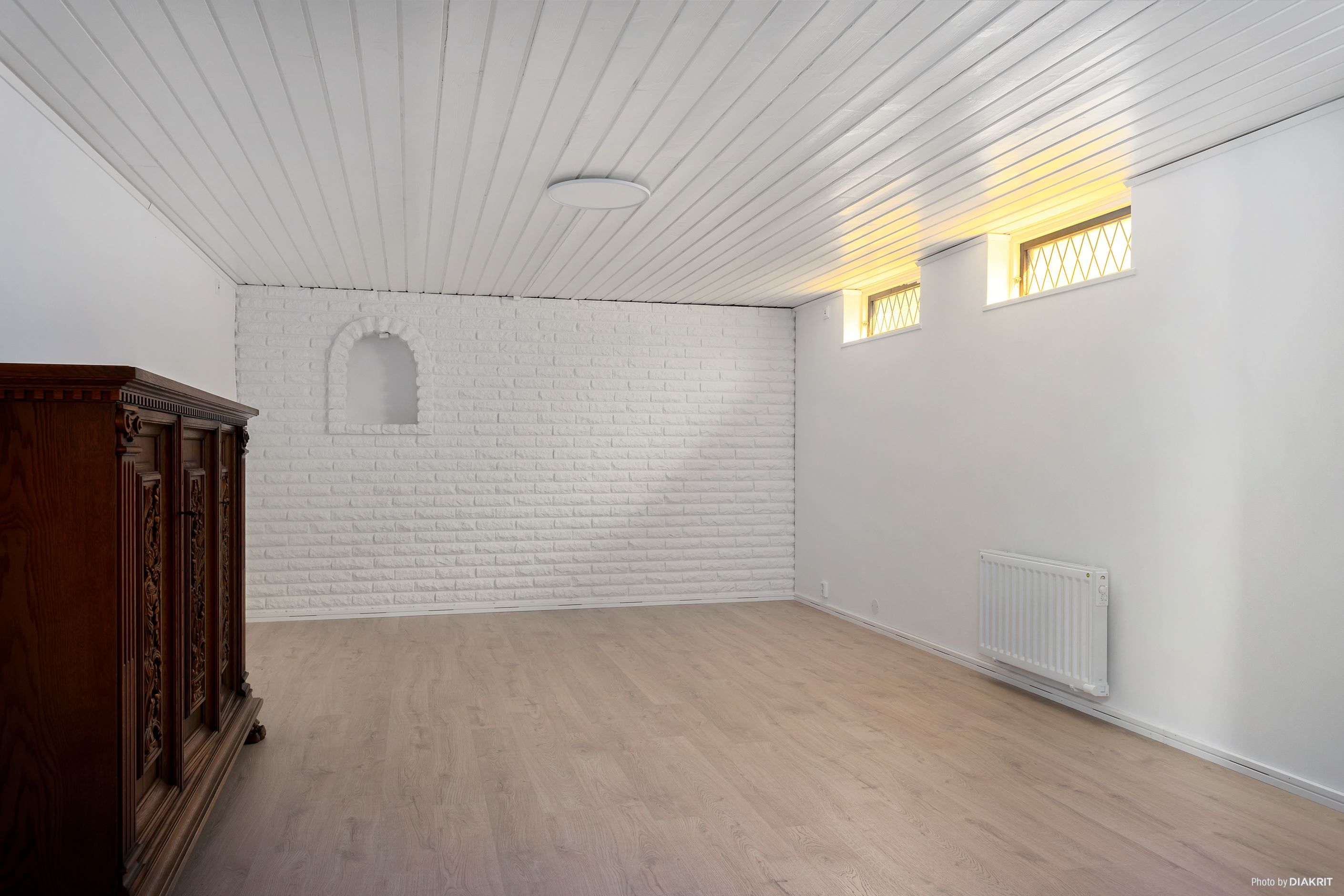 En trappa ned öppnar sig ett rymligt och mångsidigt källarplan. Här finns ett stort allrum som lämpar sig utmärkt som exempelvis tonårsdel, tv-rum, hobbyrum eller hemmakontor. Vidare finns två ytterligare sovrum, förråd samt en nyrenoverad tvättstuga från 2025. Faktum är att hela källarplanet är nyrenoverat med ventilerad golvkonstruktion. Här finns också direkt access till garaget som även det är fint med vita väggar och klinkergolv.