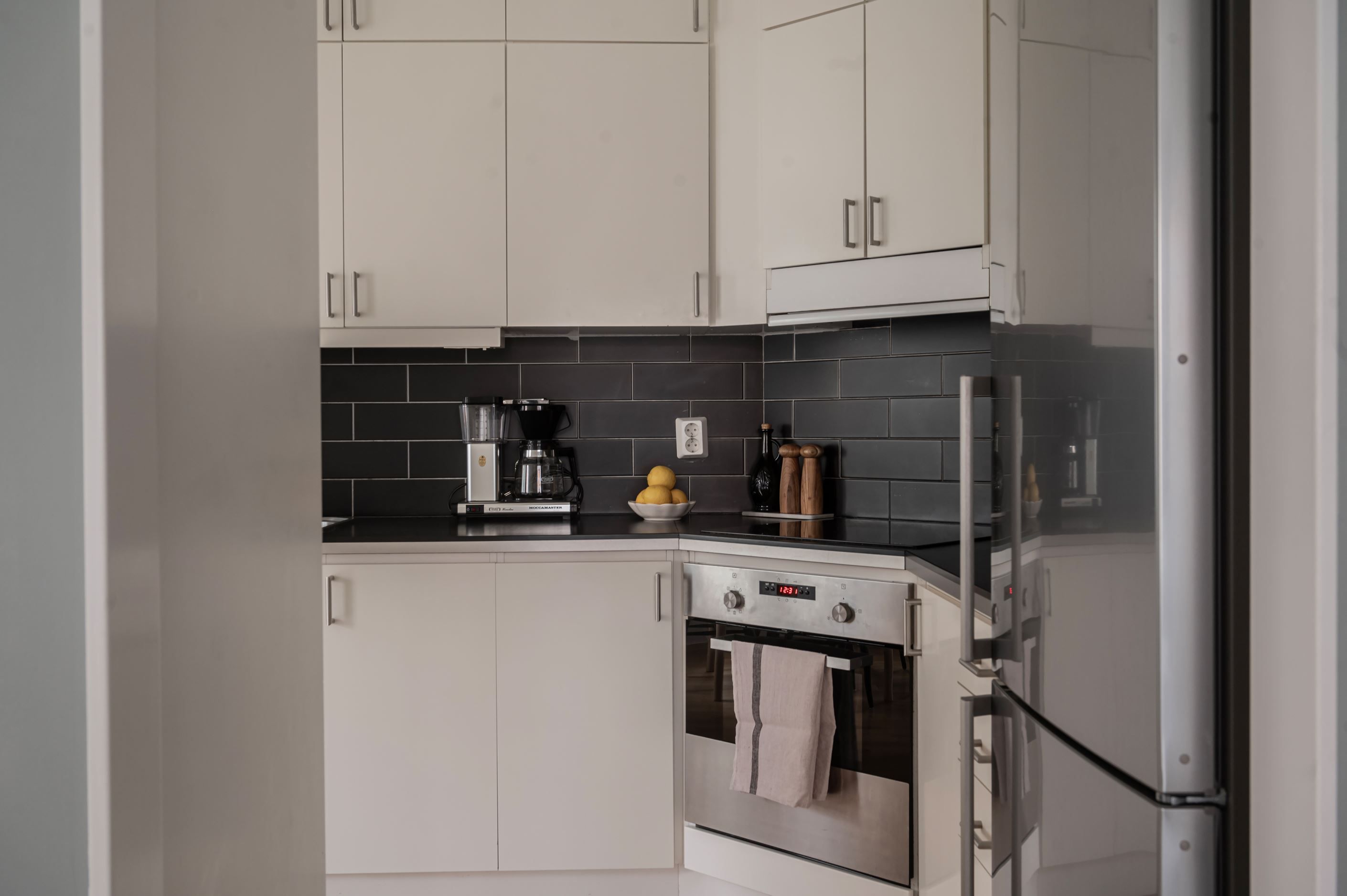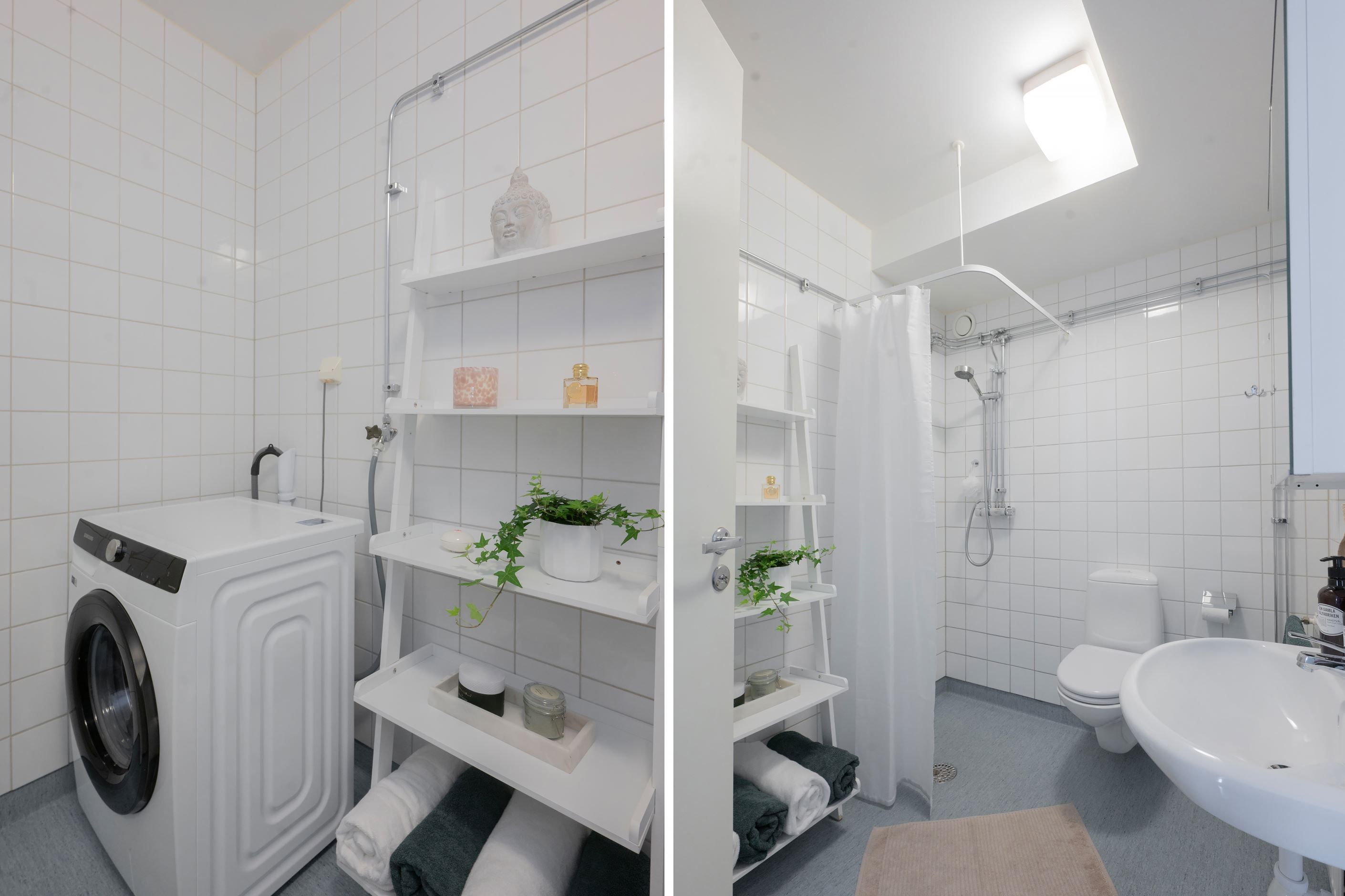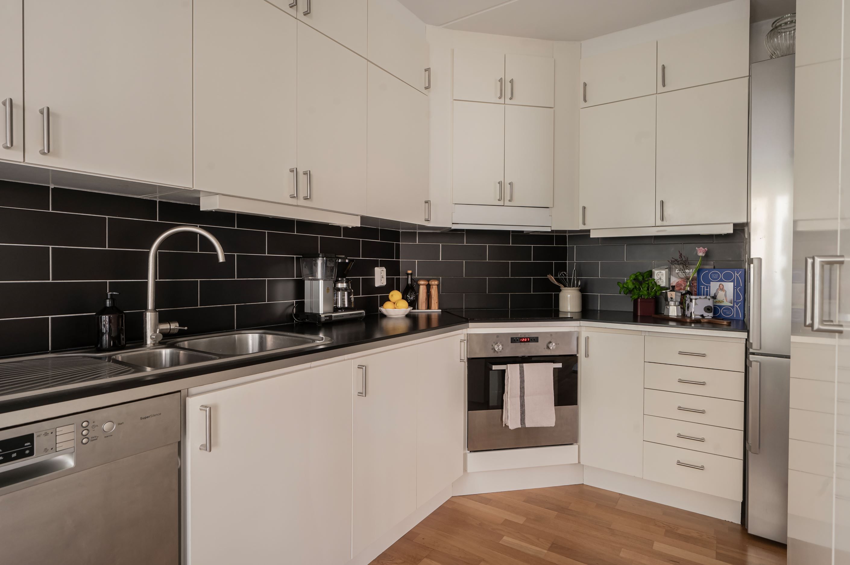 Köket är modernt och fräscht med goda arbetsytor och full maskinell utrustning, inklusive diskmaskin, ugn och häll samt generösa förvaringsmöjligheter. Duschrummmet har kaklade väggar, är rymligt och utrustat med tvättmaskin för extra bekvämlighet i vardagen.