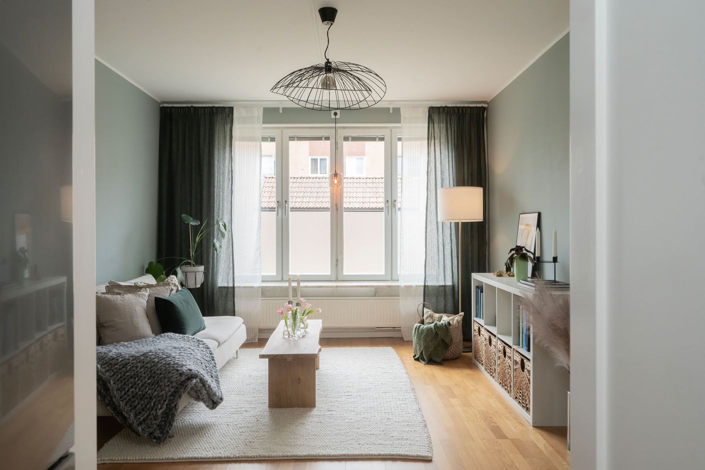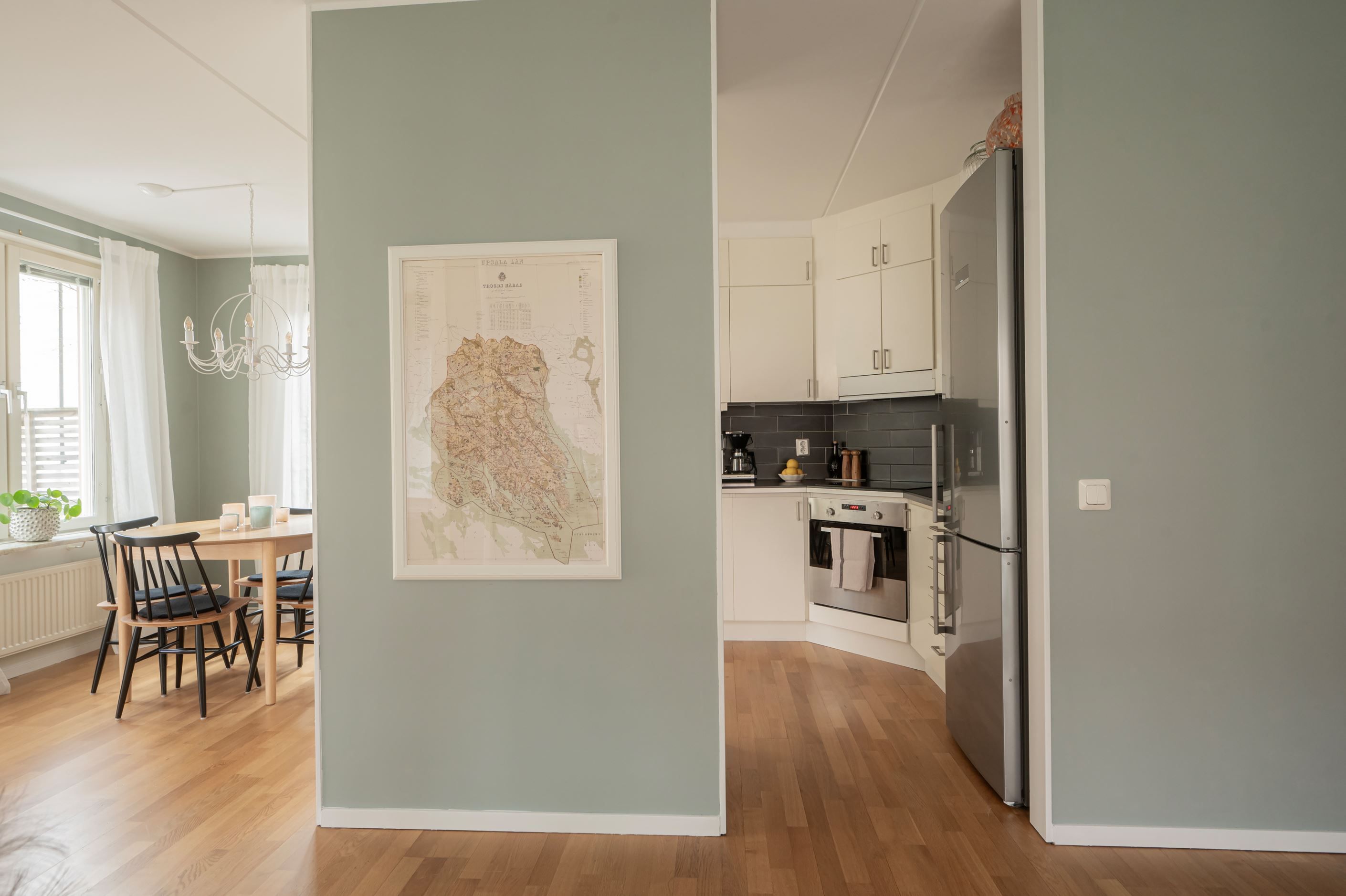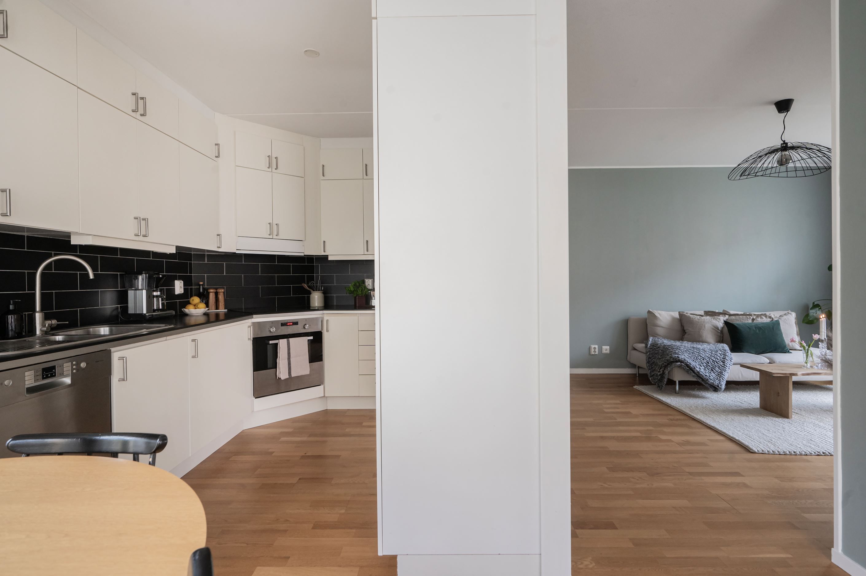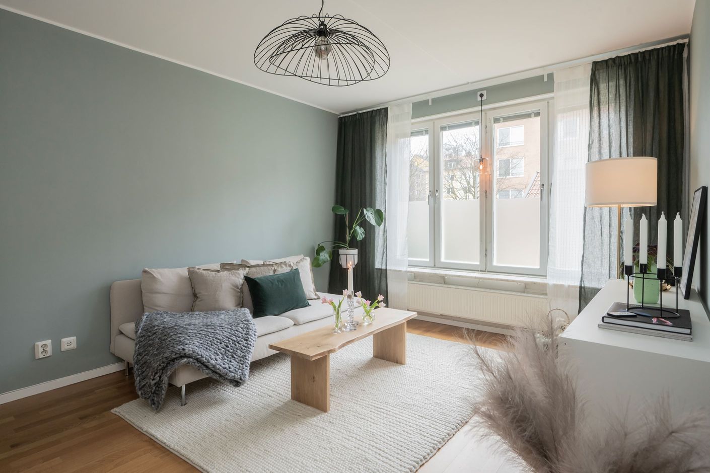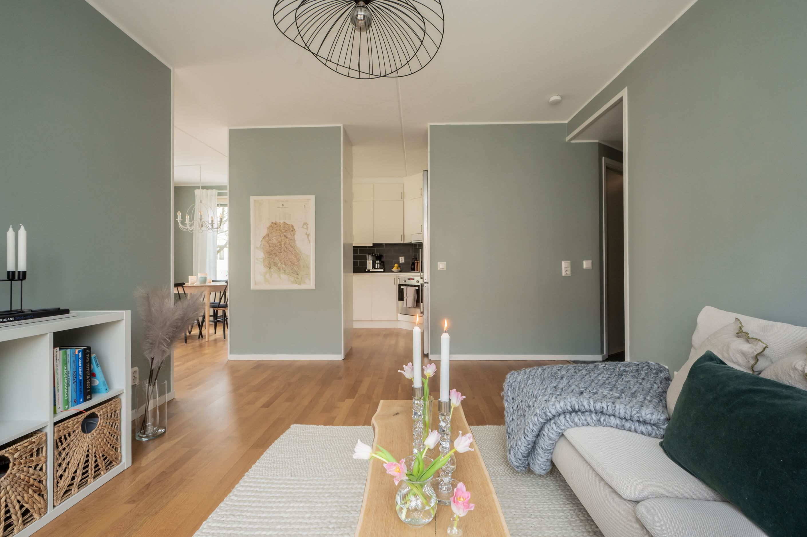 Bostaden präglas av ett fint ljusinsläpp tack vare stora fönsterpartier och har genomgående vackra golv som skapar en varm och inbjudande känsla. Det rymliga sovrummet erbjuder plats för både dubbelsäng och förvaring, medan den öppna planlösningen mellan kök och vardagsrum ger en social och trivsam atmosfär.