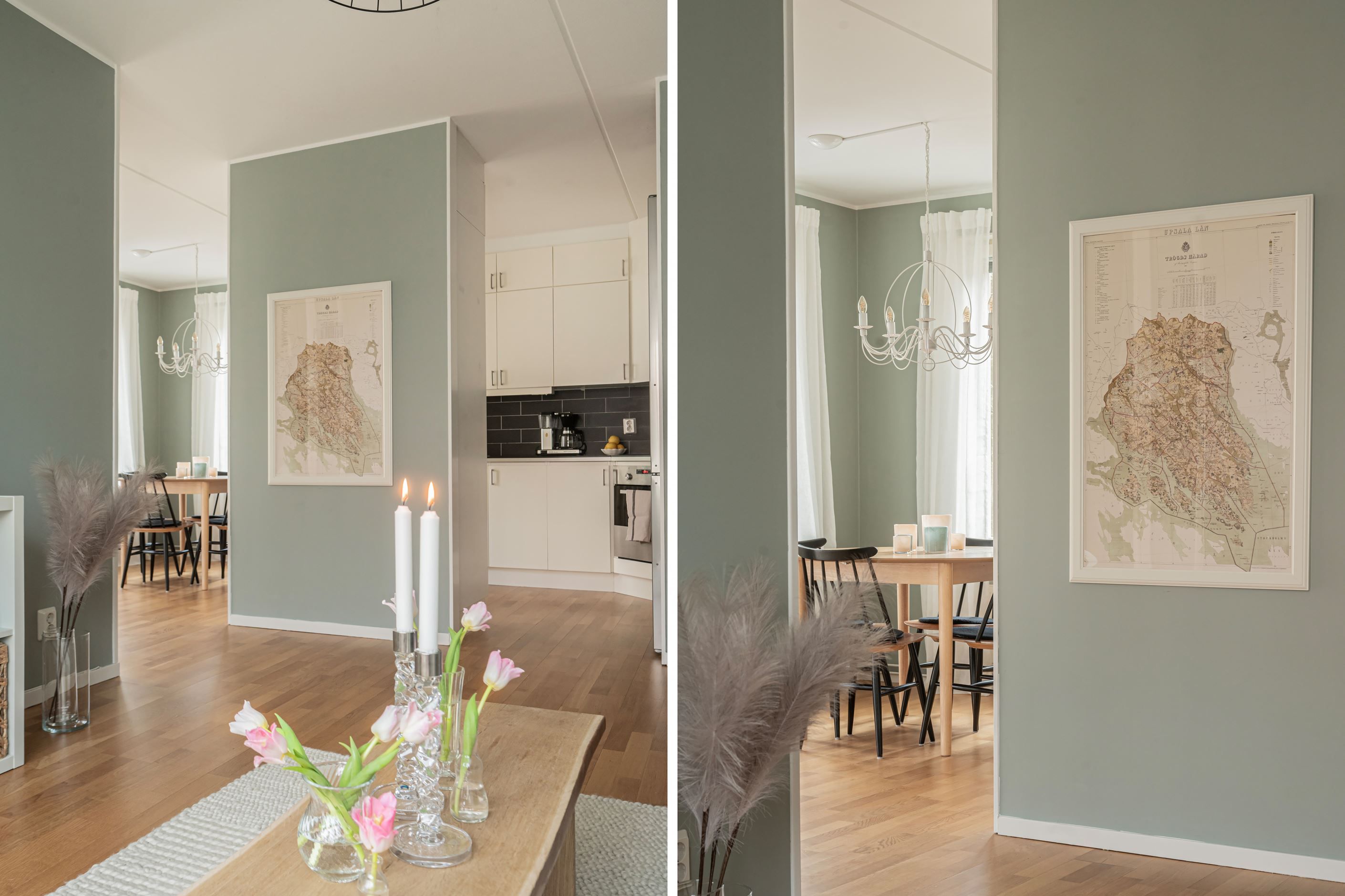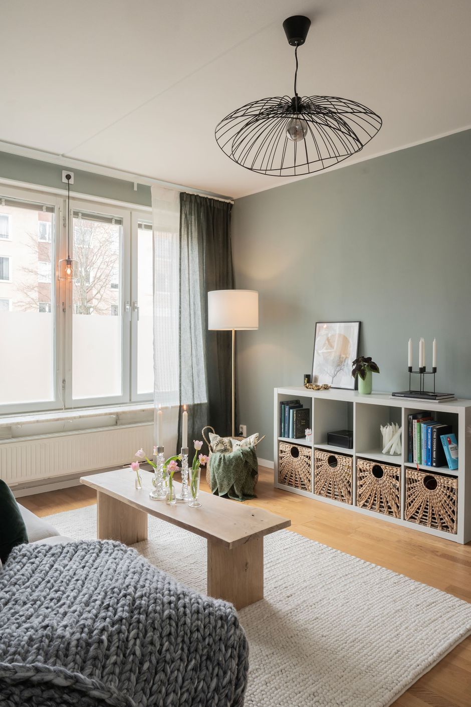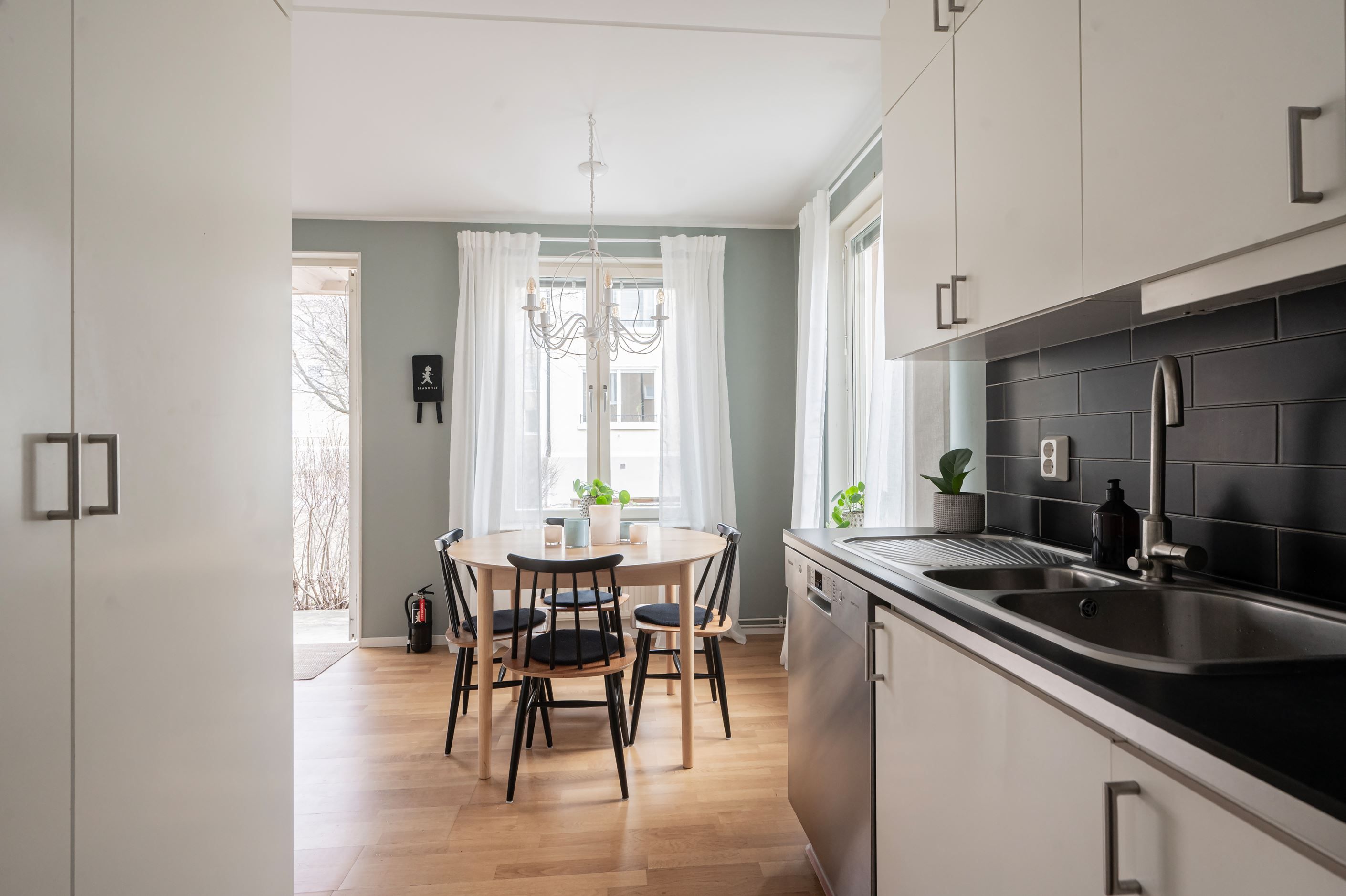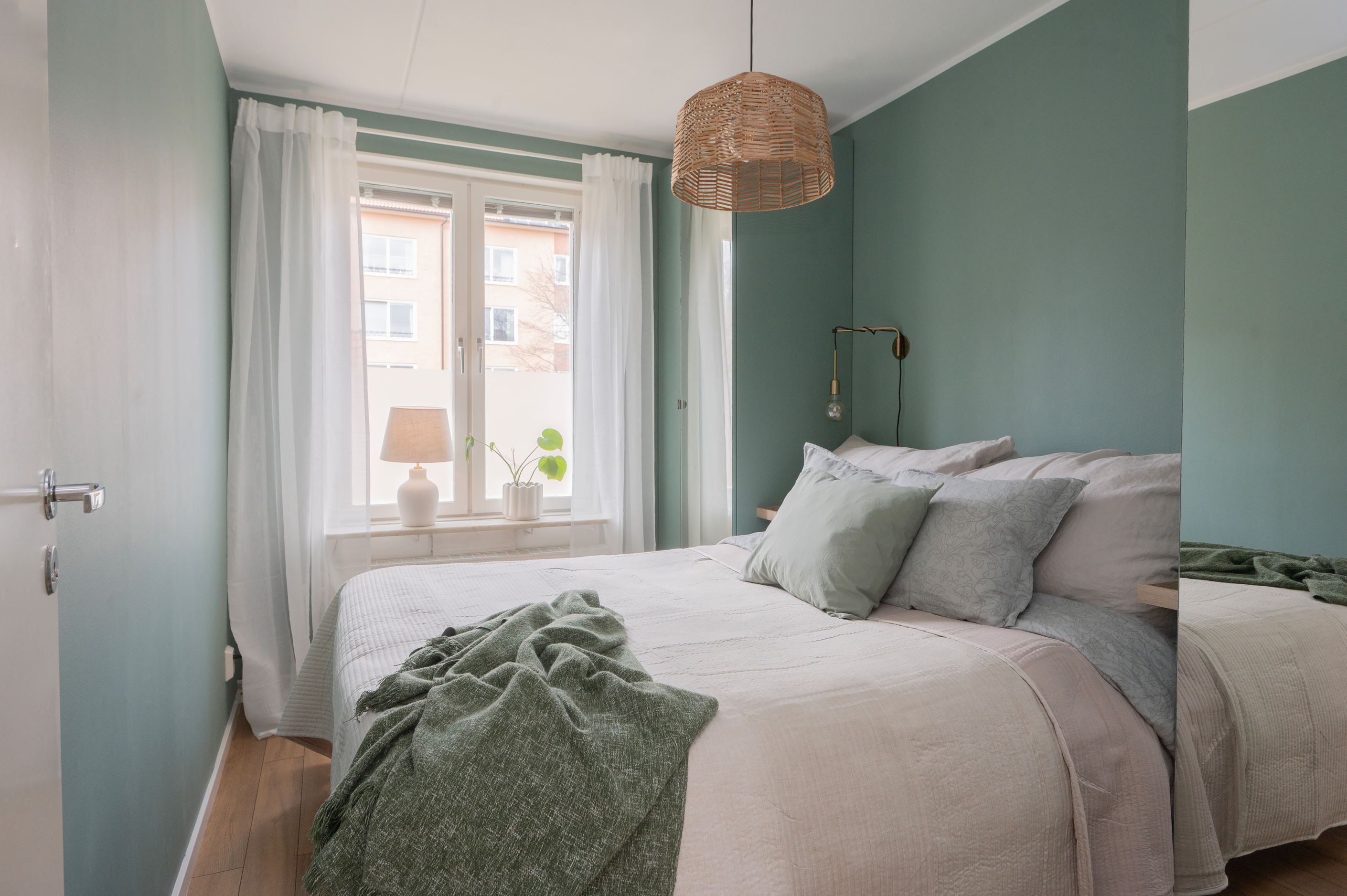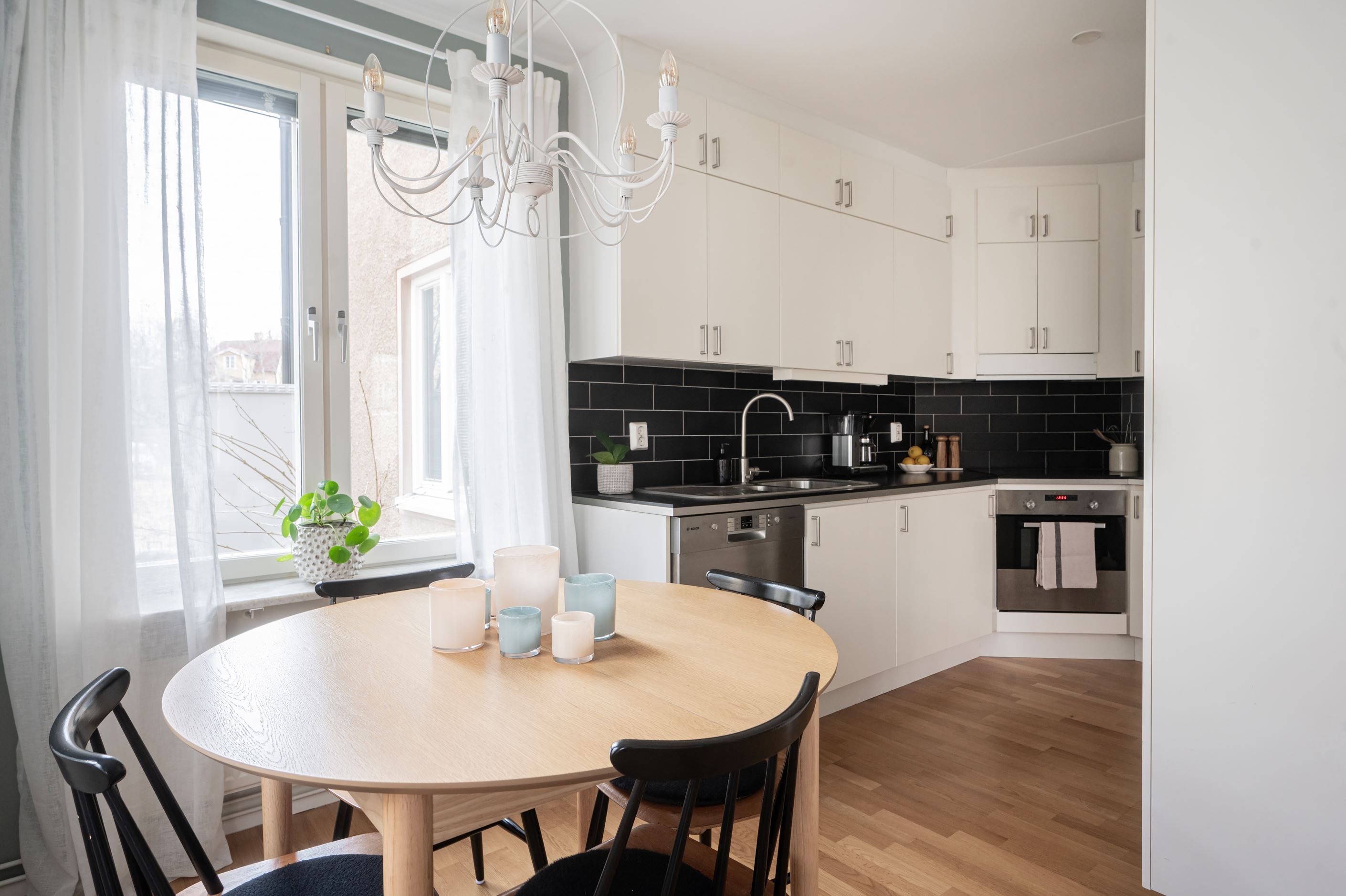 Bostaden präglas av ett fint ljusinsläpp tack vare stora fönsterpartier och har genomgående vackra golv som skapar en varm och inbjudande känsla. Det rymliga sovrummet erbjuder plats för både dubbelsäng och förvaring, medan den öppna planlösningen mellan kök och vardagsrum ger en social och trivsam atmosfär.