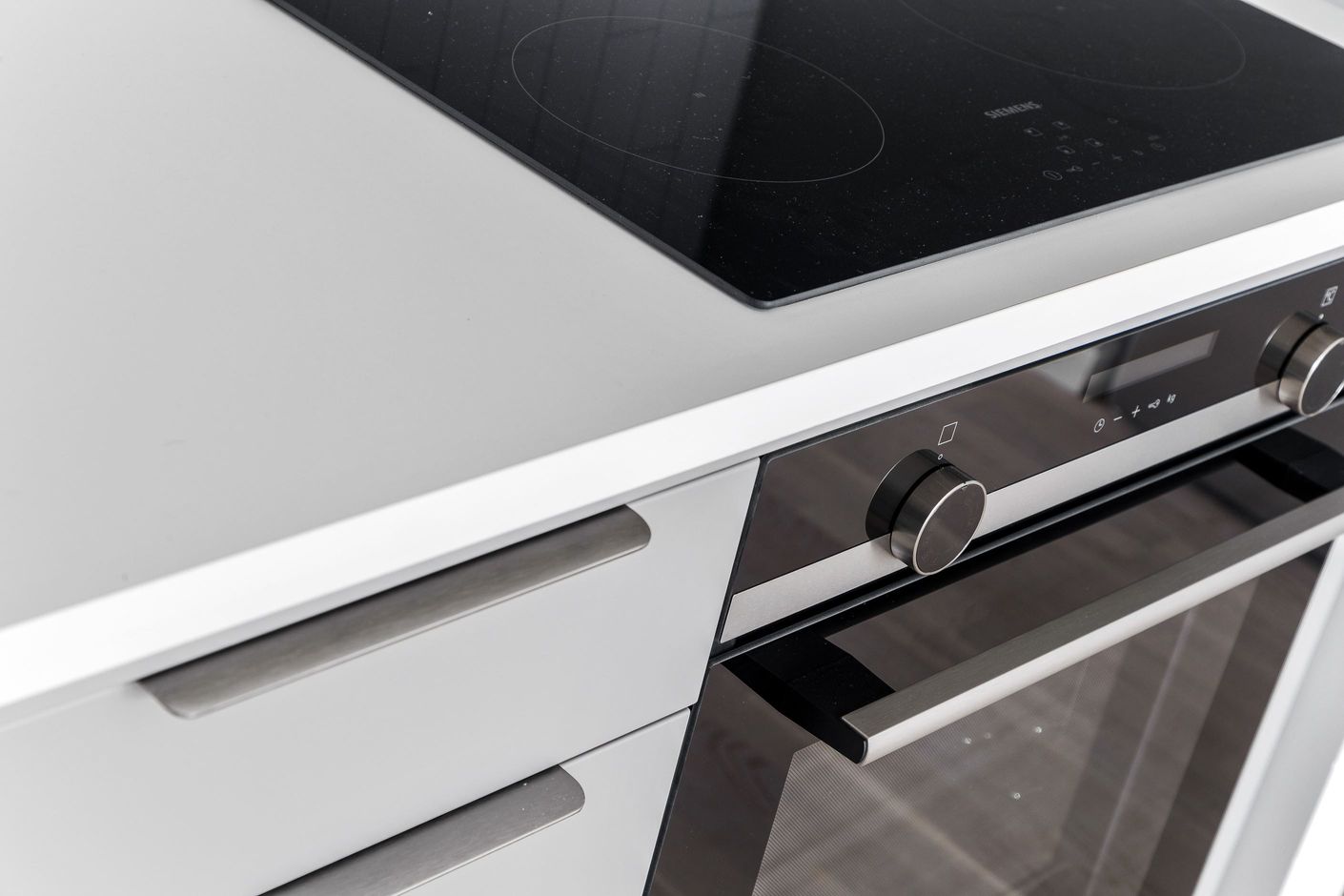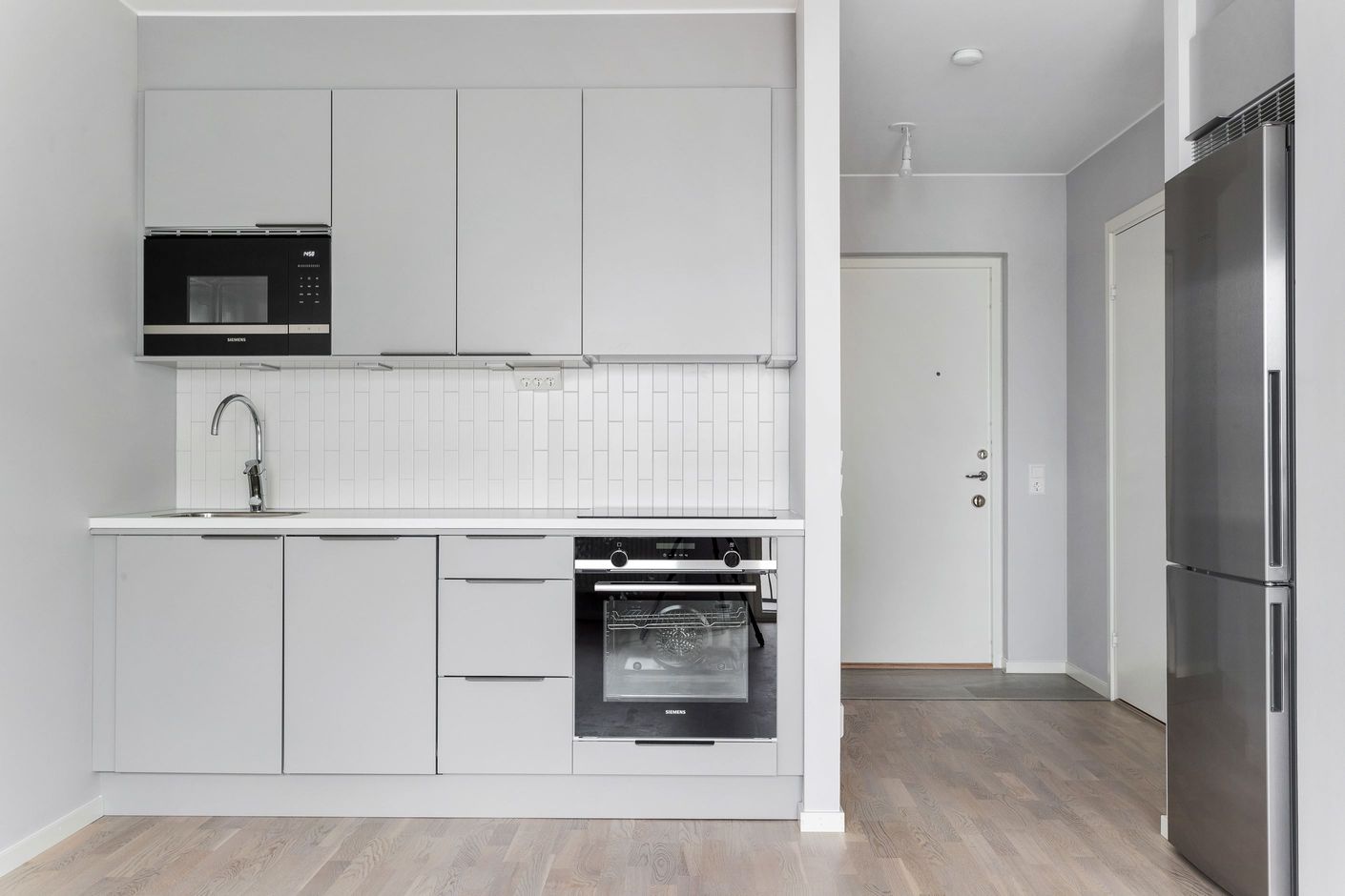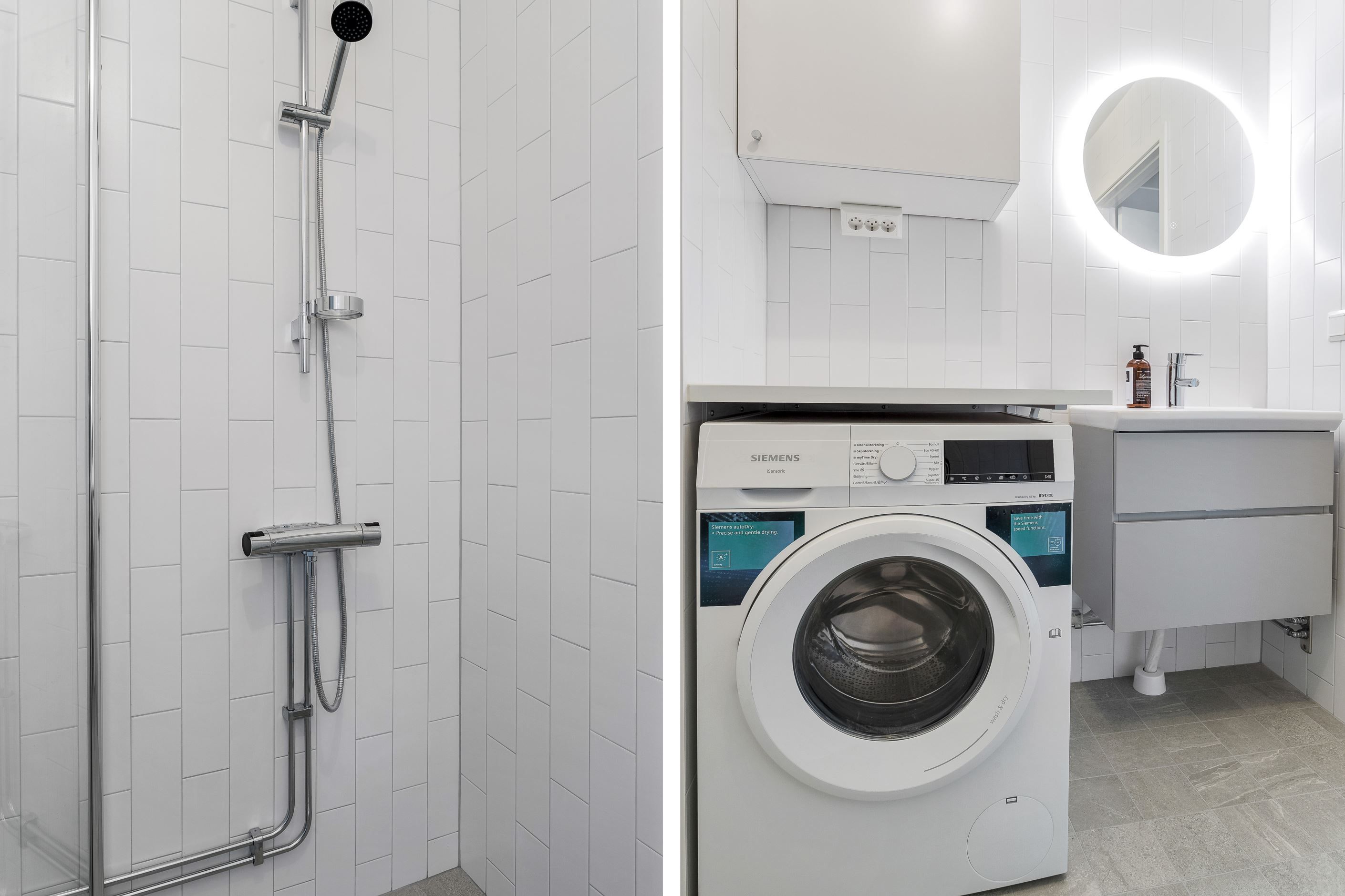 Köket är stilrent och fullt utrustat med kyl, frys, ugn, induktionshäll och diskmaskin – perfekt för såväl vardagsmatlagning som middagar med vänner. Det rymliga badrummet håller hög standard och är utrustat med dusch samt kombimaskin för tvätt och tork.