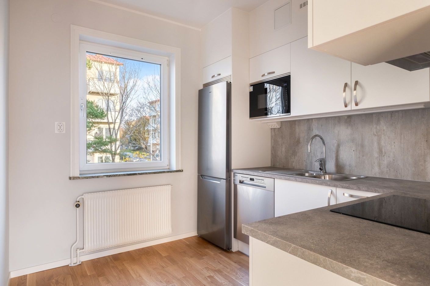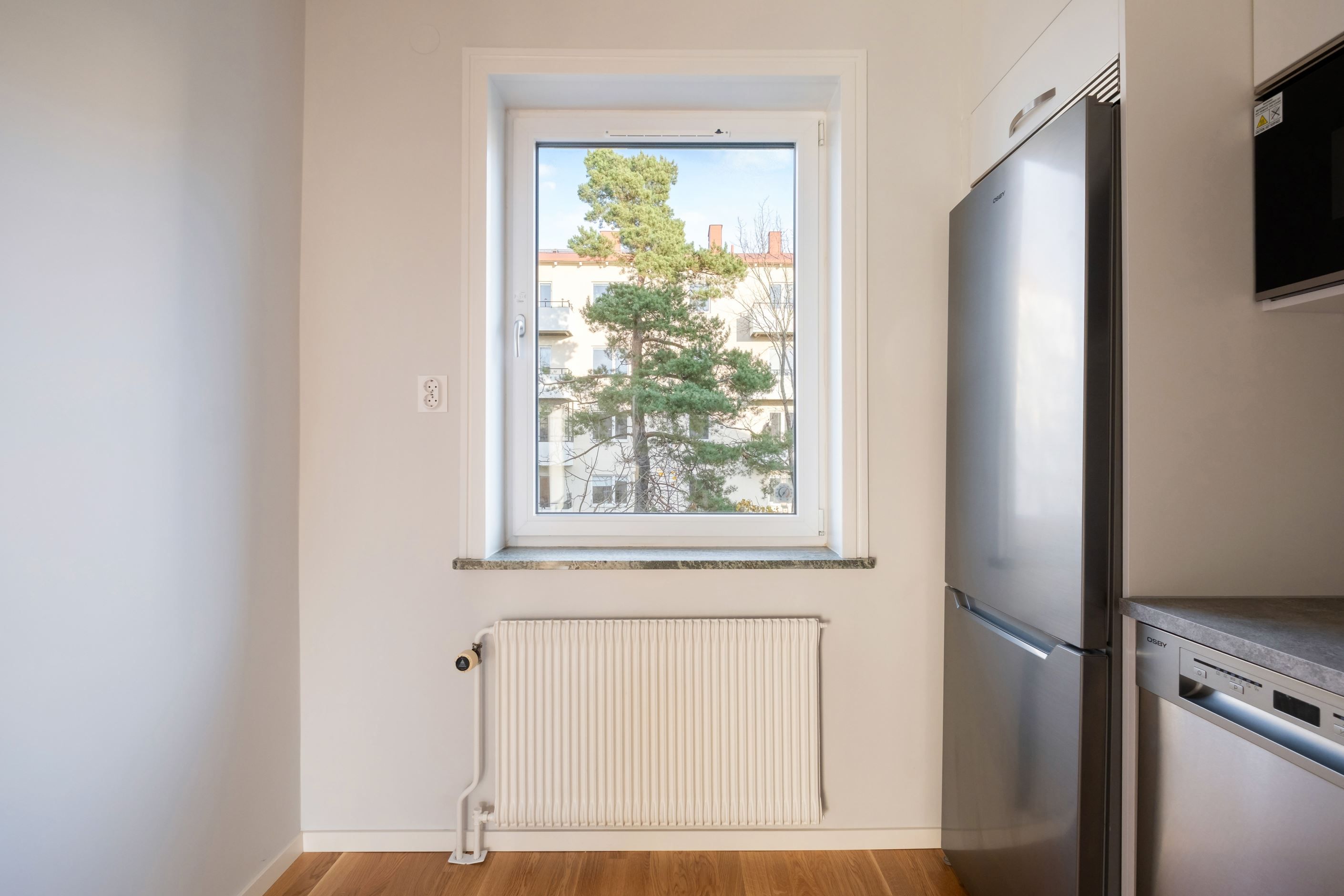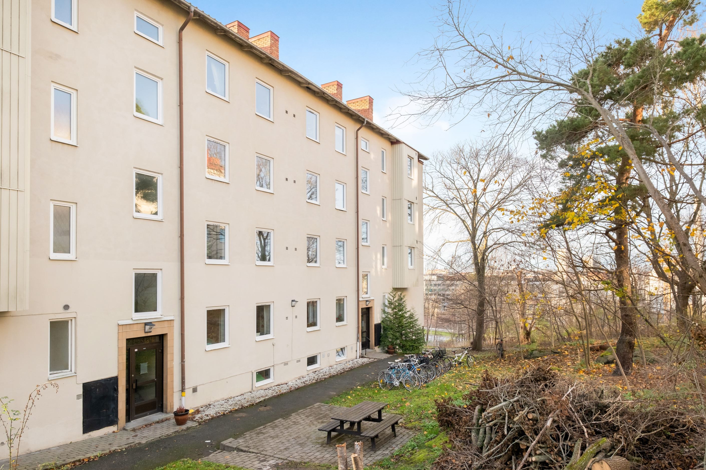 Bostadens 43 kvadratmeter är välplanerade och bjuder på en ljus och trivsam disponering med ett rymligt vardagsrum, ett rogivande sovrum, ett toppmodernt kök och ett fräscht badrum. Både kök och badrum har renoverats under hösten 2025, inklusive stambyte. Vardagsrummet är lättmöblerat med härligt ljusinsläpp från det stora insynsskyddade fönsterpartiet. Här finns gott om plats för möblering med soffa och TV-hörna såväl som matbord, vilket är perfekt för sociala sammankomster eller mysiga hemmakvällar. Här finner du dessutom utgången till den härliga balkongen som vetter mot sydväst och den lummiga grönskan utanför med fri utsikt över närområdet. Köket är välplanerat med goda förvaringsmöjligheter bakom ljusa skåpluckor och bra avställnings- och arbetsyta för tillagning av goda måltider. Den maskinella utrustningen består av häll, ugn, köksfläkt, diskmaskin, inbyggd mikrovågsugn samt kombinerad kyl/frys. Rogivande sovrum i perfekt storlek för säng och nattduksbord samt förvaringsmöbel. Här finns också en inbyggd garderob. Trevligt och insynsskyddat fönsterparti som vetter mot grönskan utanför. Fräscht och nyrenoverat, helkaklat badrum med klinker på golvet samt golvvärme, dusch, WC, handfat med kommod och spegelbeklätt badrumsskåp. Här är dessutom förberett för tvättmaskin. Till bostaden hör ett källarförråd.