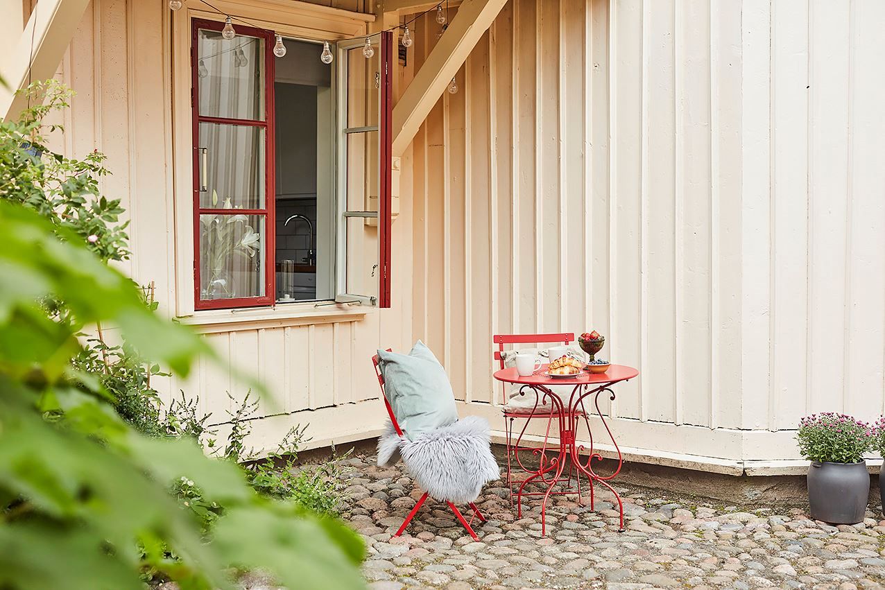 Något av det bästa med lägenheten är den mysiga uteplatsen som vetter ut mot en lugn innergård. Här spenderar man mer än gärna sin lediga tid! Det är bara att slå sig ner och njuta av sommaren i trädgården, utan att känna allt ansvar som en villa kräver.
