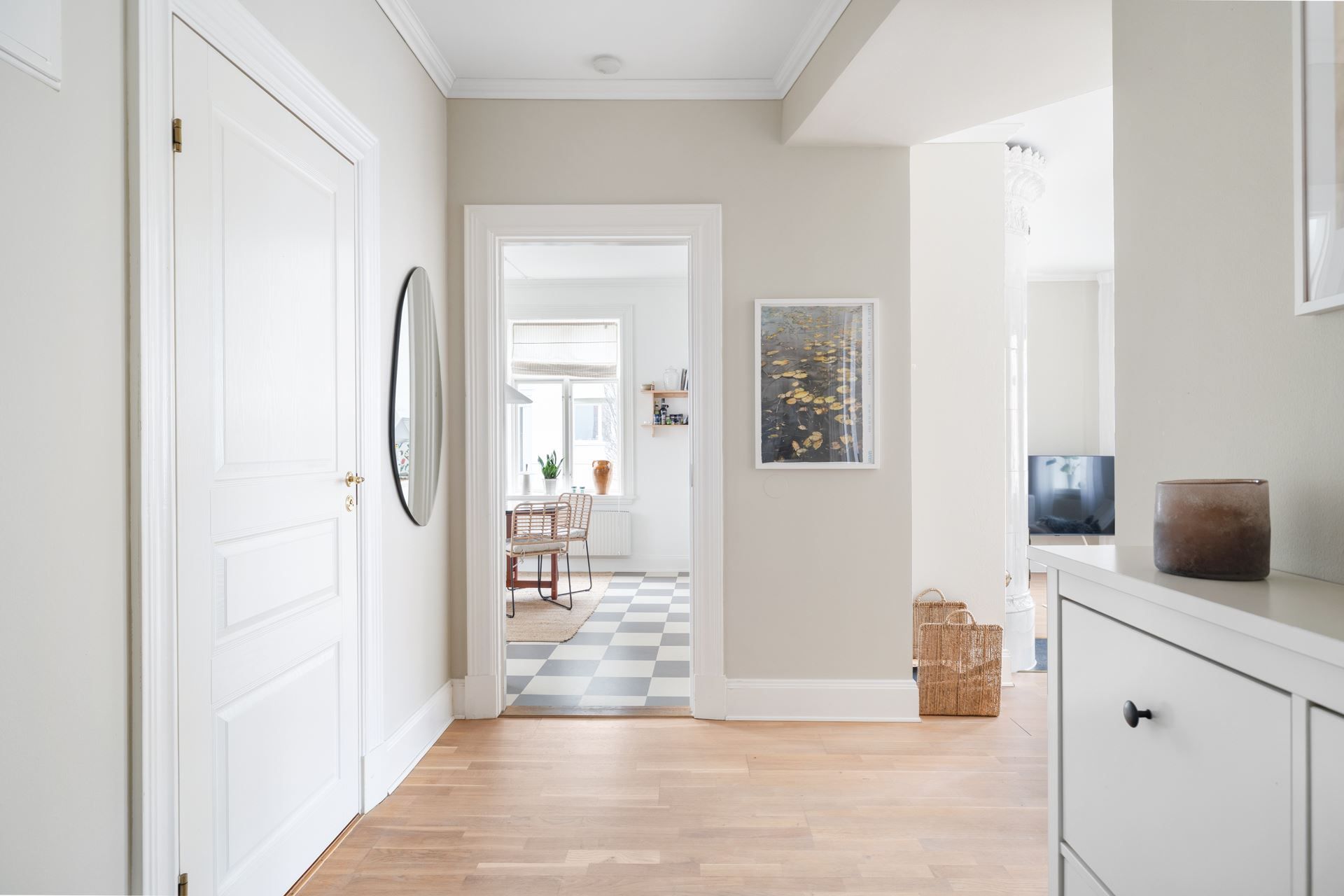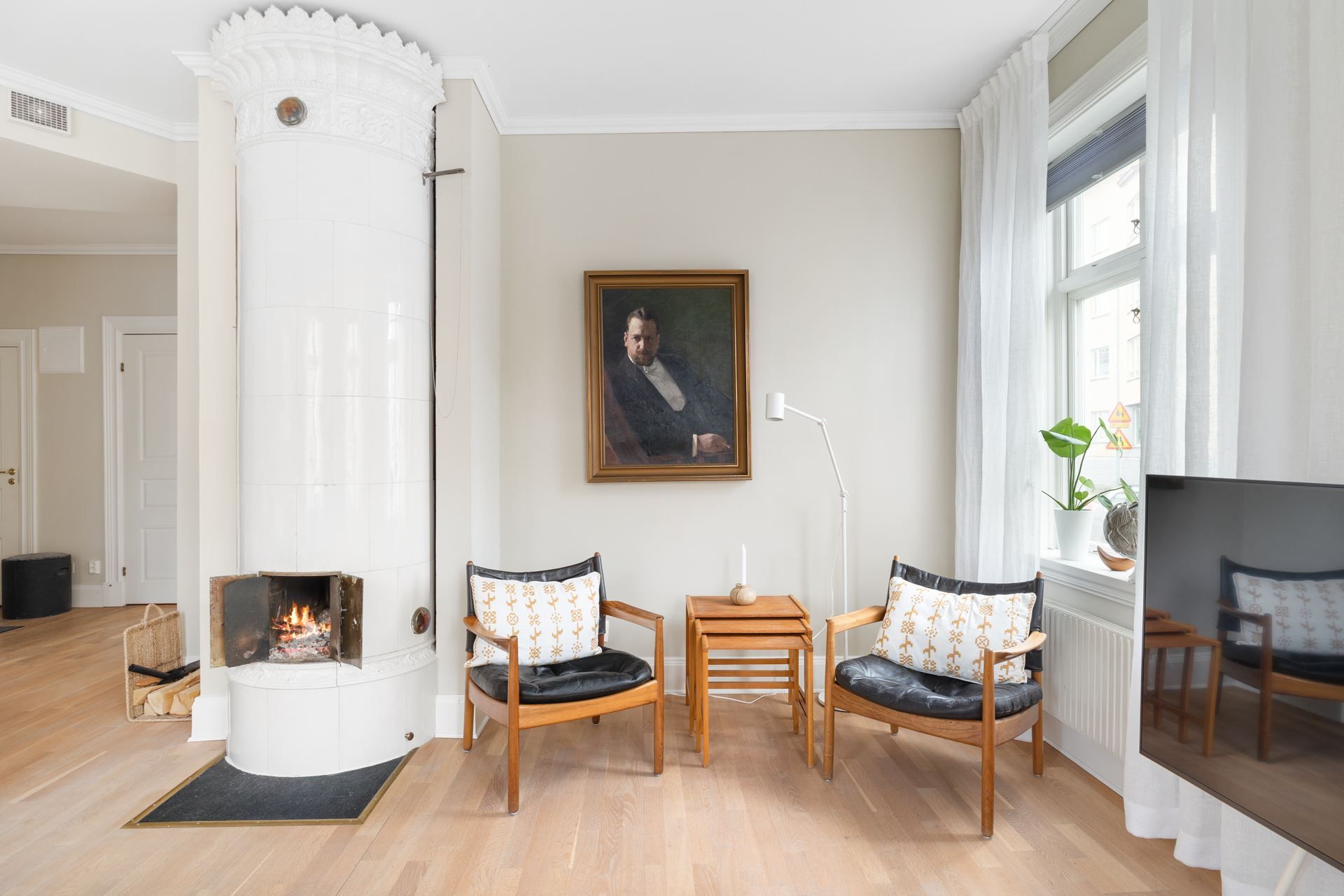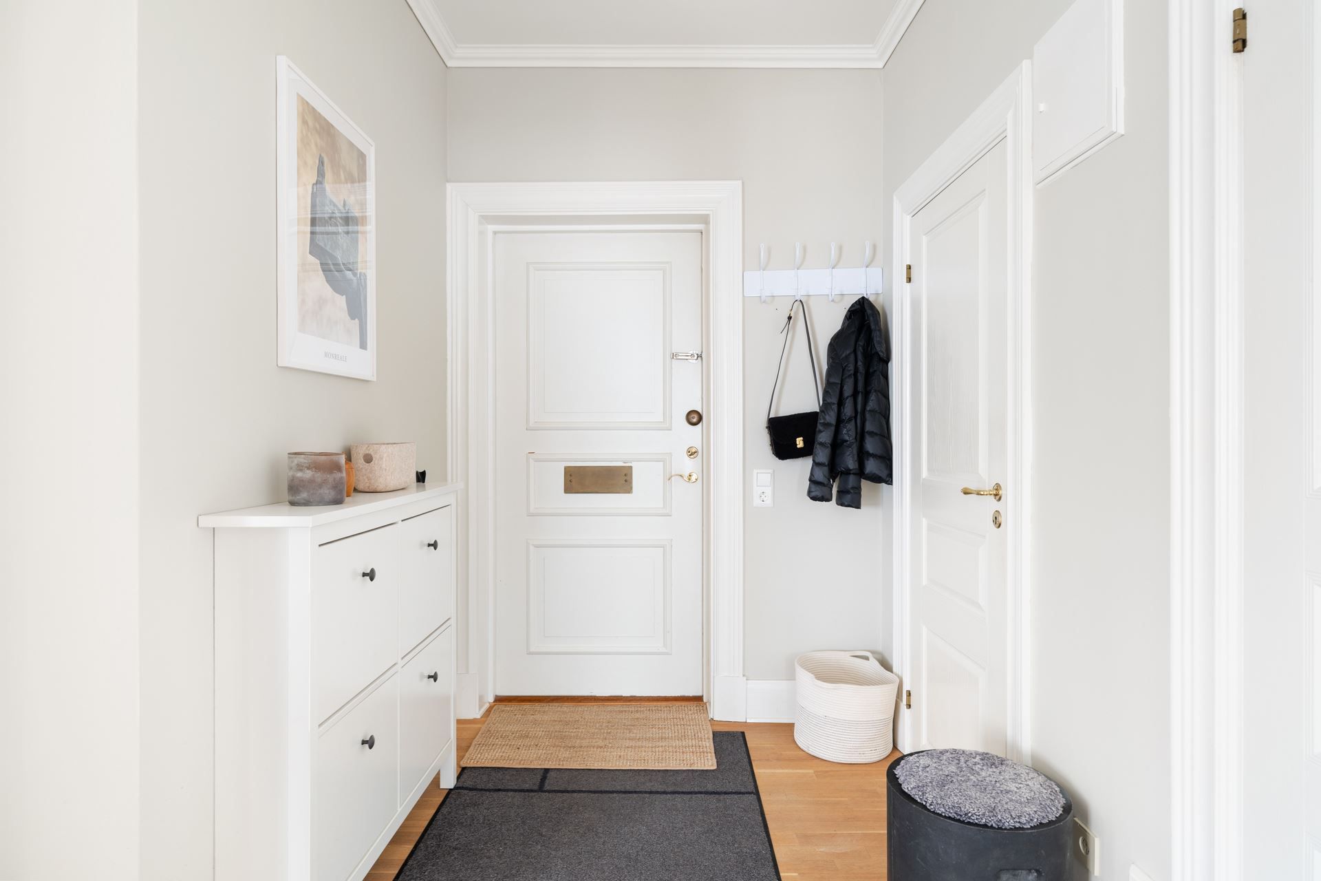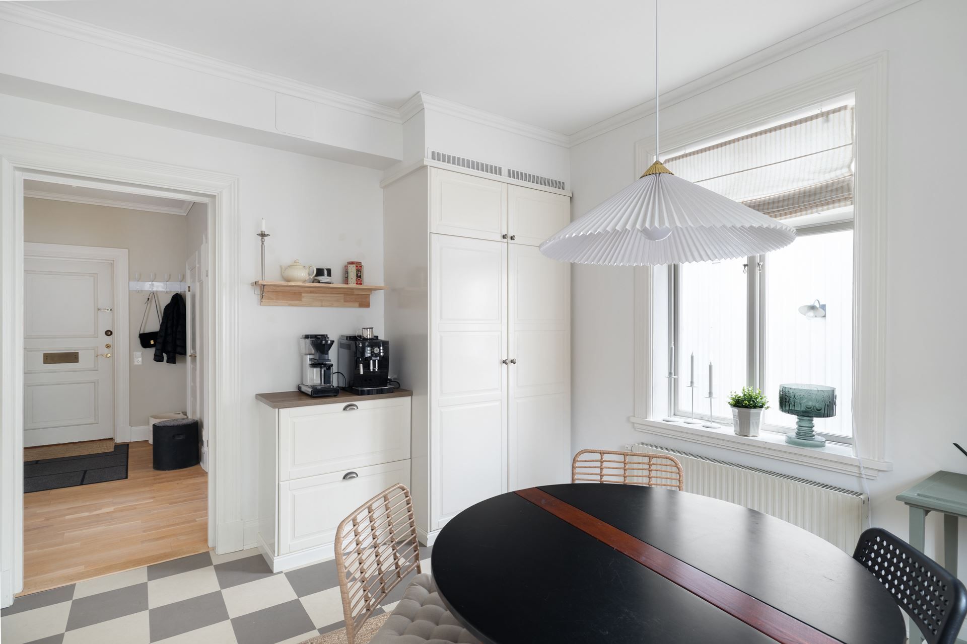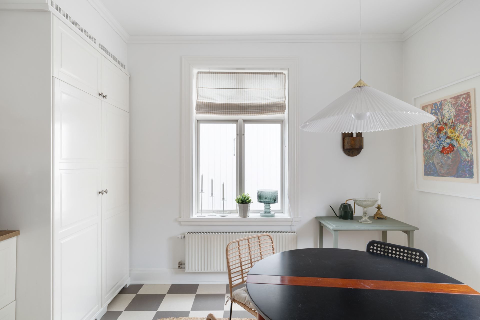 Lägenheten bjuder på en harmonisk kombination av tidstypisk karaktär och ljusa, stilrena ytskikt. Här möts du av generös takhöjd, stora spröjsade fönster och ett påtagligt ljusinsläpp.