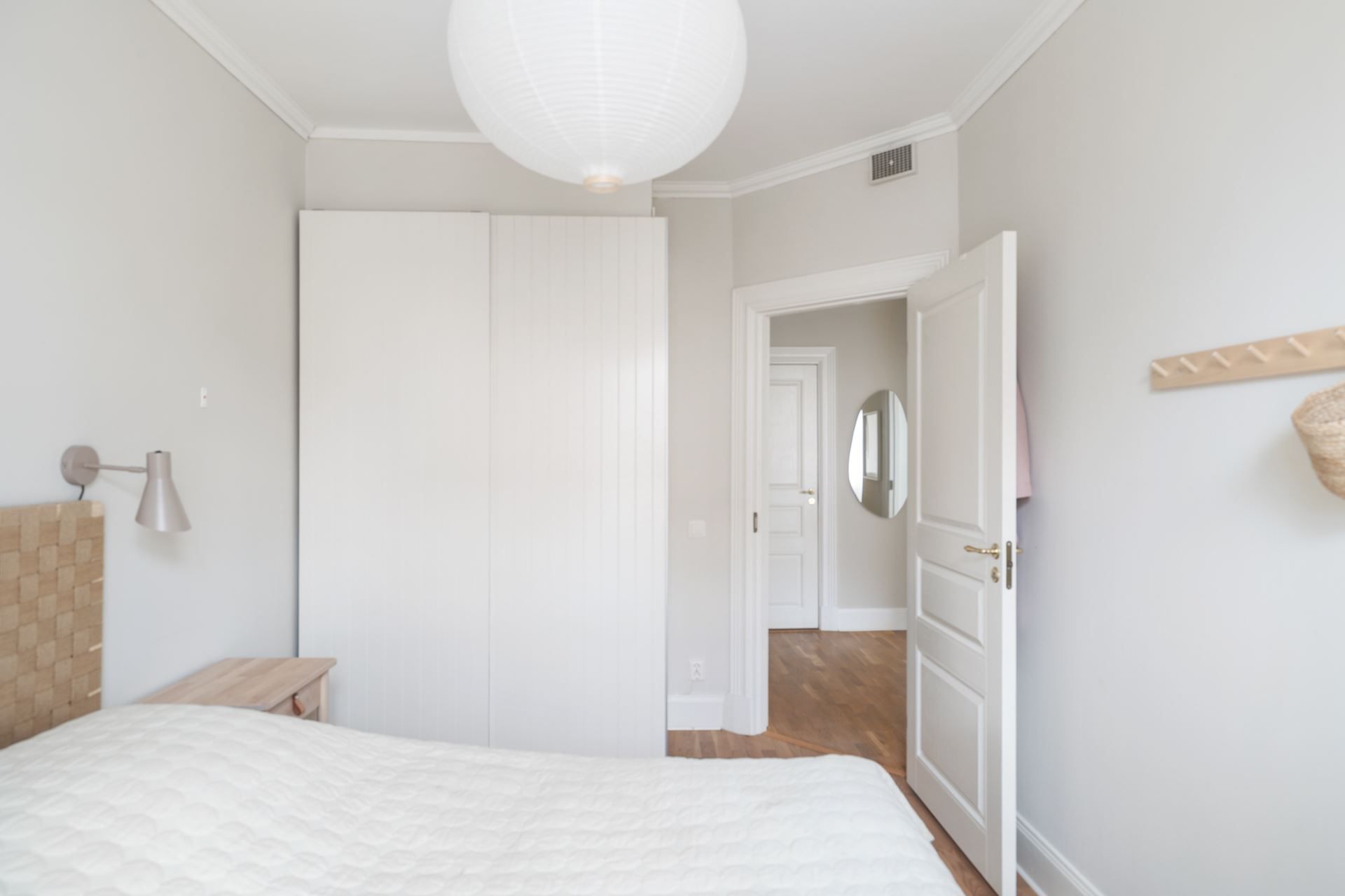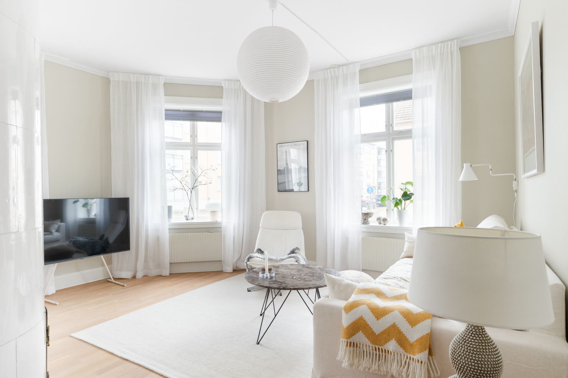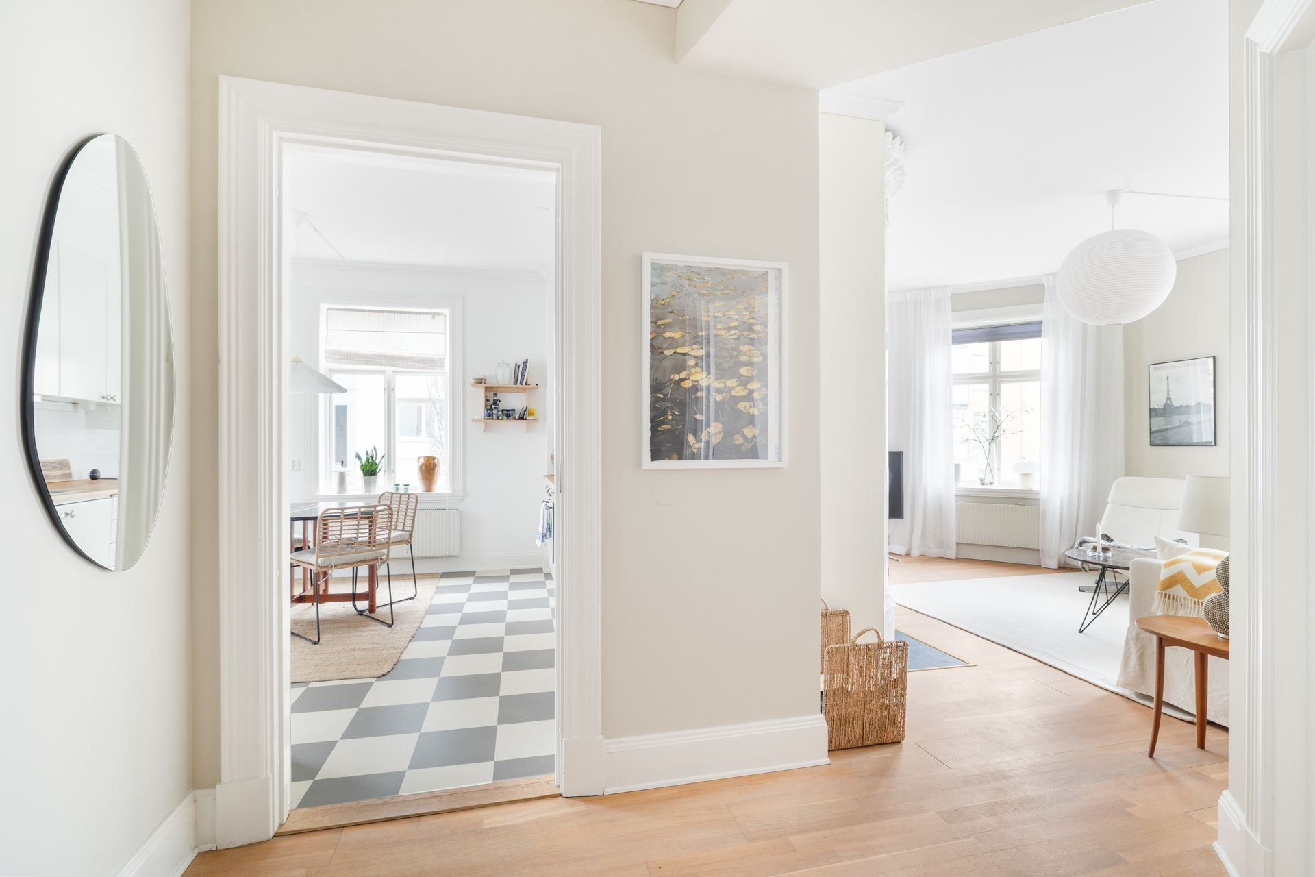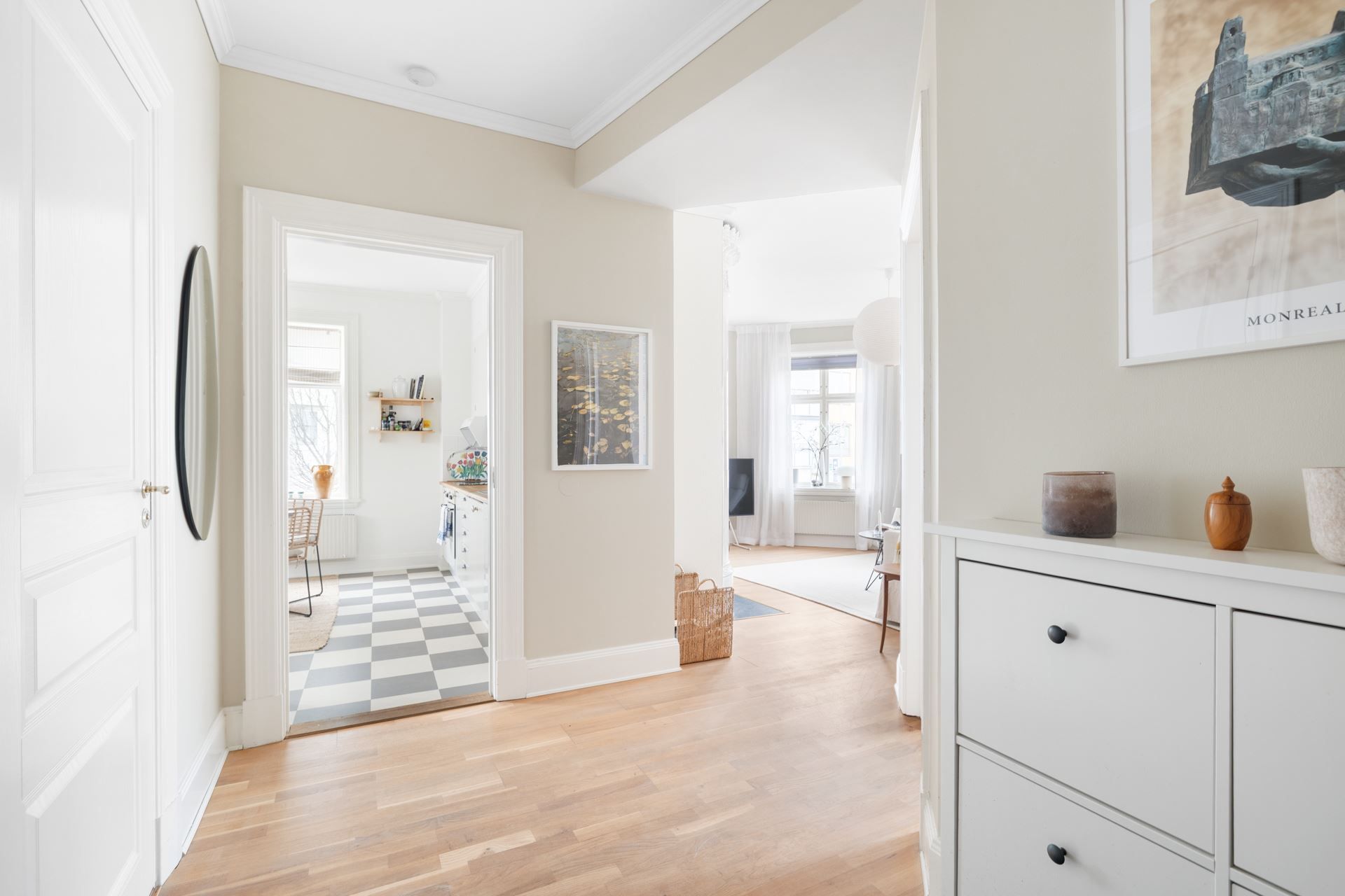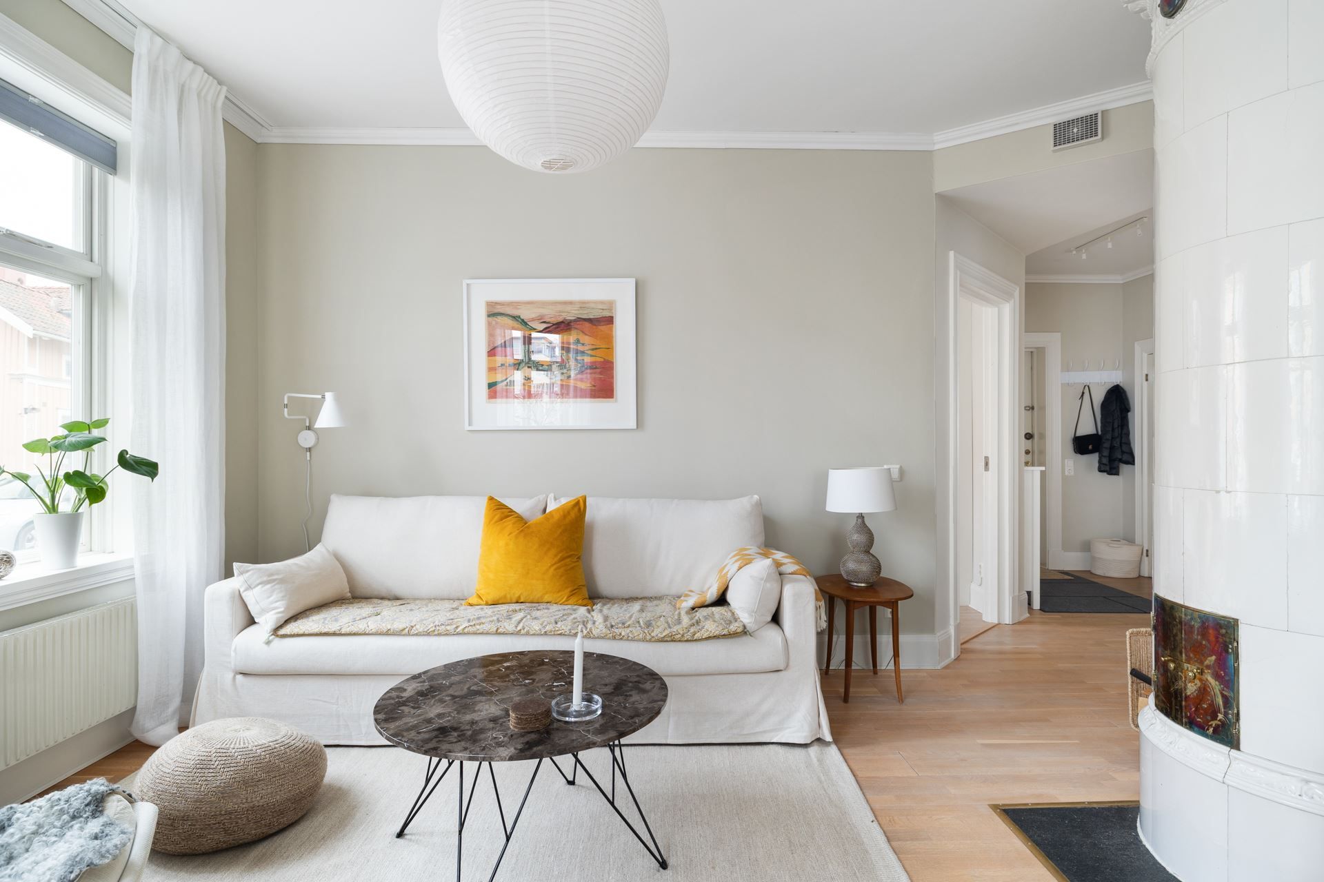 Lägenheten bjuder på en harmonisk kombination av tidstypisk karaktär och ljusa, stilrena ytskikt. Här möts du av generös takhöjd, stora spröjsade fönster och ett påtagligt ljusinsläpp.