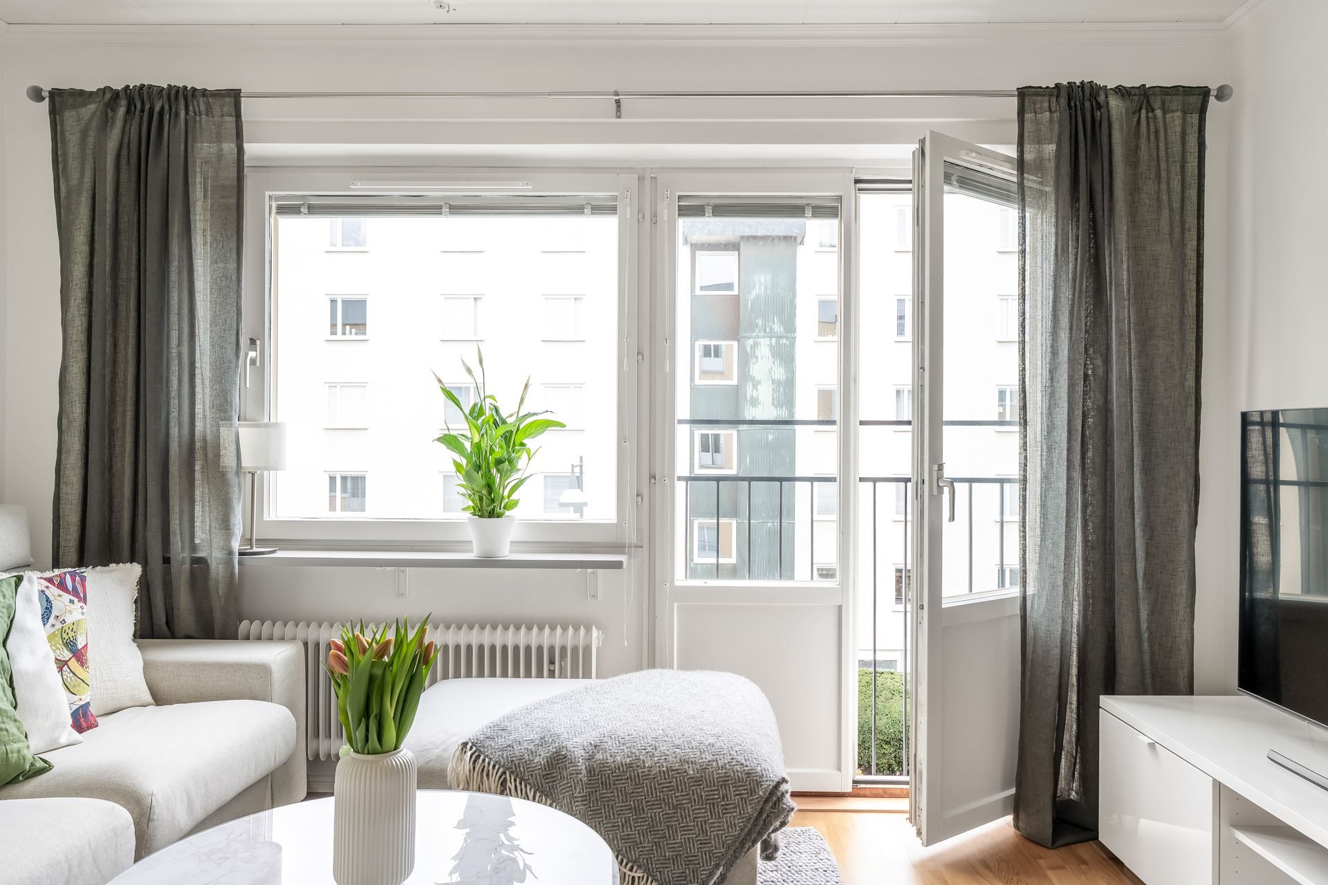 -Fransk balkong och stora fönsterpartier med rikligt ljusinsläpp